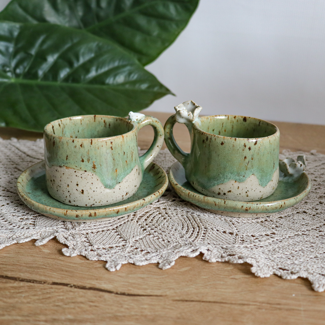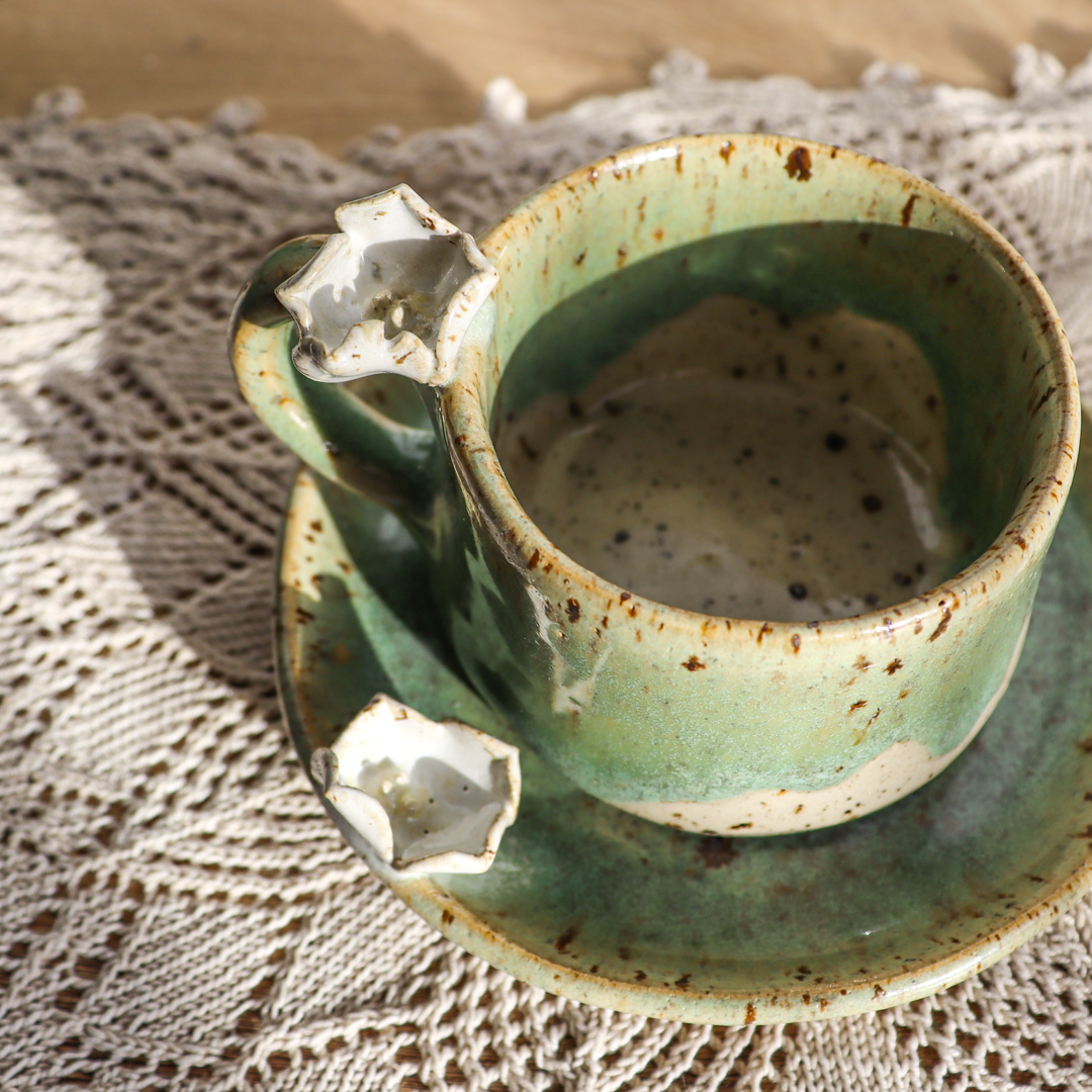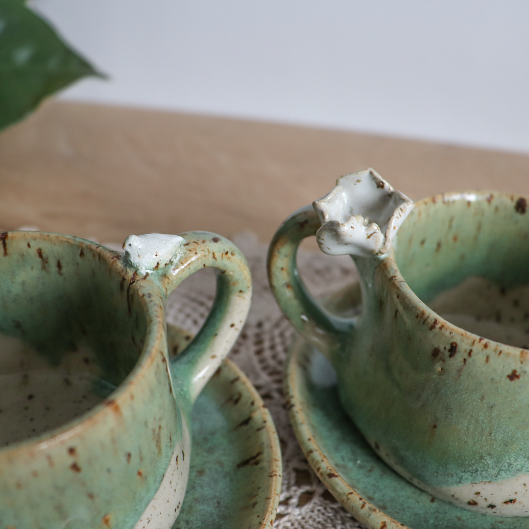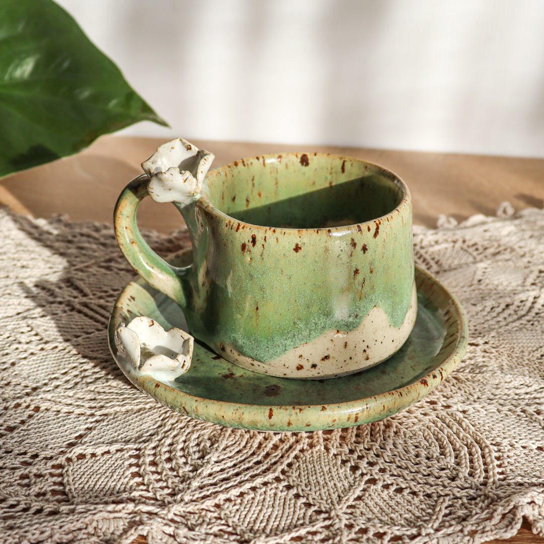 Stworzona dla małych przyjemności ceramiczna filiżanka ze spodkiem w komplecie o pojemności 130ml. Ręcznie wykonana z jasnobeżowej gliny, charakteryzującej się drobnymi brązowymi piegami. Pokryta na krawędzi, a także na spodeczku zielonym szkliwem. Ozdobiona uroczymi ceramicznymi kwiatkiem na uchu filiżanki oraz na spodeczku lub ptaszkiem siedzącym na uchu filiżanki.