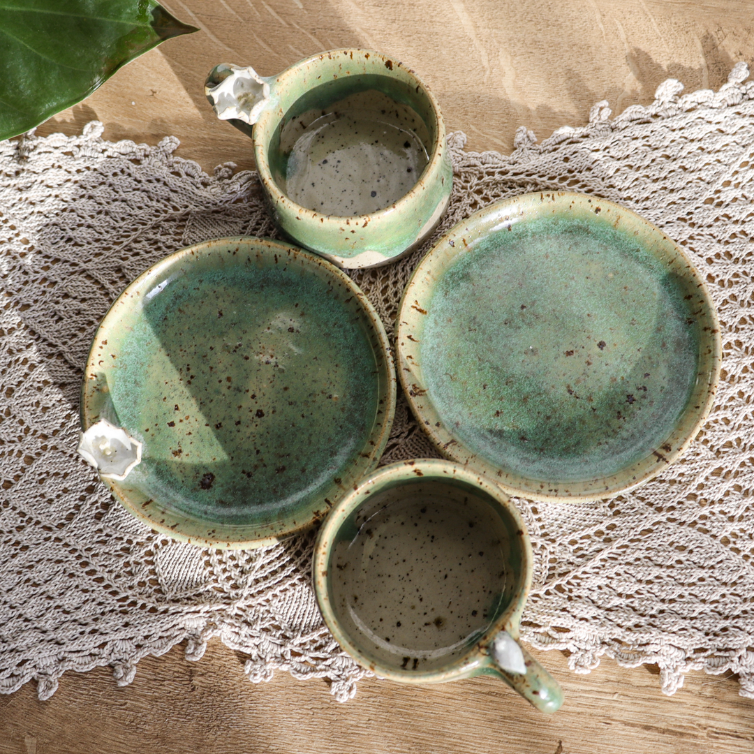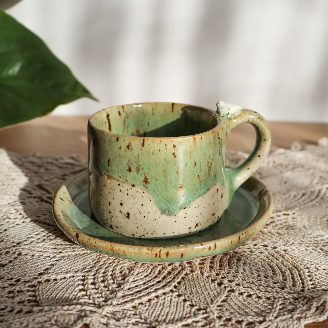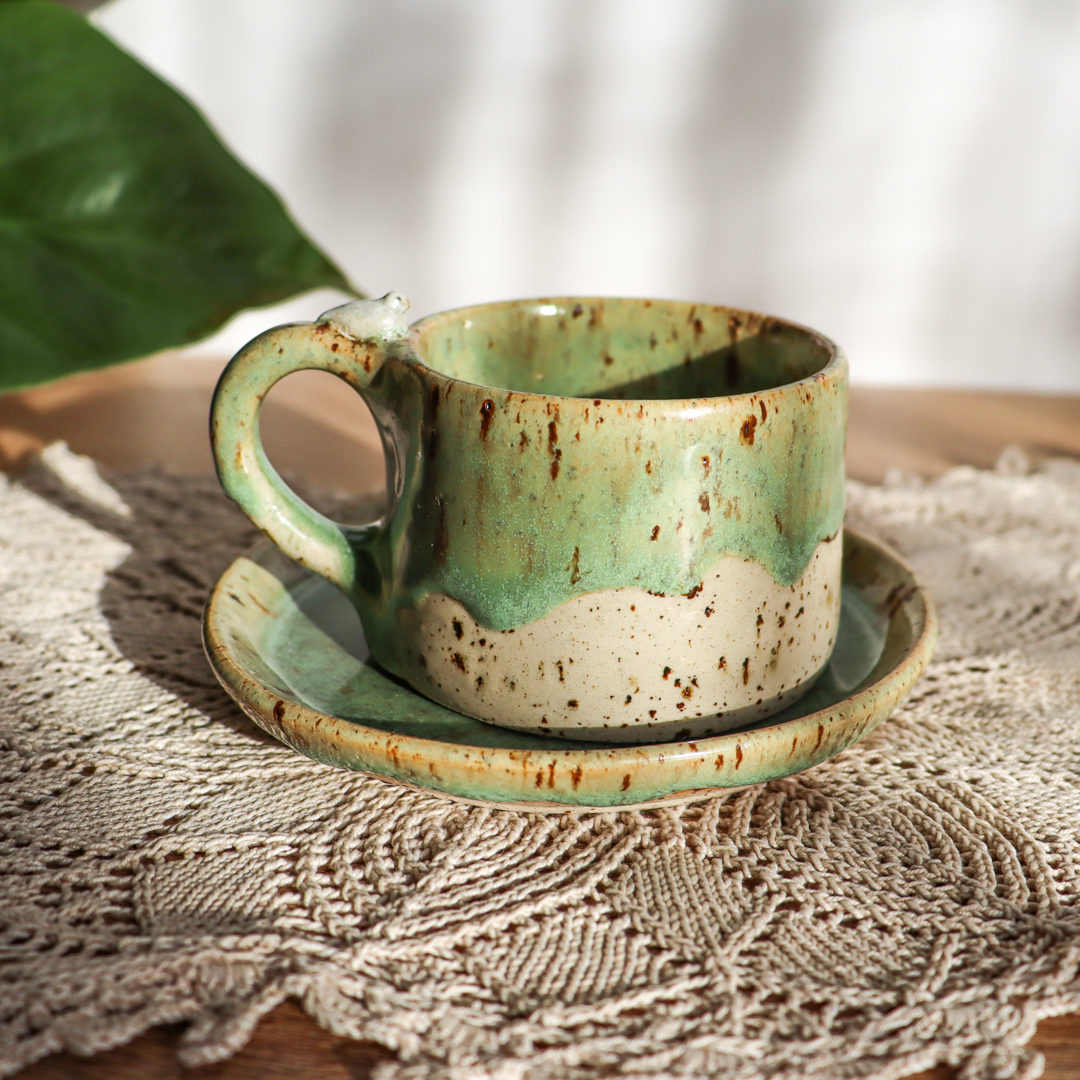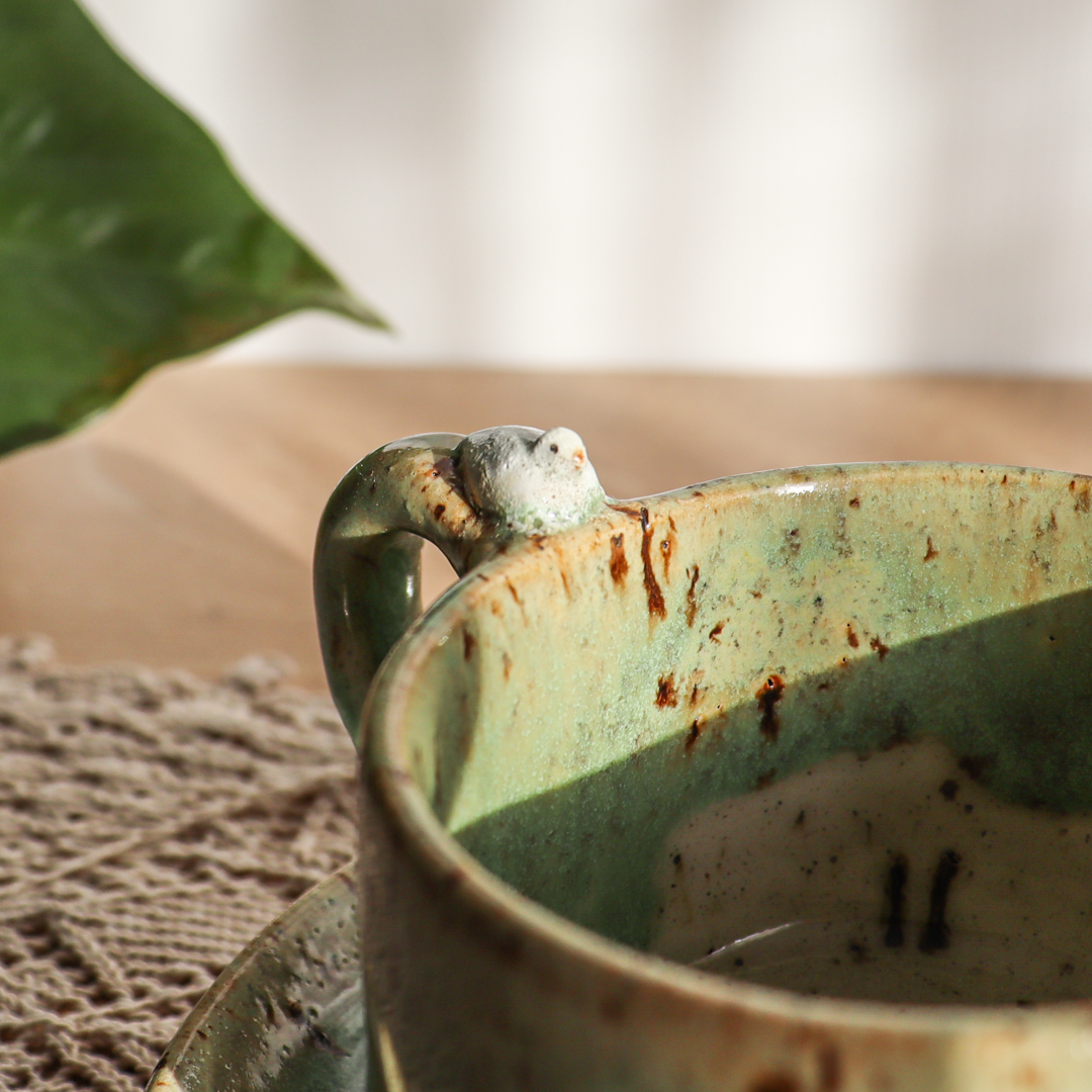 Stworzona dla małych przyjemności ceramiczna filiżanka ze spodkiem w komplecie o pojemności 130ml. Ręcznie wykonana z jasnobeżowej gliny, charakteryzującej się drobnymi brązowymi piegami. Pokryta na krawędzi, a także na spodeczku zielonym szkliwem. Ozdobiona uroczymi ceramicznymi kwiatkiem na uchu filiżanki oraz na spodeczku lub ptaszkiem siedzącym na uchu filiżanki.