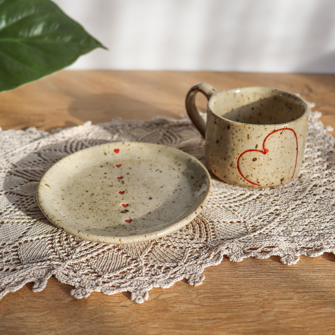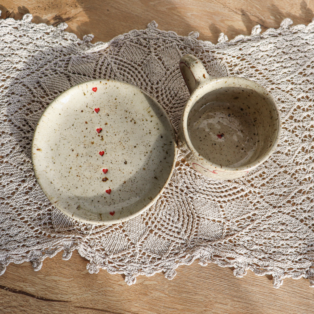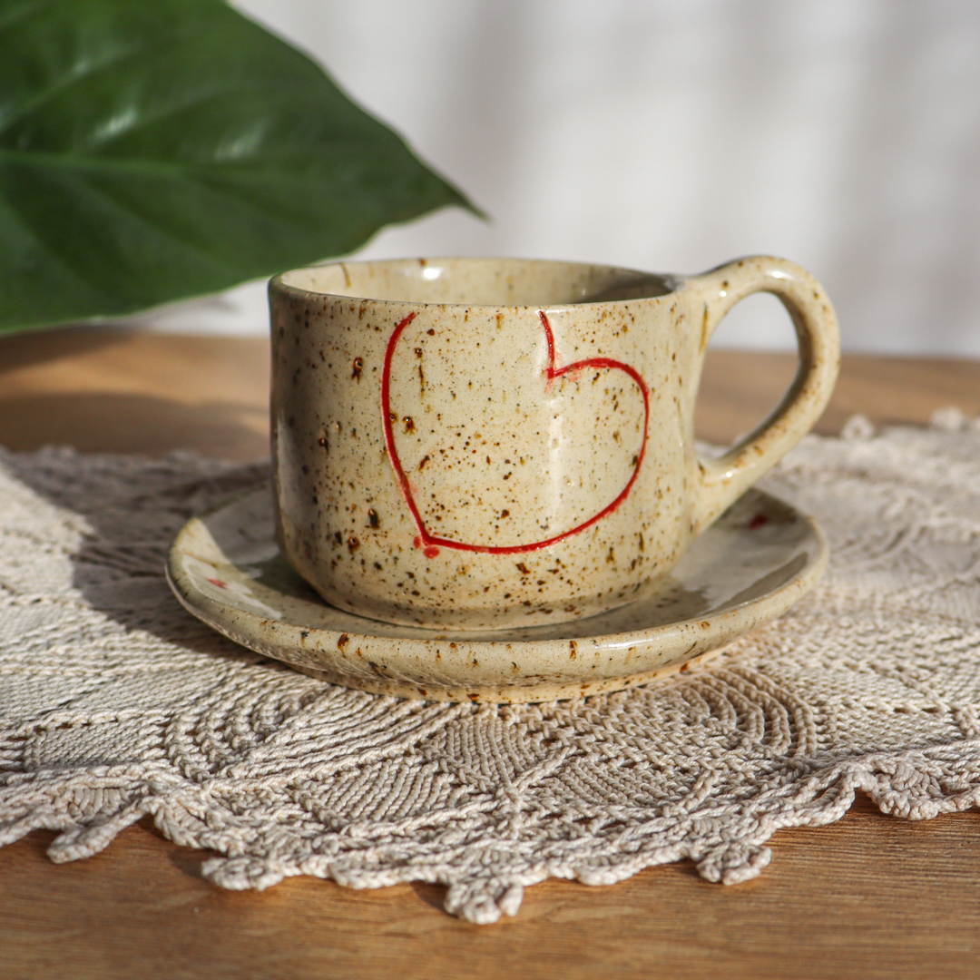 Stworzona dla małych przyjemności ceramiczna filiżanka ze spodkiem w komplecie o pojemności 130ml. Ręcznie wykonana z jasnobeżowej gliny, charakteryzującej się drobnymi brązowymi piegami. Ozdobiona konturami serc na powierzchni oraz uroczymi małymi serduszkami na spodeczku.