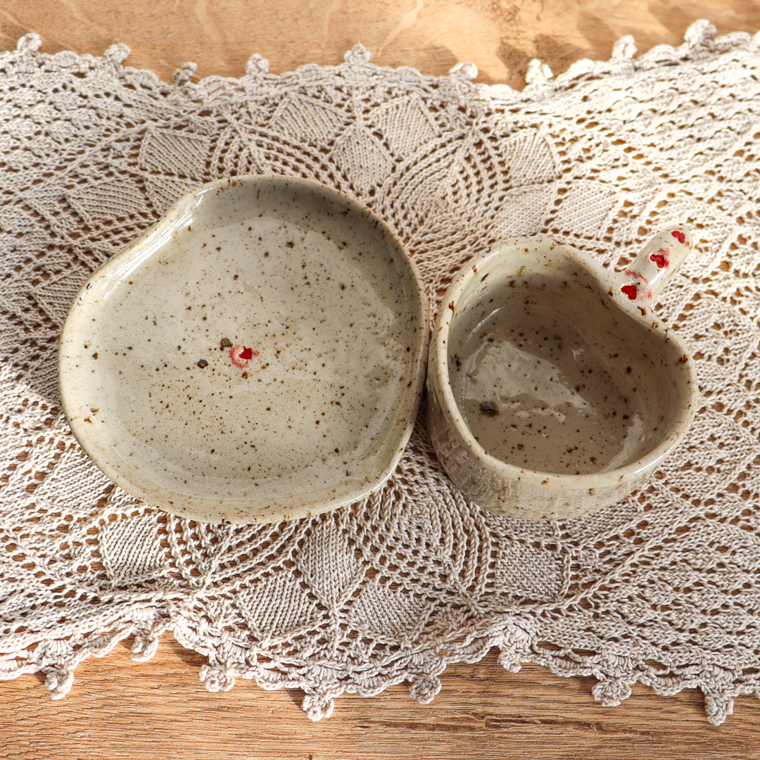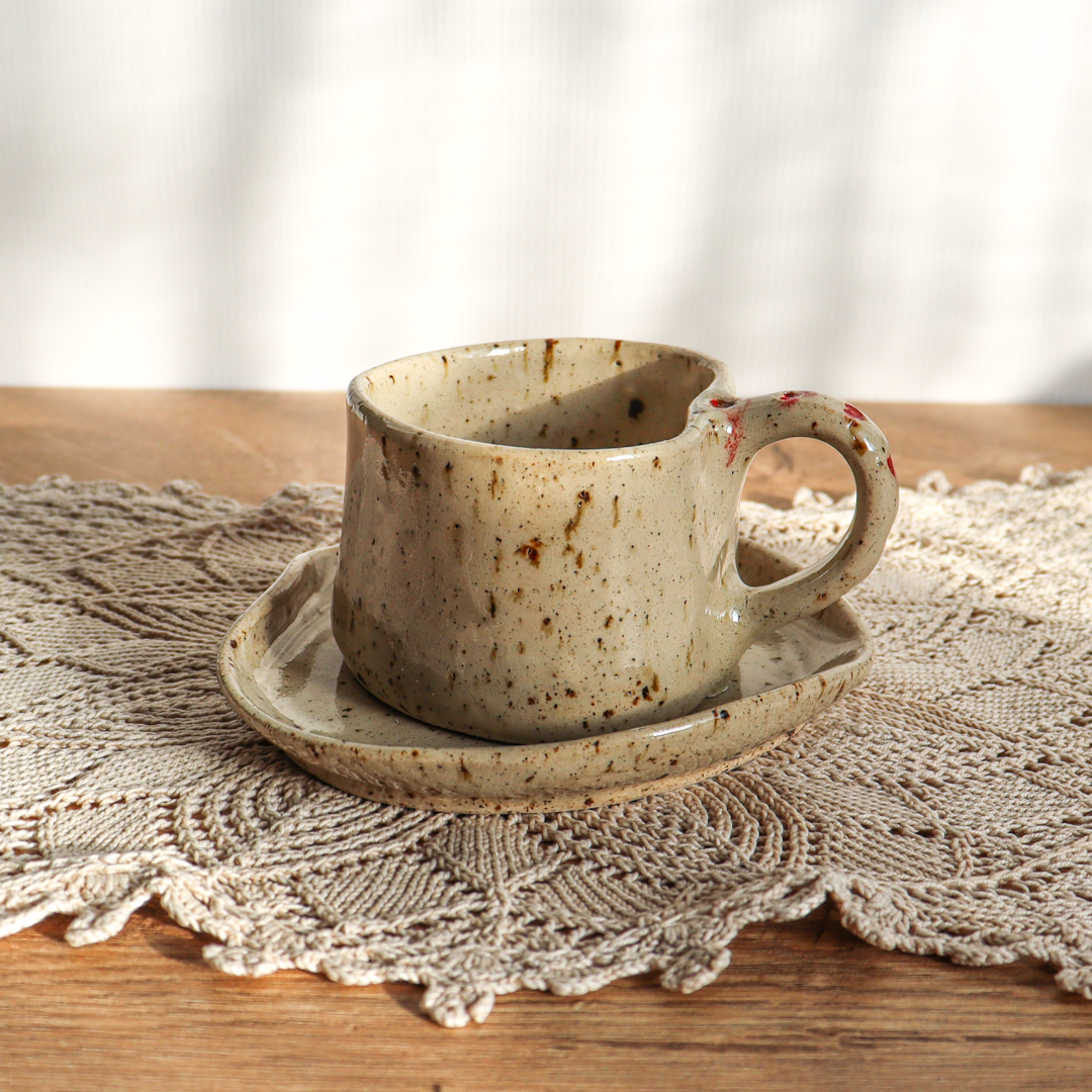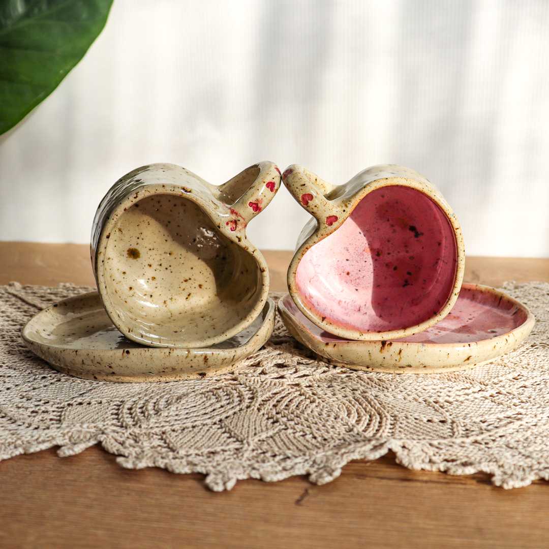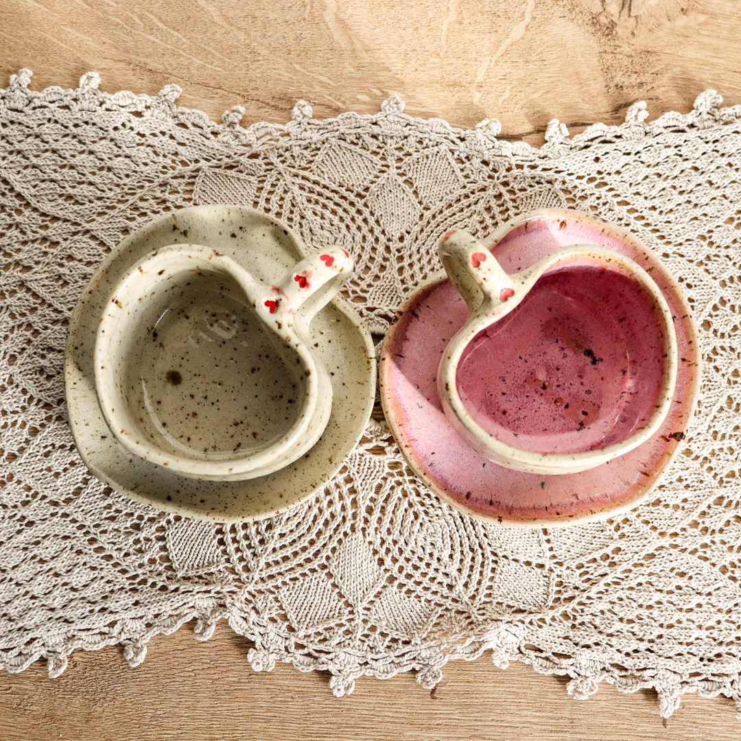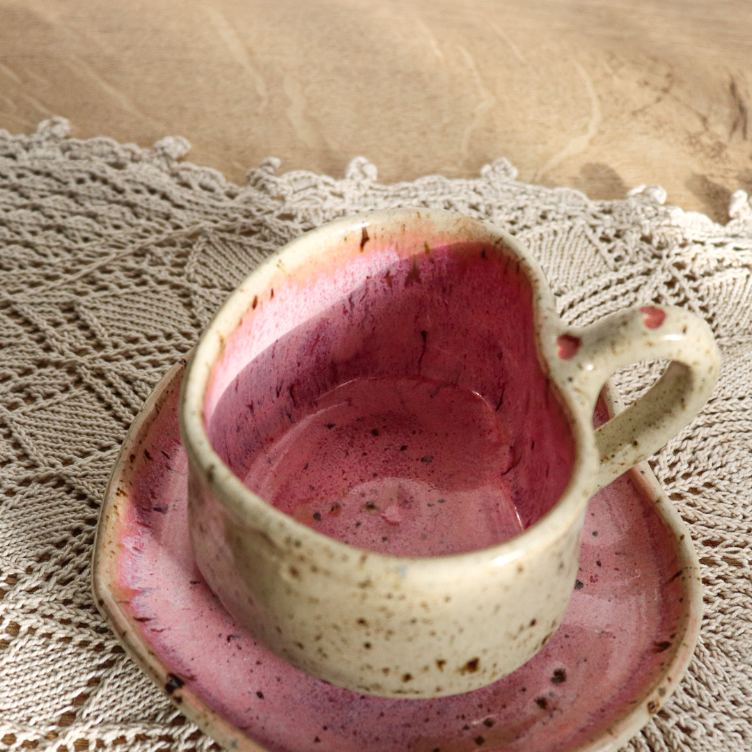 Stworzona dla małych przyjemności ceramiczna filiżanka ze spodkiem w komplecie o pojemności 130ml. Ręcznie wykonana z jasnobeżowej gliny, charakteryzującej się drobnymi brązowymi piegami. Zarówno filiżanka jak i spodek zostały uformowane na kształt serca nadający im uroczy i oryginalny wygląd. Ozdobiona małymi różowymi lub czerwonymi serduszkami na uchu i na spodeczku.
