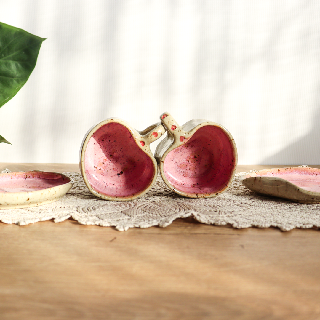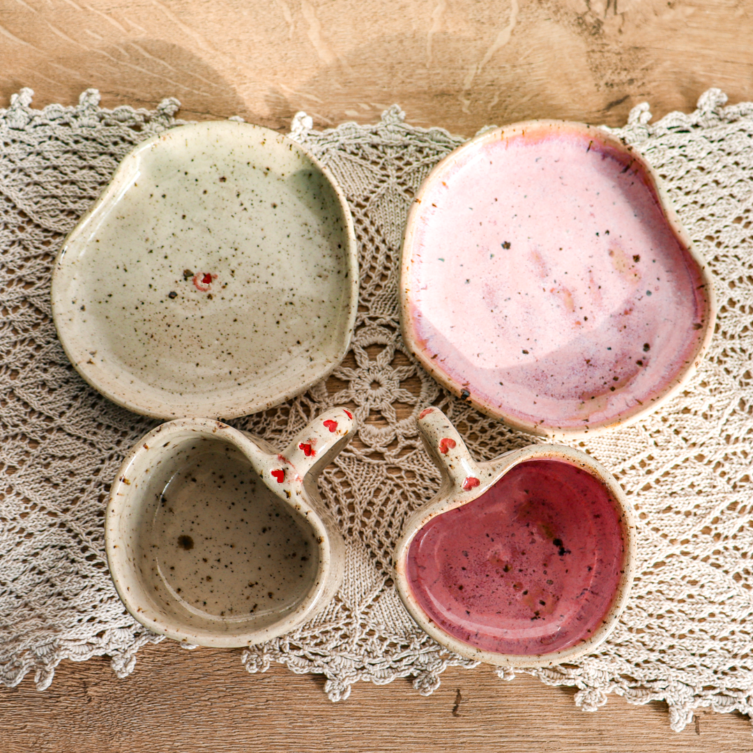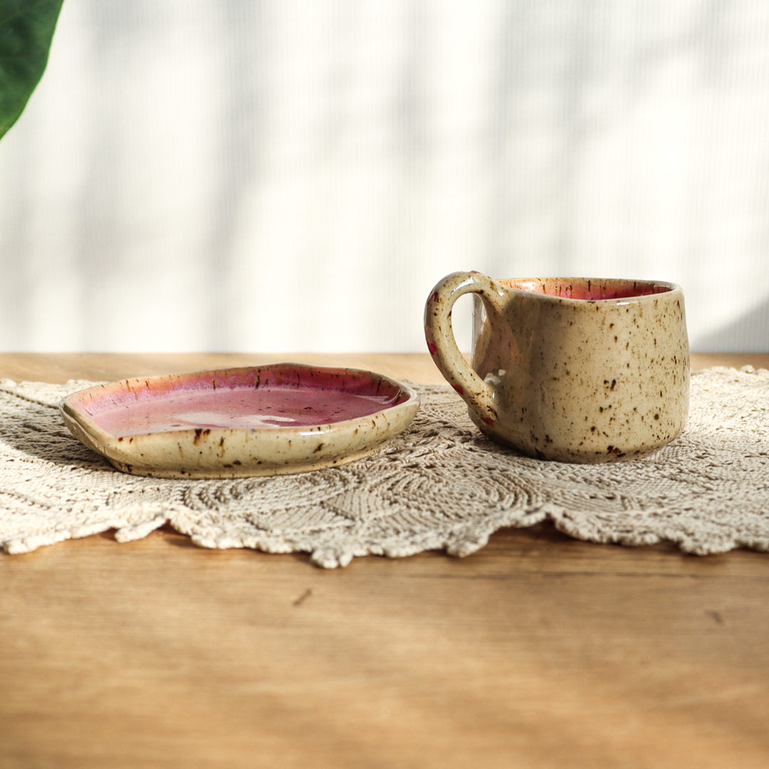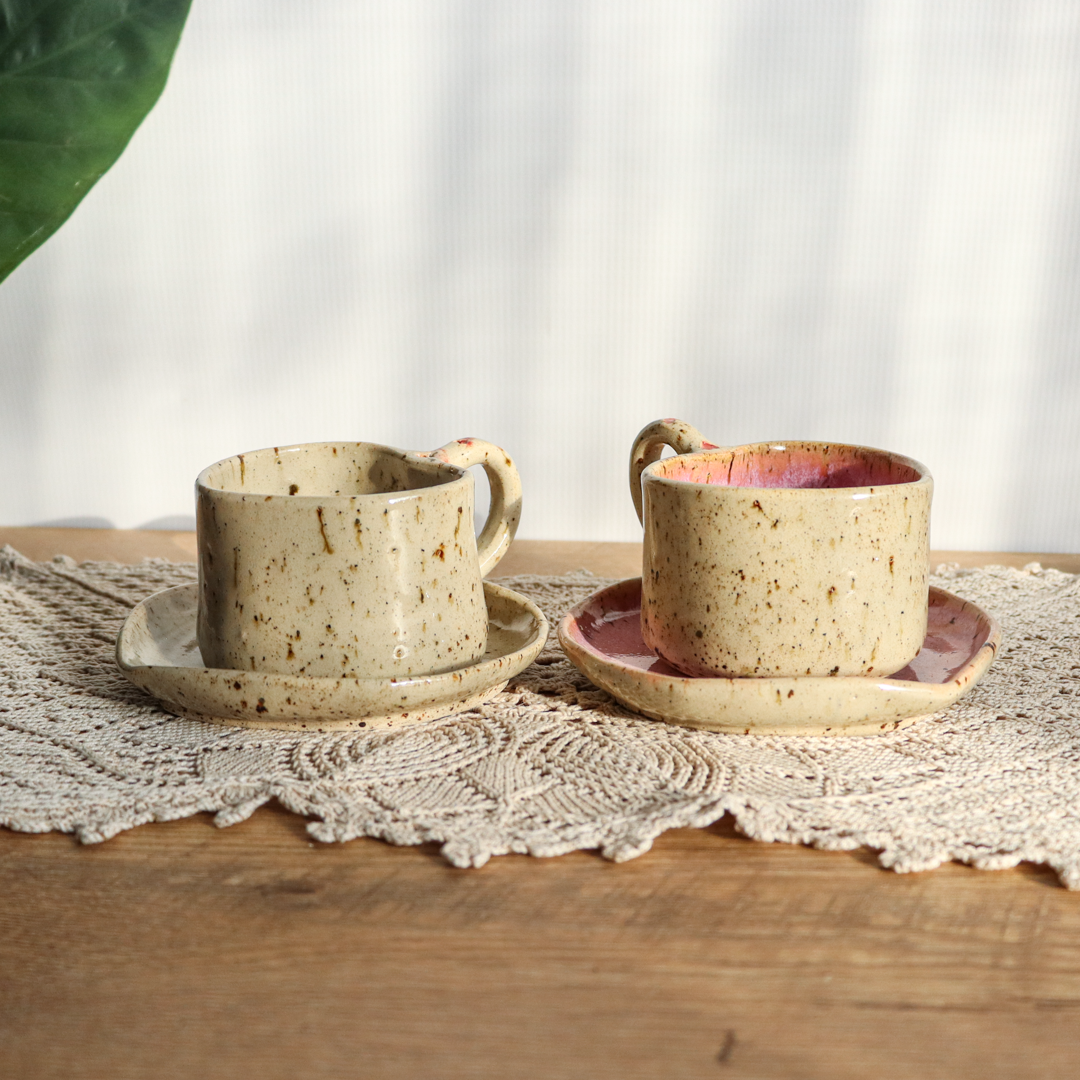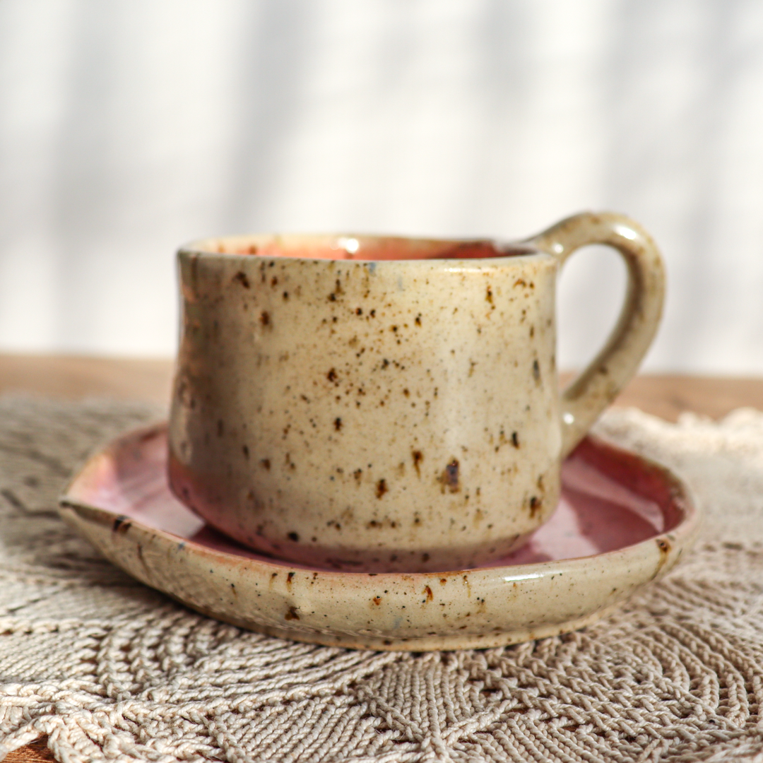 Stworzona dla małych przyjemności ceramiczna filiżanka ze spodkiem w komplecie o pojemności 130ml. Ręcznie wykonana z jasnobeżowej gliny, charakteryzującej się drobnymi brązowymi piegami. Zarówno filiżanka jak i spodek zostały uformowane na kształt serca nadający im uroczy i oryginalny wygląd. Ozdobiona małymi różowymi lub czerwonymi serduszkami na uchu i na spodeczku.