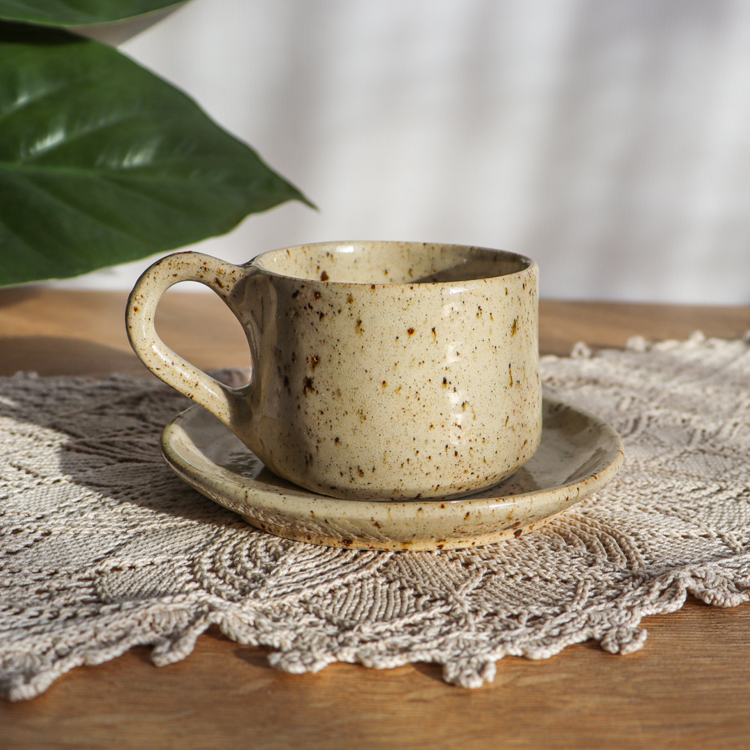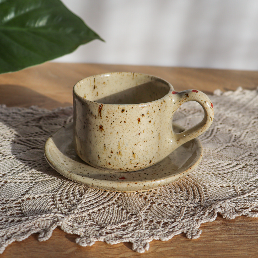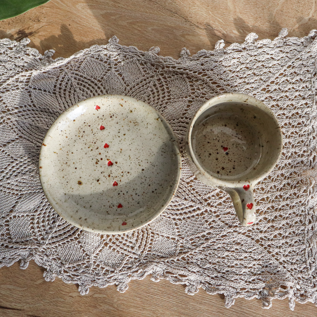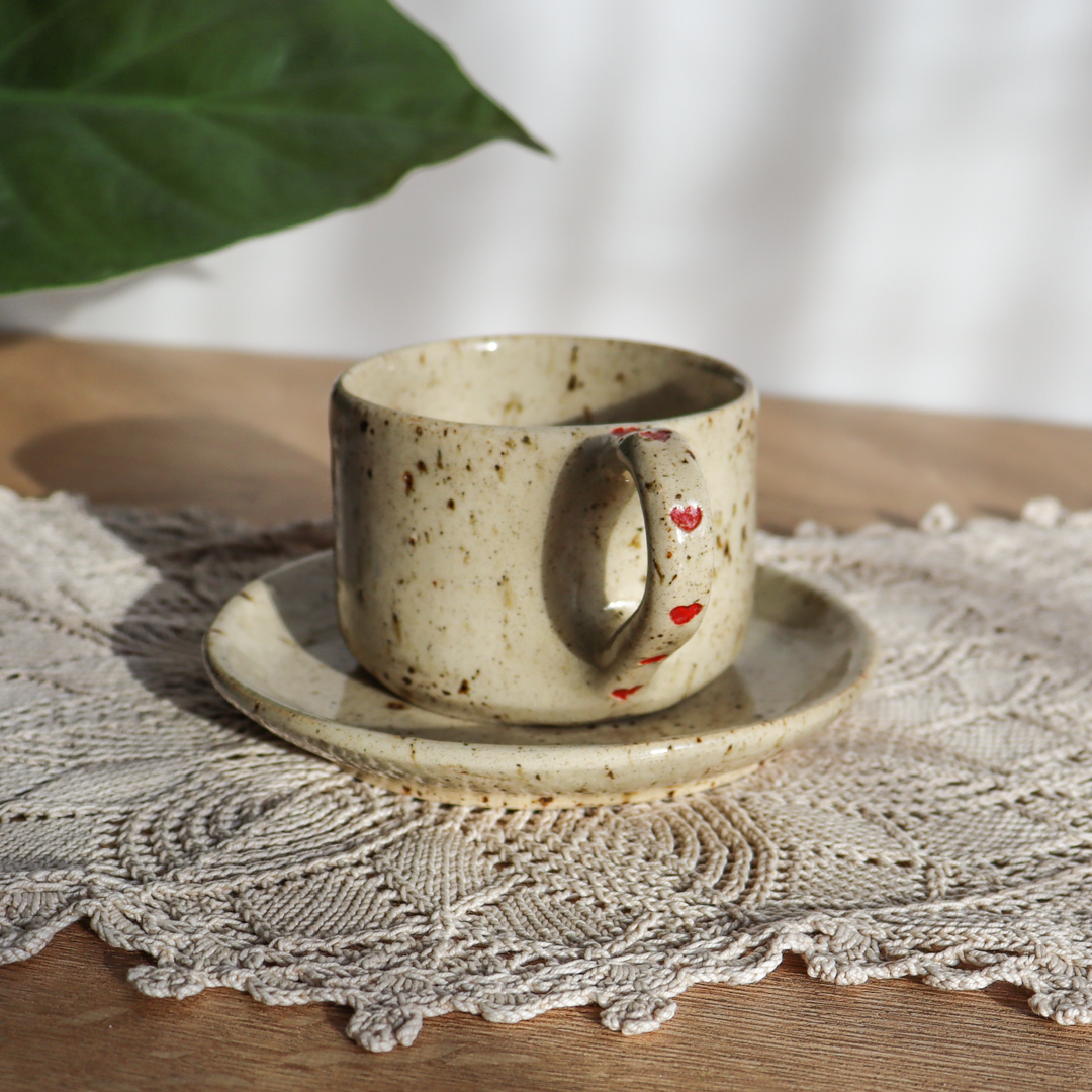 Stworzona dla małych przyjemności ceramiczna filiżanka ze spodkiem w komplecie o pojemności 130ml. Ręcznie wykonana z jasnobeżowej gliny, charakteryzującej się drobnymi brązowymi piegami. Ozdobiona uroczymi małymi serduszkami na uchu oraz na spodeczku.