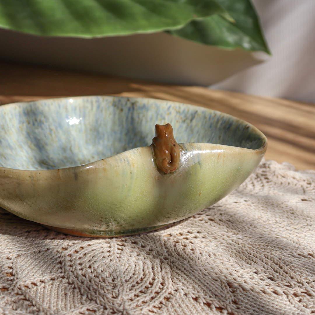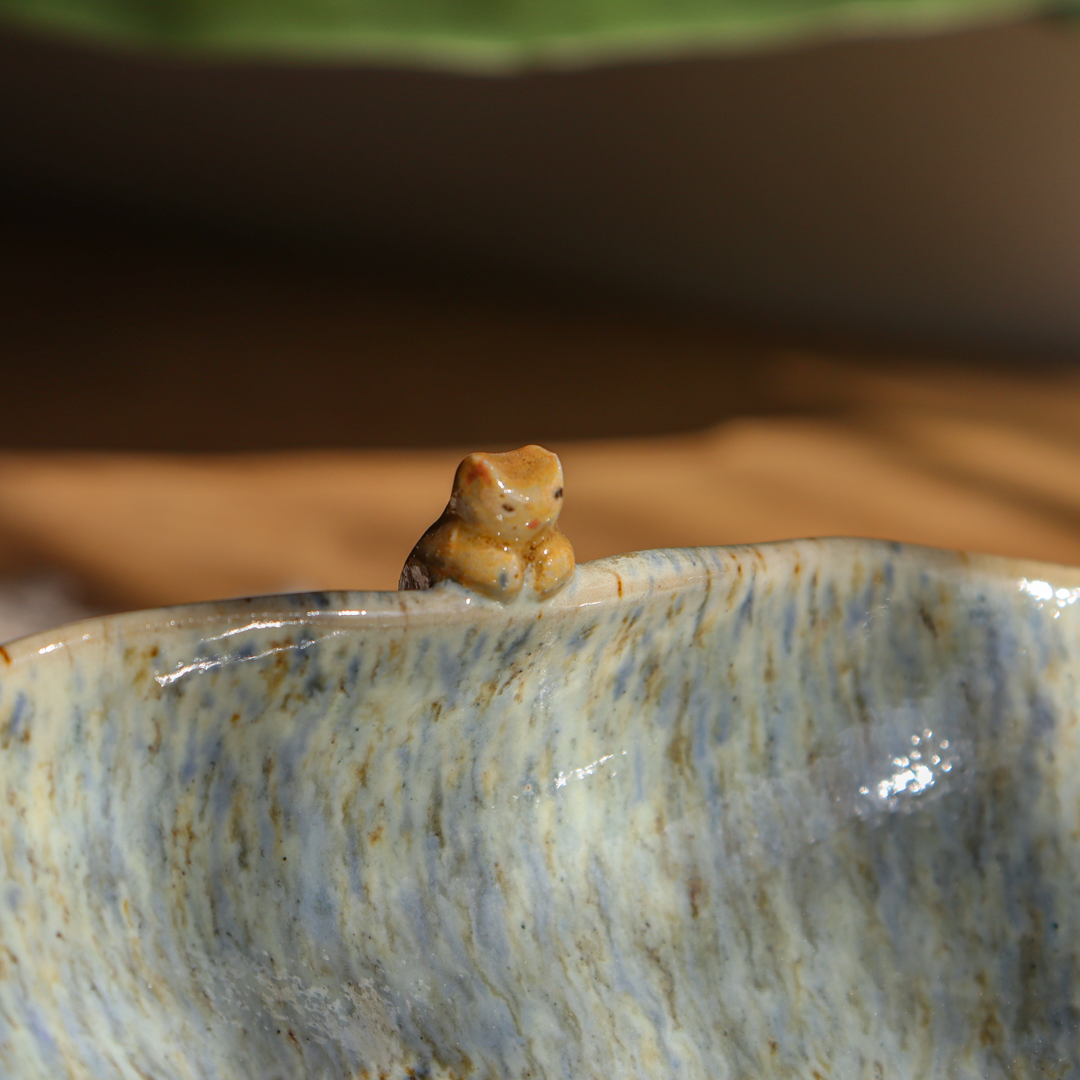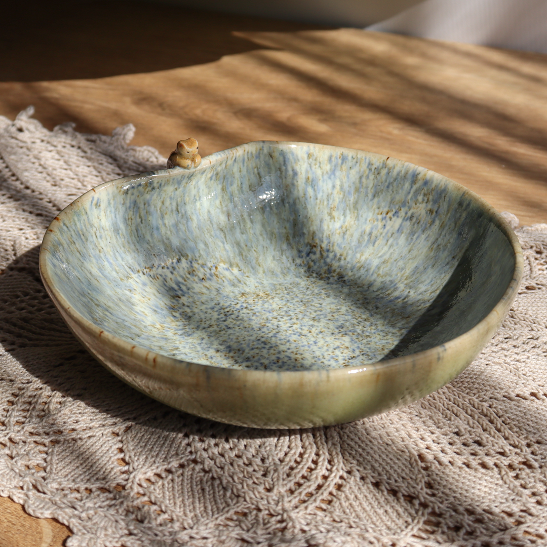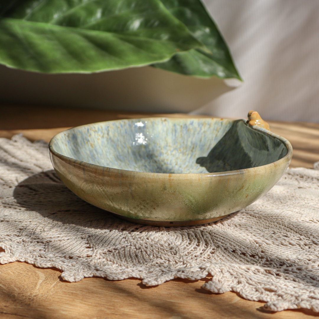 Ręcznie wykonana ceramiczna miseczka – Kotek o pojemności 250 ml. Pokryta na ściankach beżowo-zieloną mieszanką szkliwa oraz w środku białym szkliwem z wielobarwnymi drobinkami tworzącymi ciekawy efekt i ozdobiona wspinającym się na jej wygięty brzeg uroczym kotkiem. Miska ma średnicę 14 cm i wysokość 4 cm.