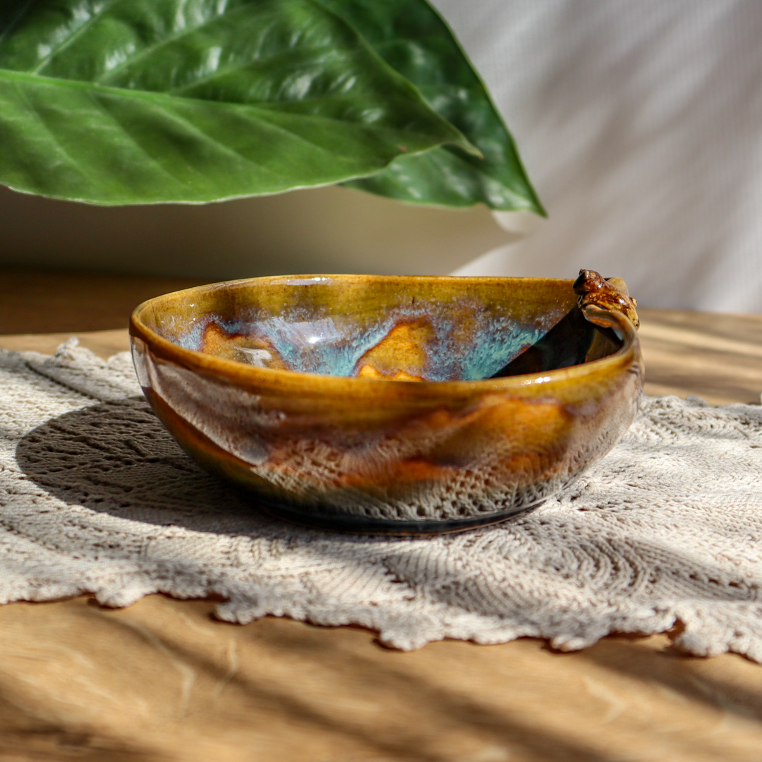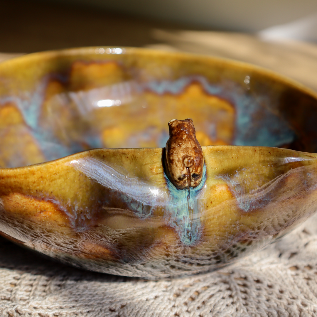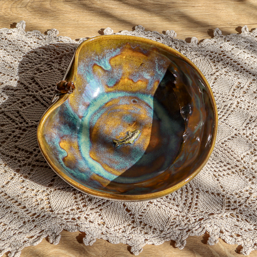 Ręcznie wykonana ceramiczna miska – Miś z rybką o pojemności 450 ml. Ozdobiona wspinającym się na jej wygięty brzeg uroczym niedźwiadkiem patrzącym na pływającą na dnie rybkę i pokryta  mieszanką brązowego i zielono-niebieskiego szkliwa. Miska ma średnicę 15,5 cm i wysokość 5 cm.