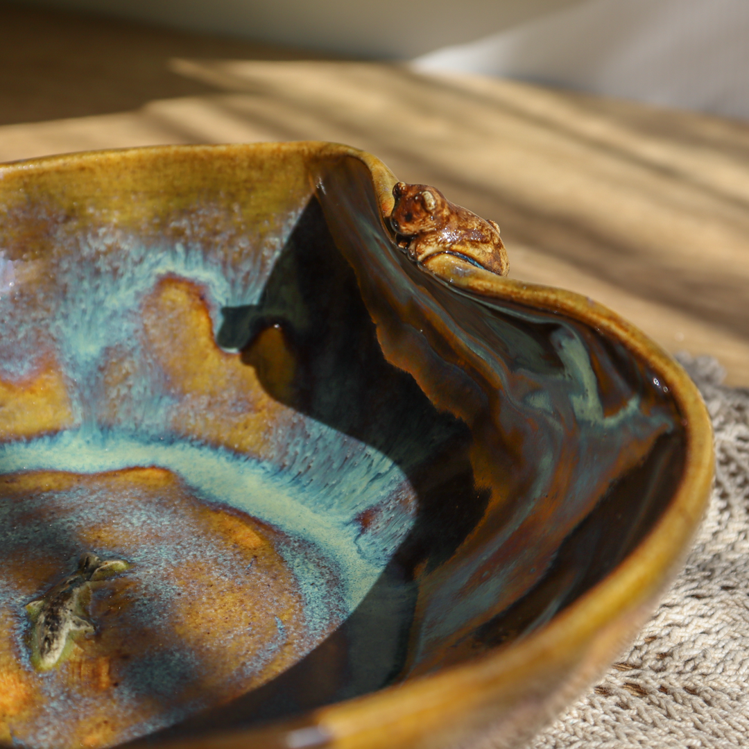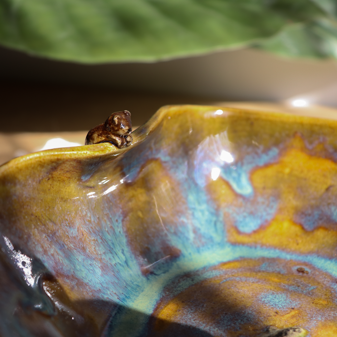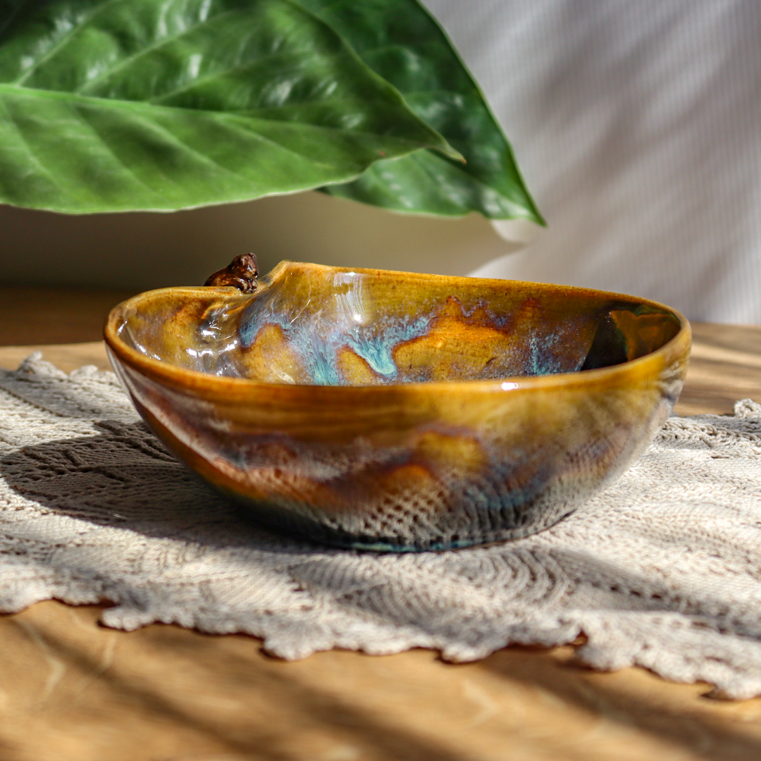 Ręcznie wykonana ceramiczna miska – Miś z rybką o pojemności 450 ml. Ozdobiona wspinającym się na jej wygięty brzeg uroczym niedźwiadkiem patrzącym na pływającą na dnie rybkę i pokryta  mieszanką brązowego i zielono-niebieskiego szkliwa. Miska ma średnicę 15,5 cm i wysokość 5 cm.