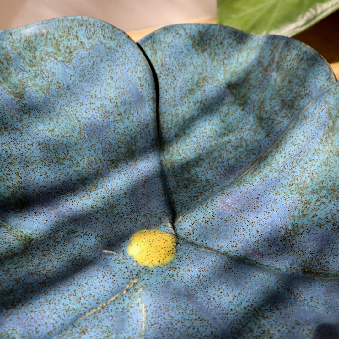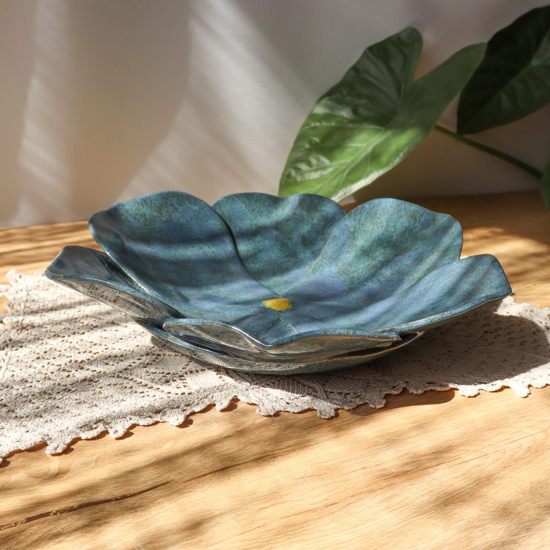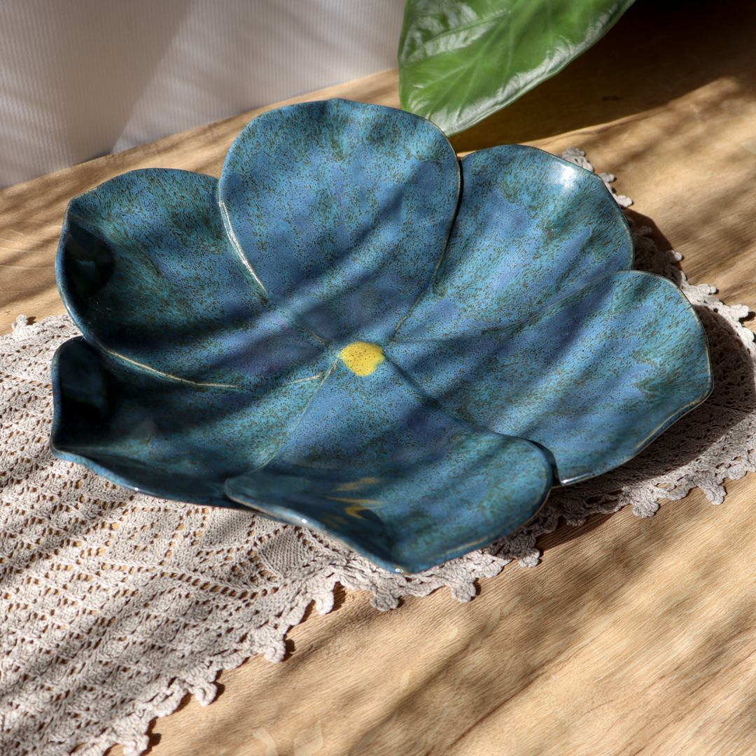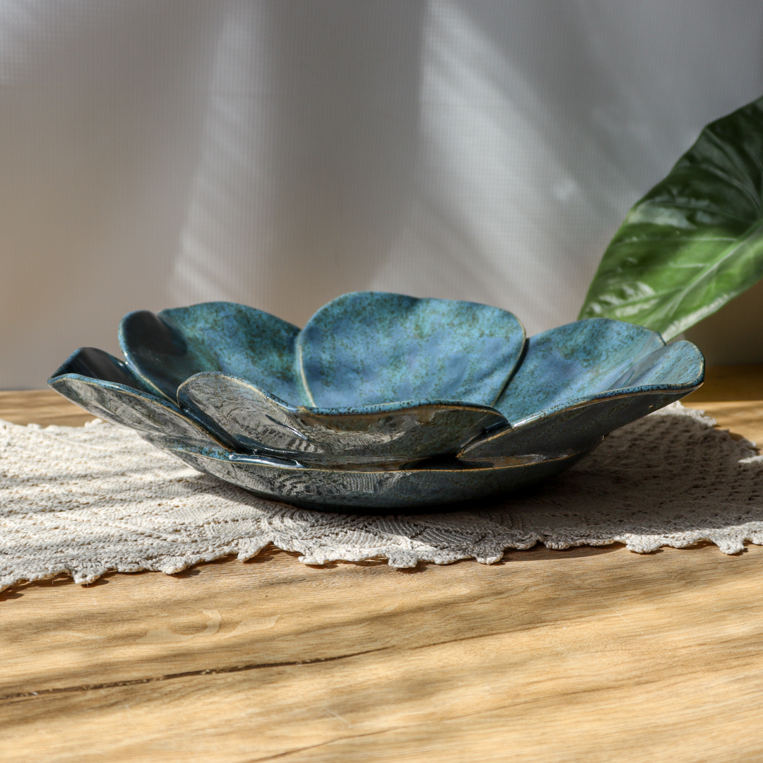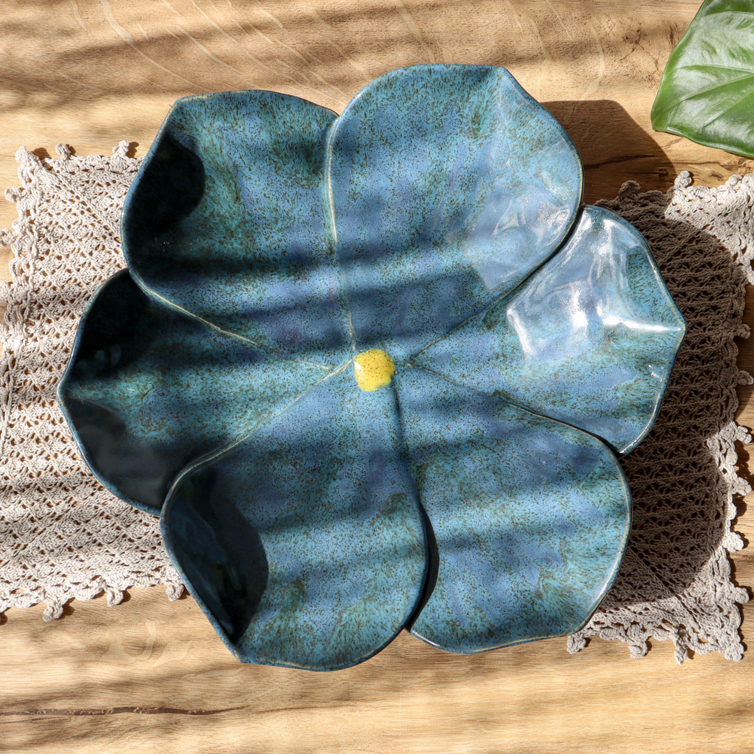 Ręcznie wykonana na kształt kwiatu ceramiczna patera o średnicy 31 cm i wysokości 7 cm. Jej powierzchnię tworzy sześć dużych płatków pokrytych niebieskim szkliwem z ciemnymi brązowymi i zielonymi drobinami, połączonych w centrum żółtym środkiem. Naturalny kształt i piękne kolory sprawiają, że jest ona oryginalną ozdobą każdego stołu.