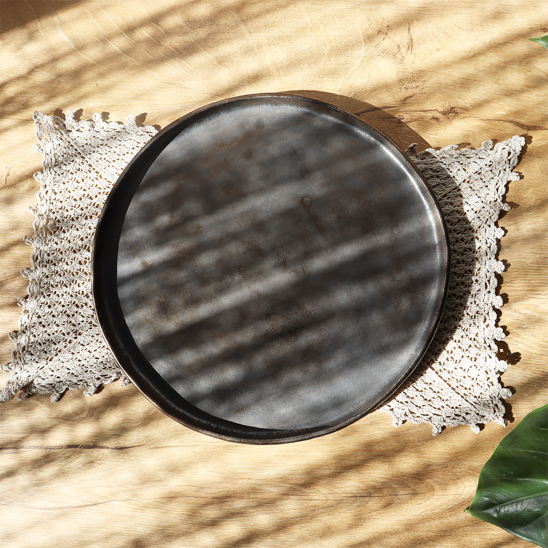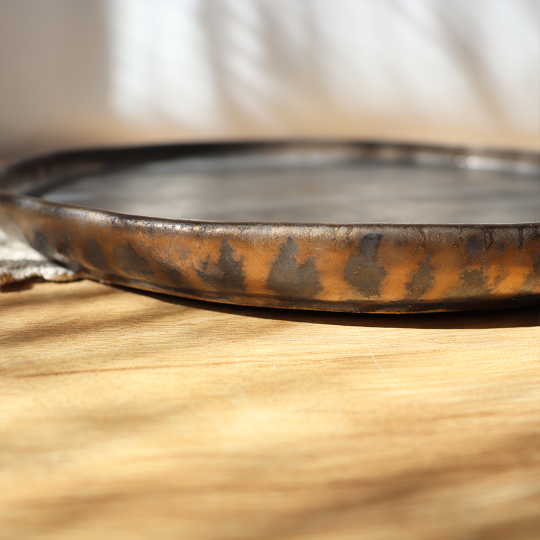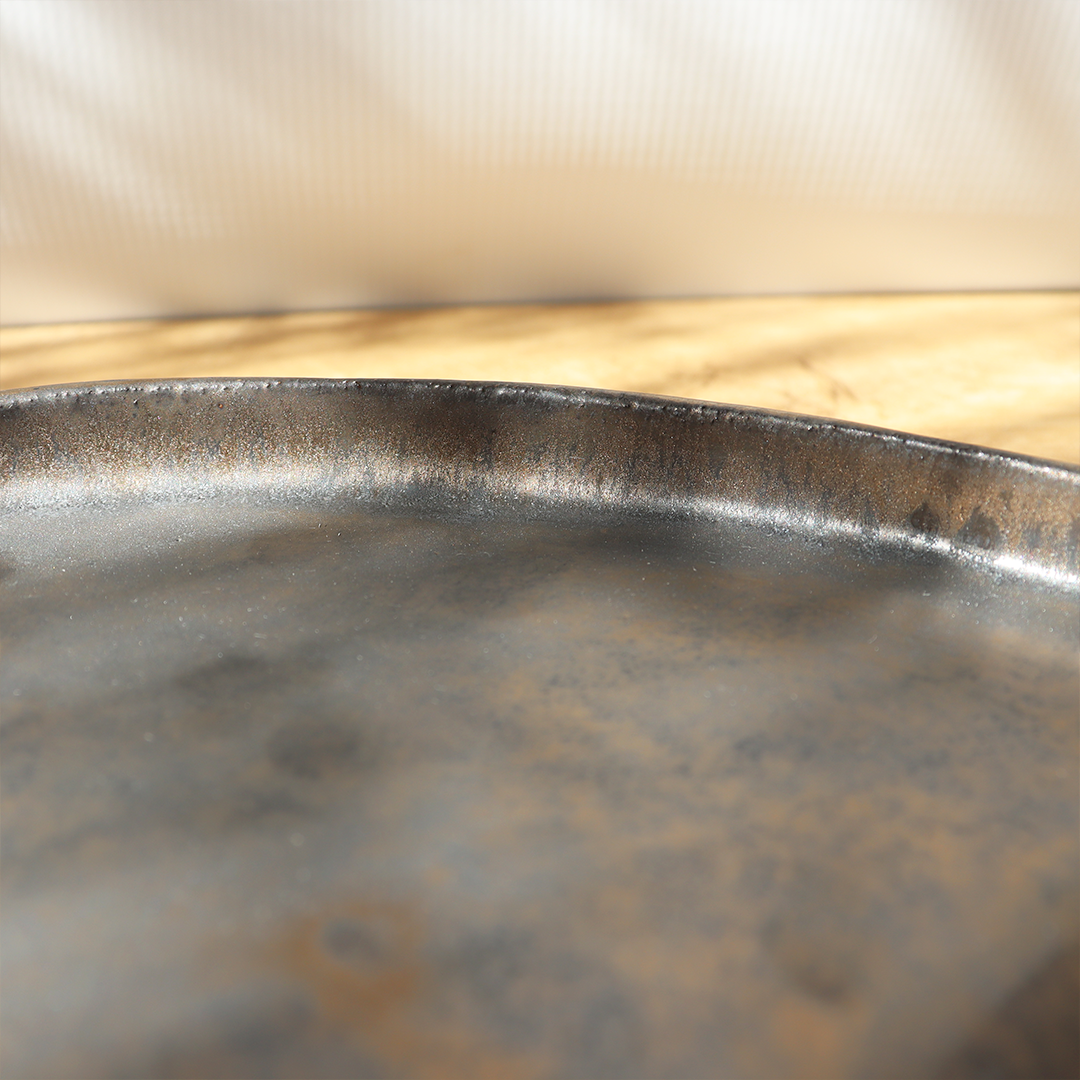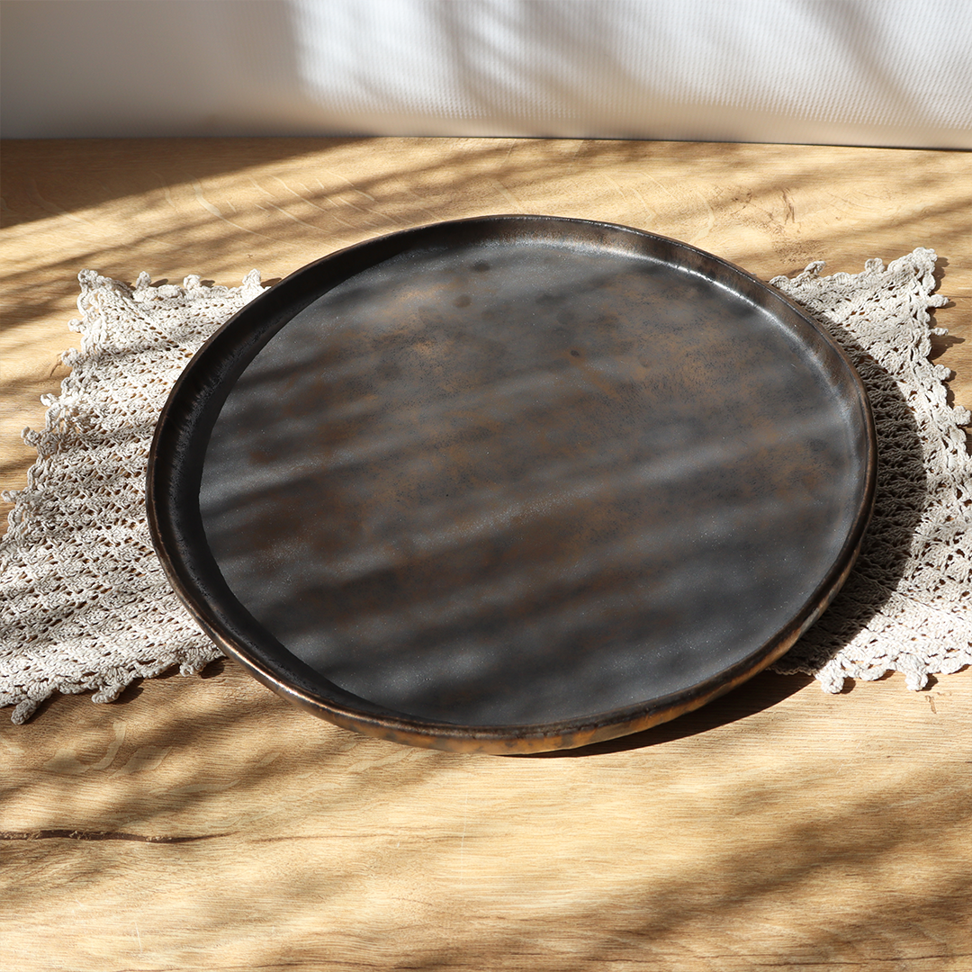 Ręcznie wykonana ceramiczna taca o średnicy 30 cm i wysokości 2 cm. Ta wyjątkowa ceramiczna taca/patera łączy w sobie estetykę i funkcjonalność, tworząc idealne rozwiązanie do serwowania potraw, deserów oraz napojów. Taca pokryta została metalicznym złotobrązowym szkliwem nadającym jej oryginalny surowy wygląd.