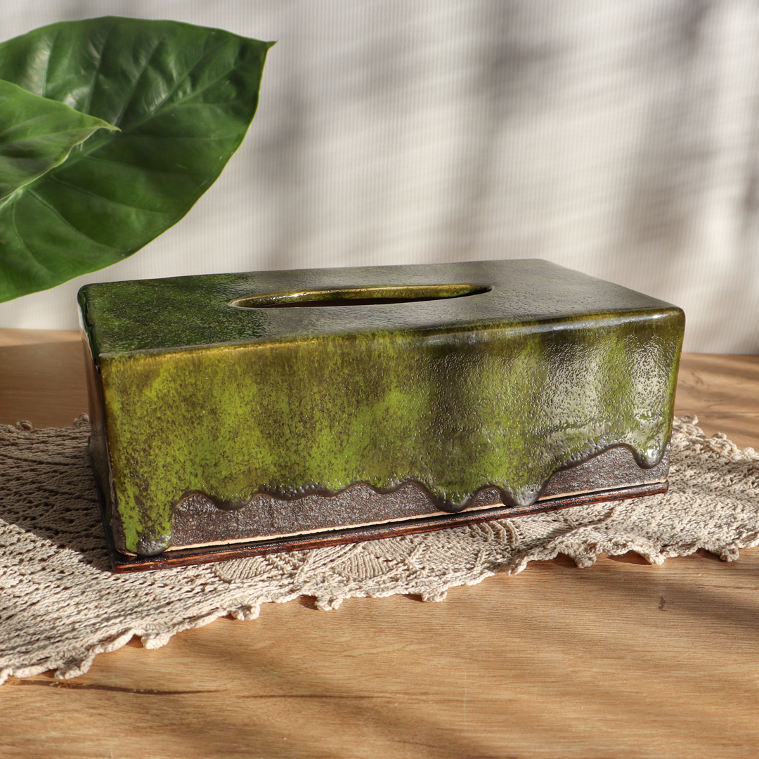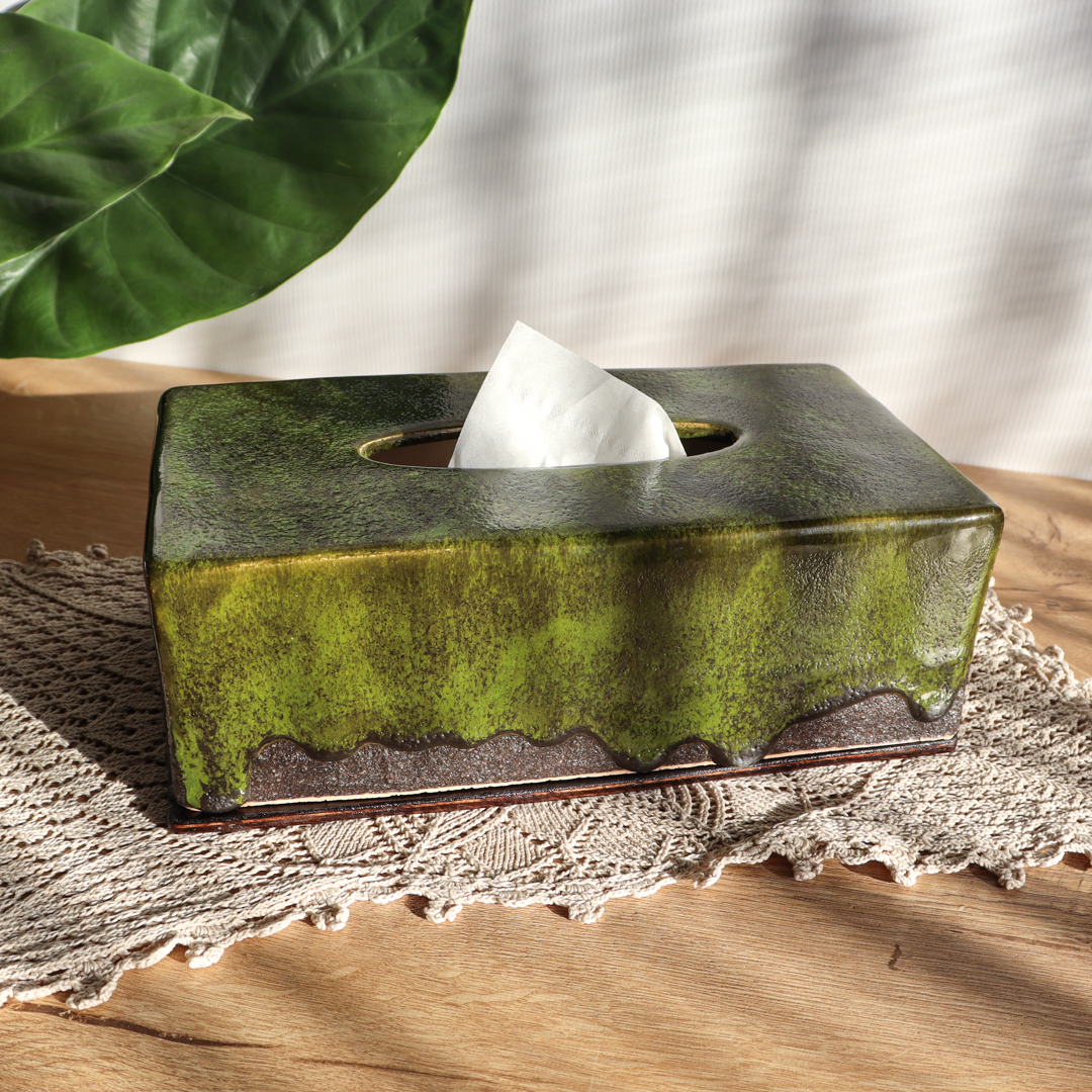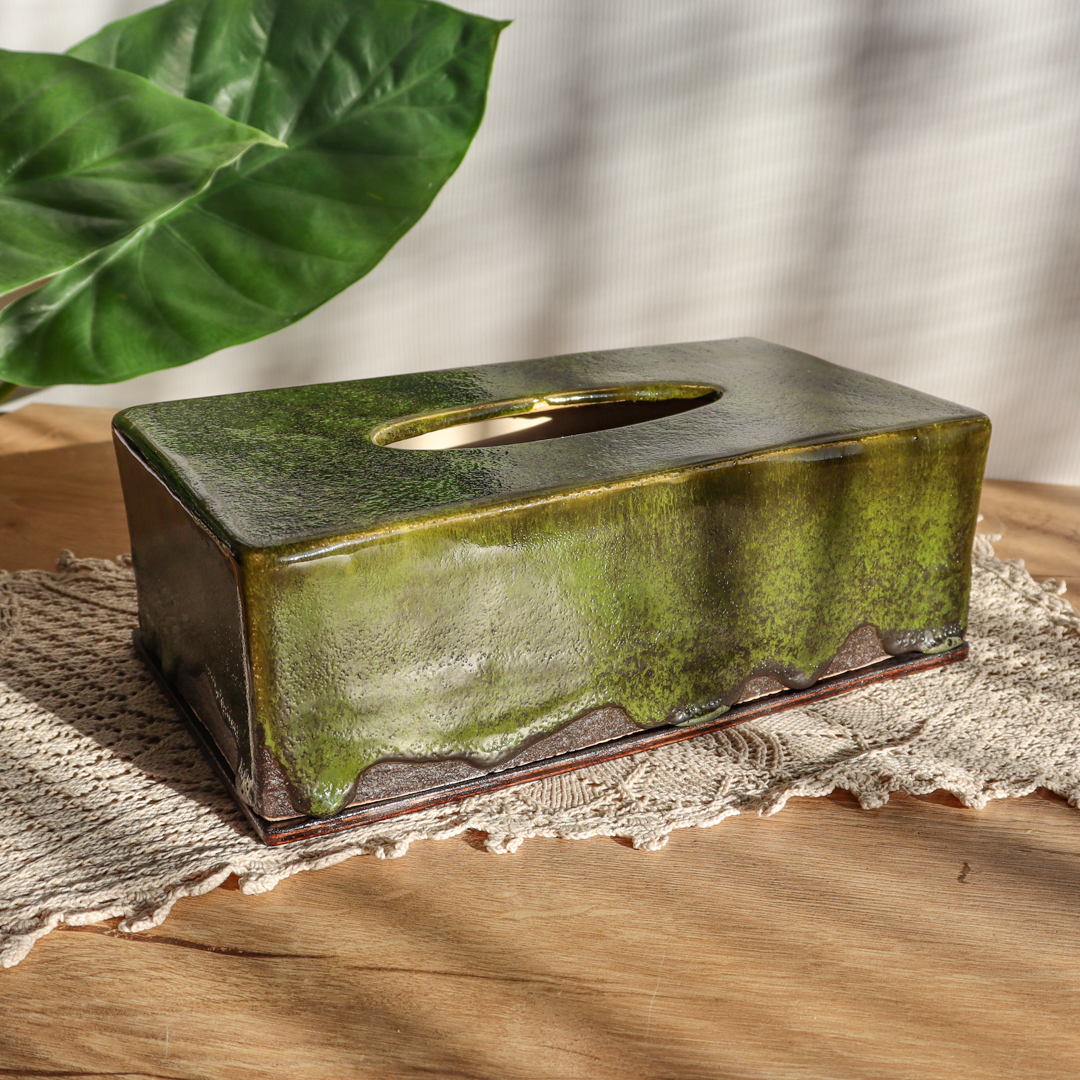 Ręcznie wykonane ceramiczne pudełko na chusteczki higieniczne z drewnianą podstawką z Kolekcji „Leśny mech”. Wzornictwo inspirowane leśnym krajobrazem, w barwach mchu i głębokiego brązu. Wymiary wewnętrzne 13,5 x 24,5 cm oraz wysokość 7,5 cm, pozwalają na przechowywanie standardowych chusteczek higienicznych w kartonowym opakowaniu. Zewnętrzne wymiary wynoszą 14,5 x 26 cm, a wysokość 8 cm. Drewniana podstawka dodaje mu eleganckiego wyglądu, harmonizując z naturalnymi kolorami ceramiki.