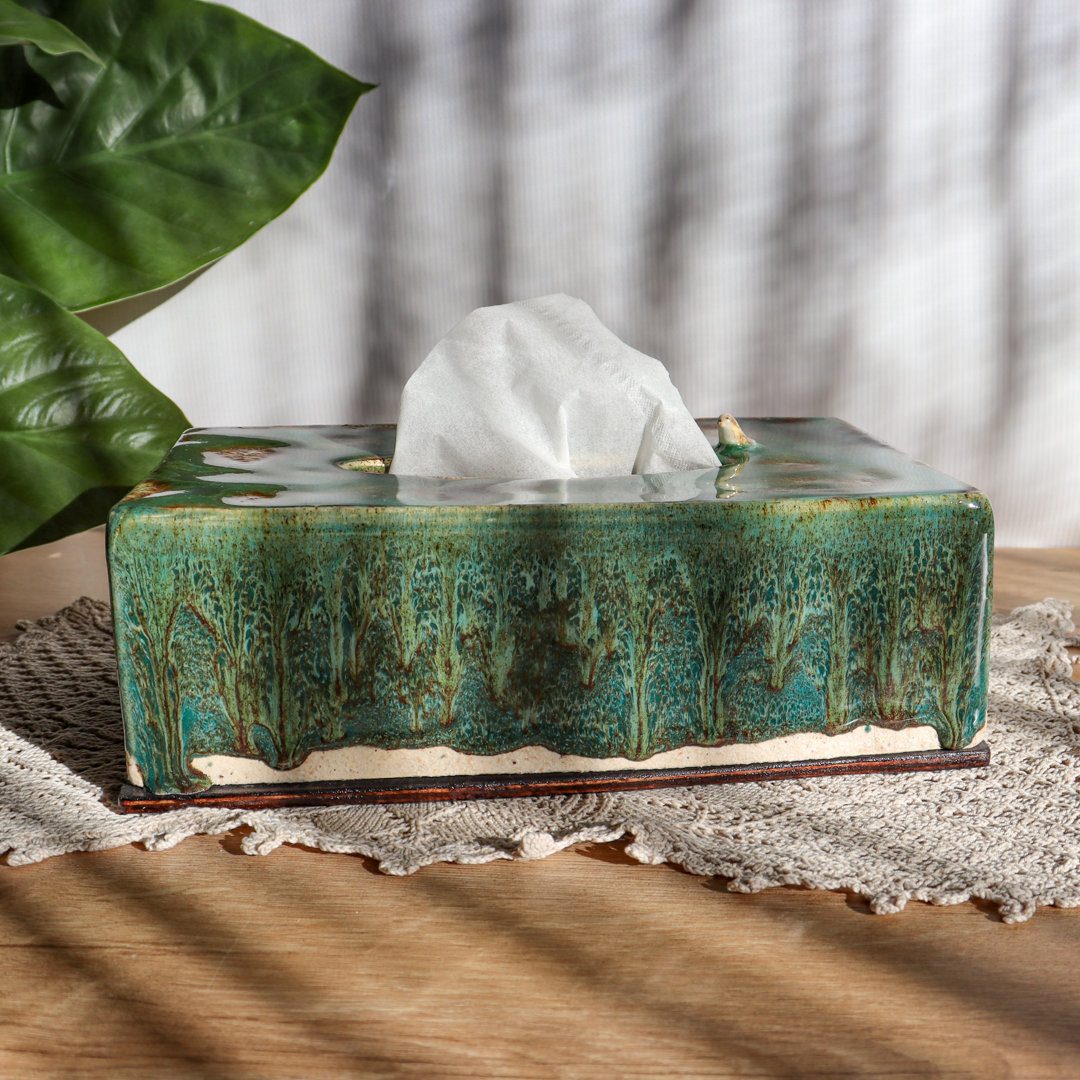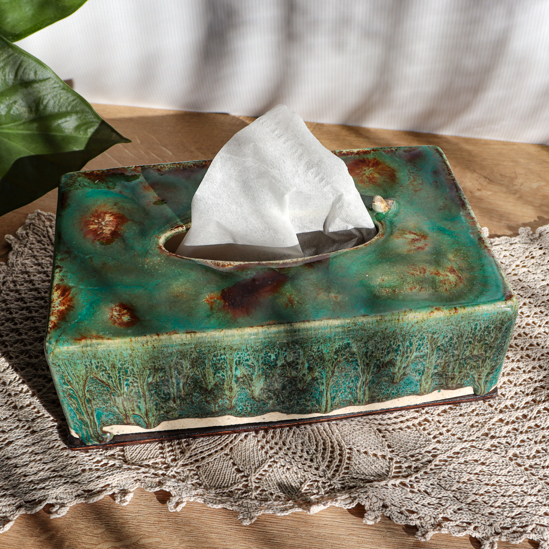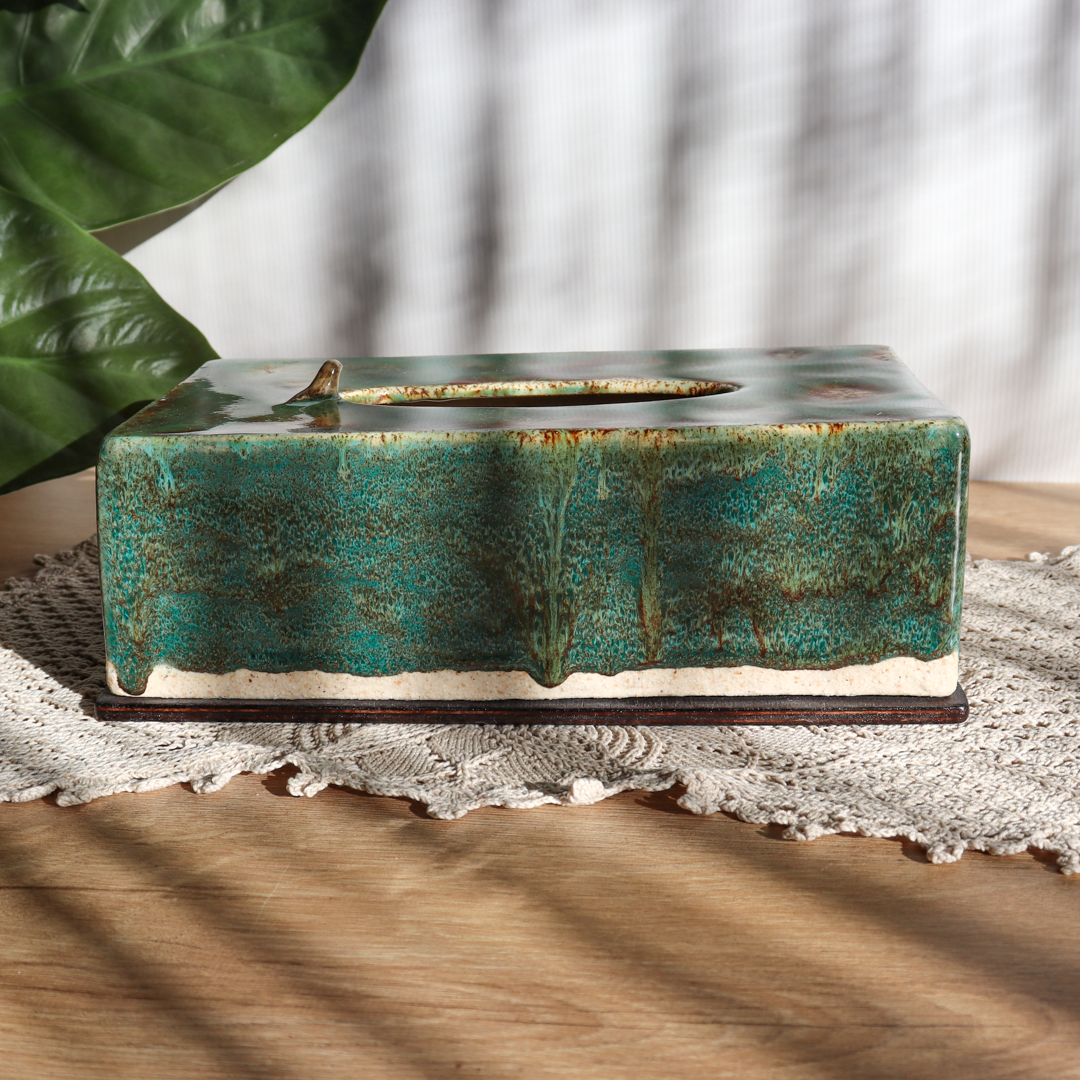 Przedstawiamy ręcznie wykonane ceramiczne pudełko na chusteczki – Ptaszek z drewnianą podstawką. Chustecznik ozdobiony uroczym ptaszkiem siedzącym przy otworze, idealnie wpasuje się w każde wnętrze, dodając mu unikalnego charakteru. Pokryty mieszanką beżowego i turkusowego szkliwa z brązowymi drobinami tworzącą ciekawy efekt. Pudełko posiada wewnętrzne wymiary 13 x 24 cm oraz wysokość 7,5 cm, co pozwala na przechowywanie standardowych chusteczek higienicznych w kartonowym opakowaniu. Zewnętrzne wymiary wynoszą 15 x 25 cm, a wysokość 9 cm. Drewniana podstawka dodaje mu eleganckiego wyglądu, harmonizując z naturalnymi kolorami ceramiki.