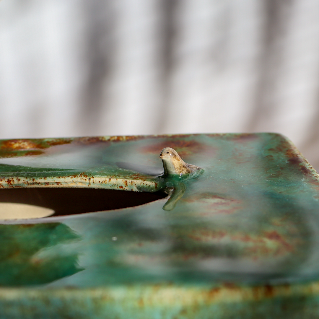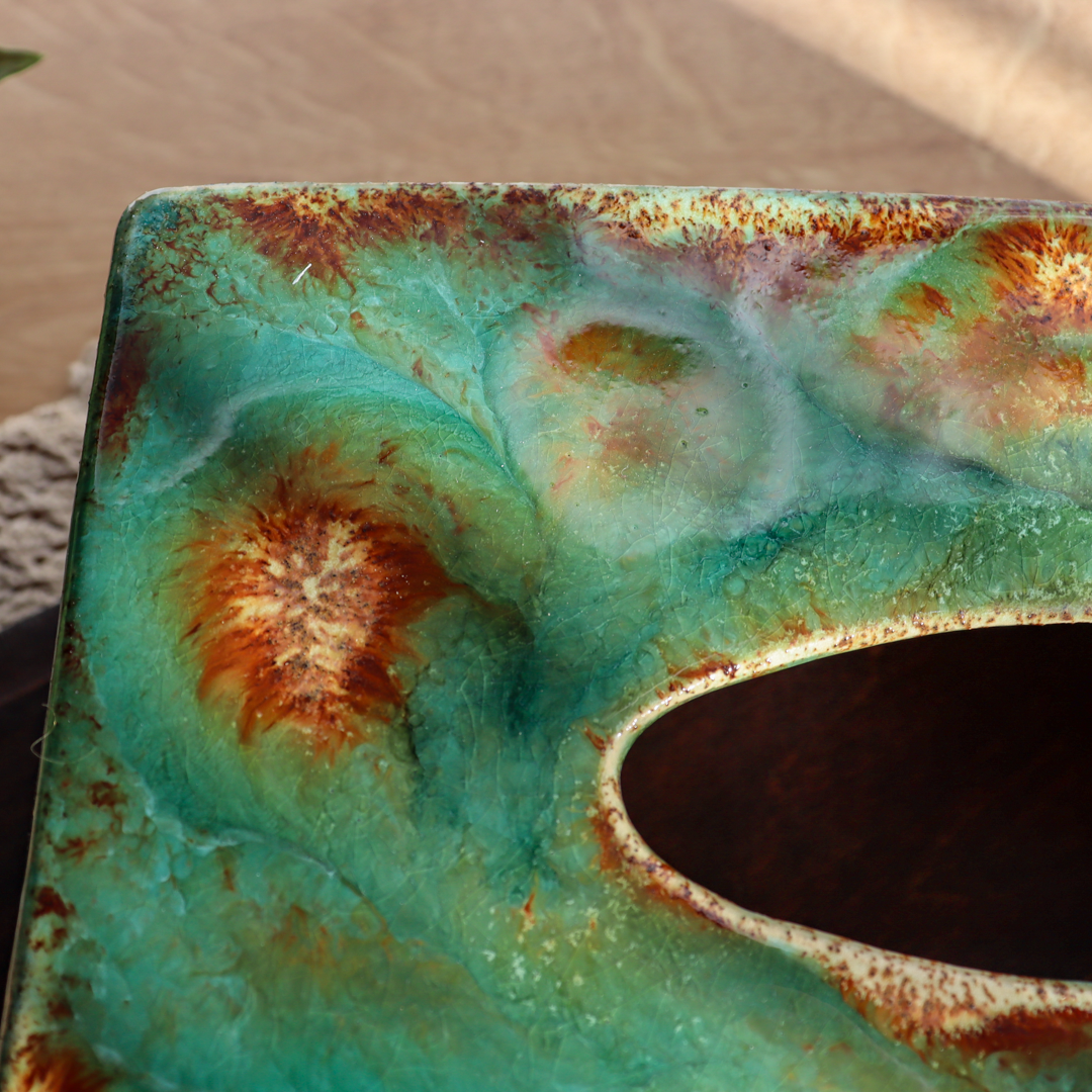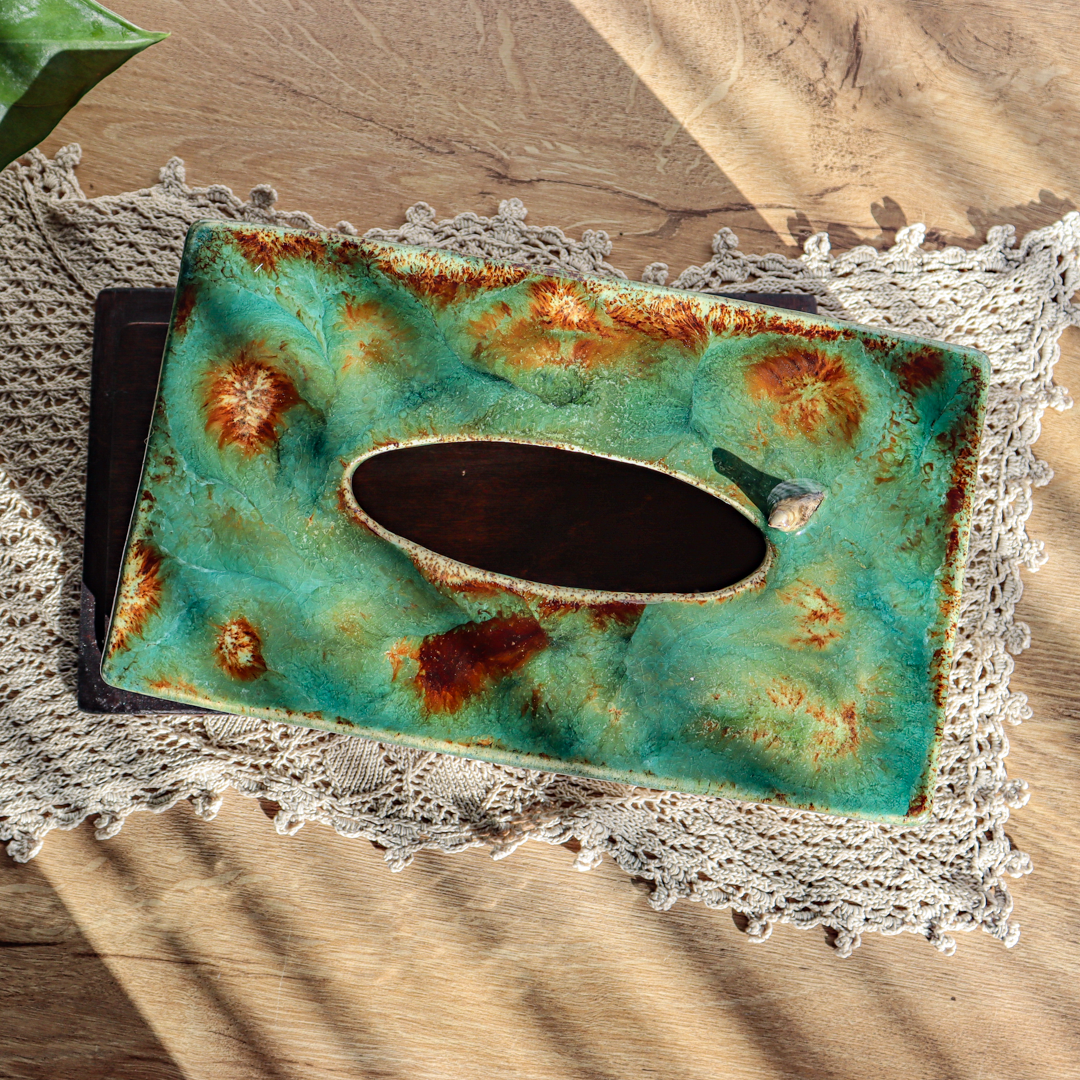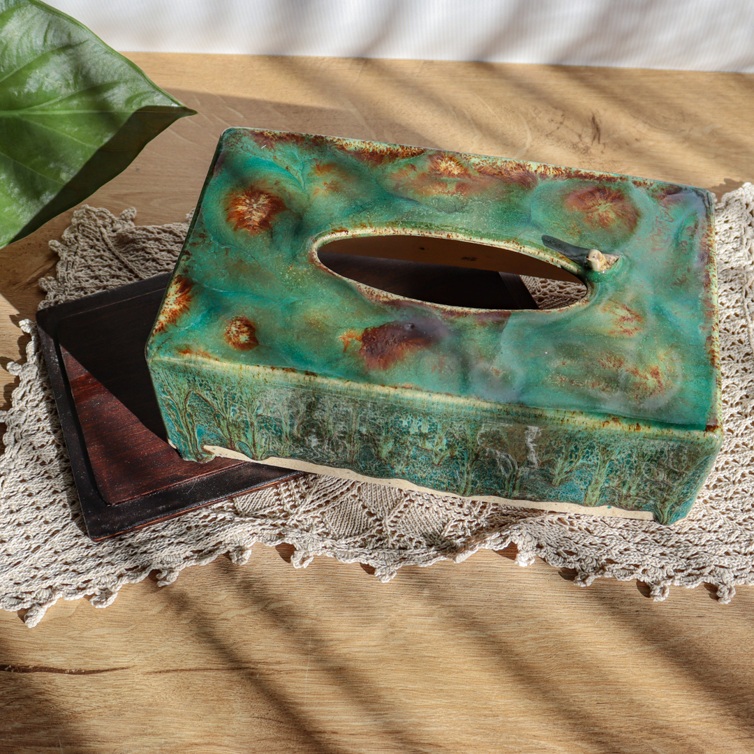 Przedstawiamy ręcznie wykonane ceramiczne pudełko na chusteczki – Ptaszek z drewnianą podstawką. Chustecznik ozdobiony uroczym ptaszkiem siedzącym przy otworze, idealnie wpasuje się w każde wnętrze, dodając mu unikalnego charakteru. Pokryty mieszanką beżowego i turkusowego szkliwa z brązowymi drobinami tworzącą ciekawy efekt. Pudełko posiada wewnętrzne wymiary 13 x 24 cm oraz wysokość 7,5 cm, co pozwala na przechowywanie standardowych chusteczek higienicznych w kartonowym opakowaniu. Zewnętrzne wymiary wynoszą 15 x 25 cm, a wysokość 9 cm. Drewniana podstawka dodaje mu eleganckiego wyglądu, harmonizując z naturalnymi kolorami ceramiki.