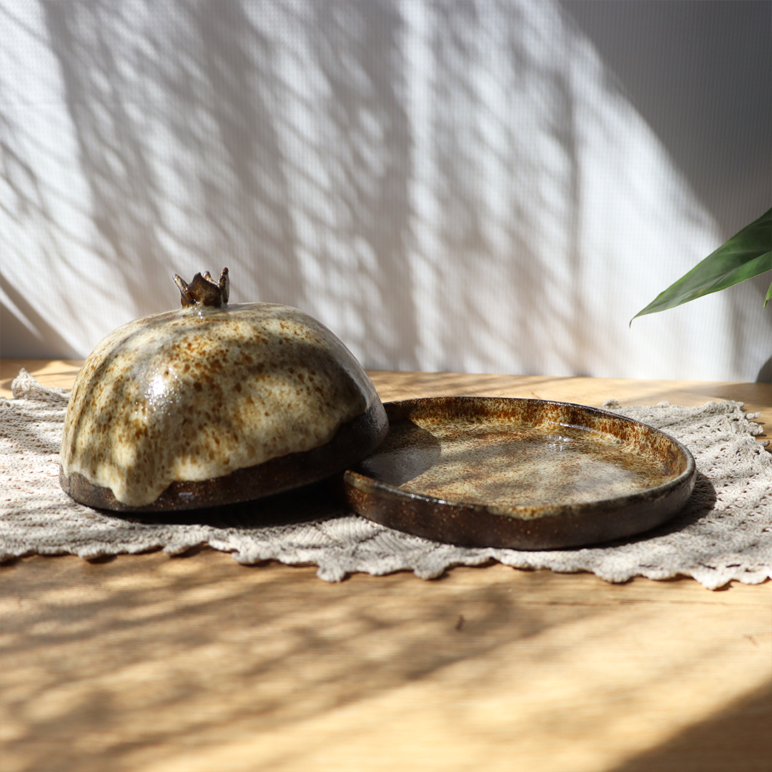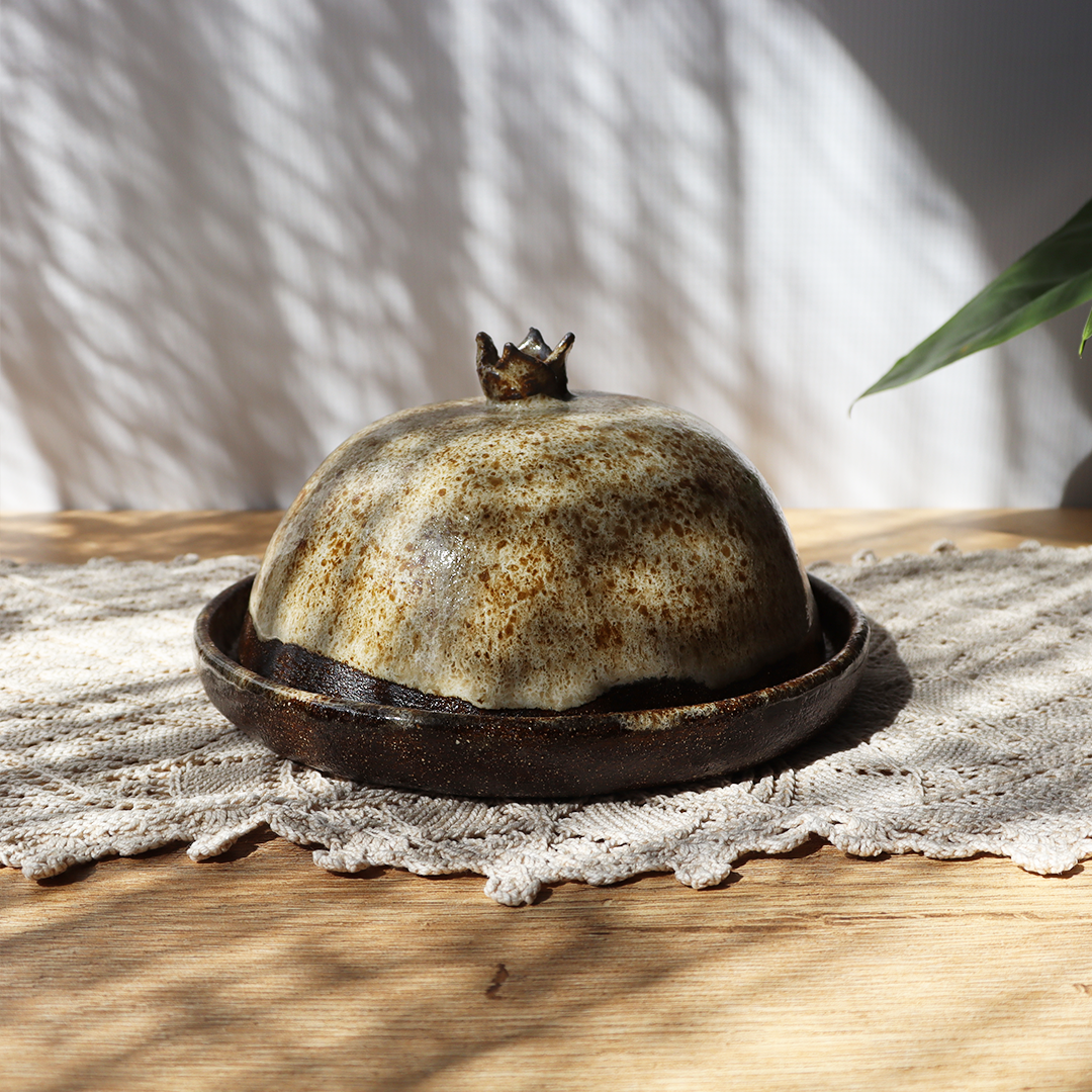 Ręcznie wykonany z ciemnej brązowej gliny ceramiczny pojemnik/tacka z przykrywką o średnicy 16.5 cm. Ten urokliwy pojemnik łączy w sobie estetykę i funkcjonalność, tworząc idealny dodatek do każdej kuchni lub jadalni. Tacka została pokryta beżowym szkliwem z ciemniejszymi plamami. Przykrywka w kształcie kopułki ma rączkę w kształcie szypułki, dodając pojemnikowi oryginalności. Cały pojemnik ma średnicę 16,5 cm i wysokość 9cm, jest idealny do przechowywania różnych produktów takich jak masło, sery czy przekąski.