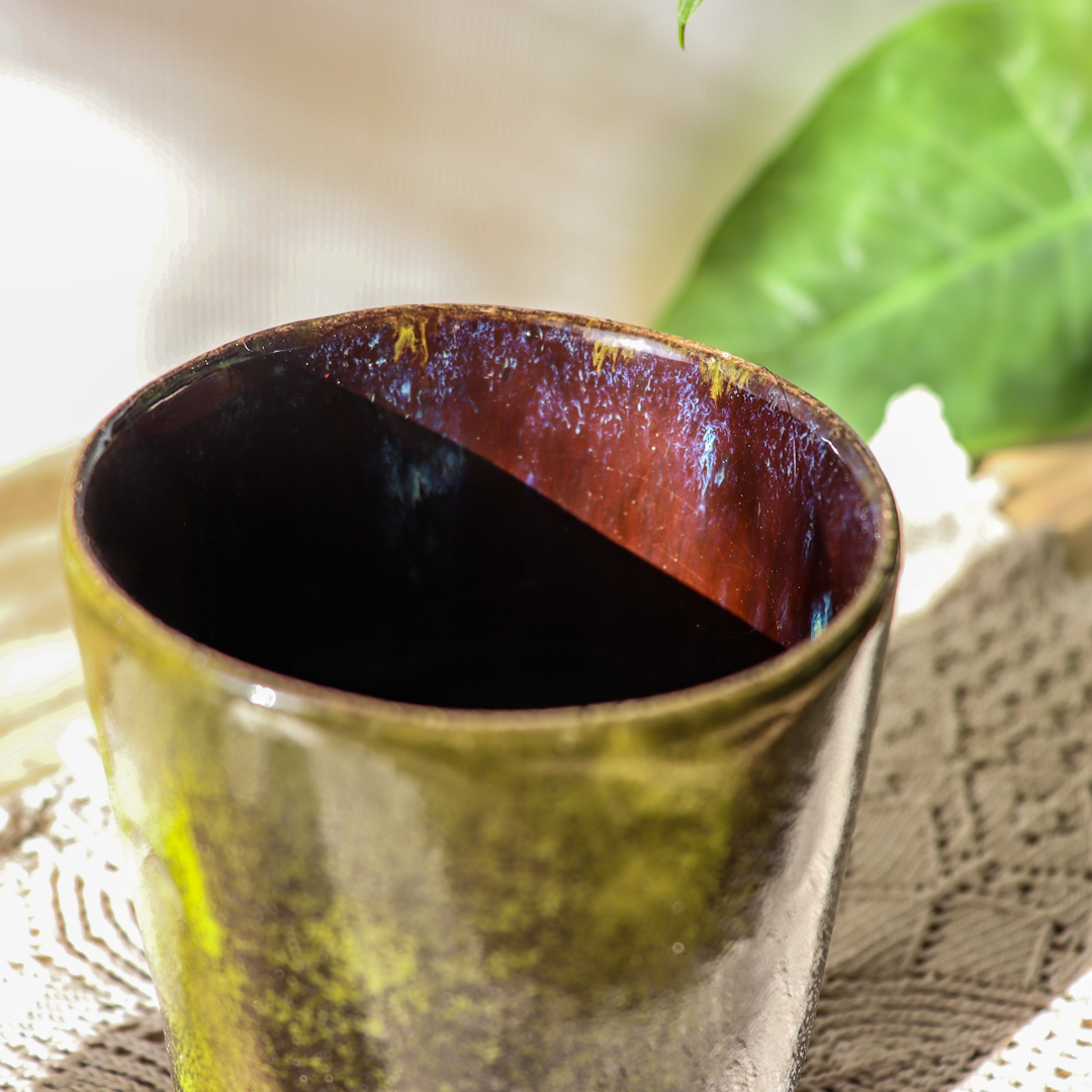 Kolorystyka pojemnika to harmonijne połączenie barw leśnego mchu oraz głębokiego brązu z subtelnymi błękitnymi przebłyskami, które tworzą unikalny efekt wizualny. Te naturalne odcienie doskonale komponują się z różnorodnymi aranżacjami wnętrz, dodając im elegancji i stylu.