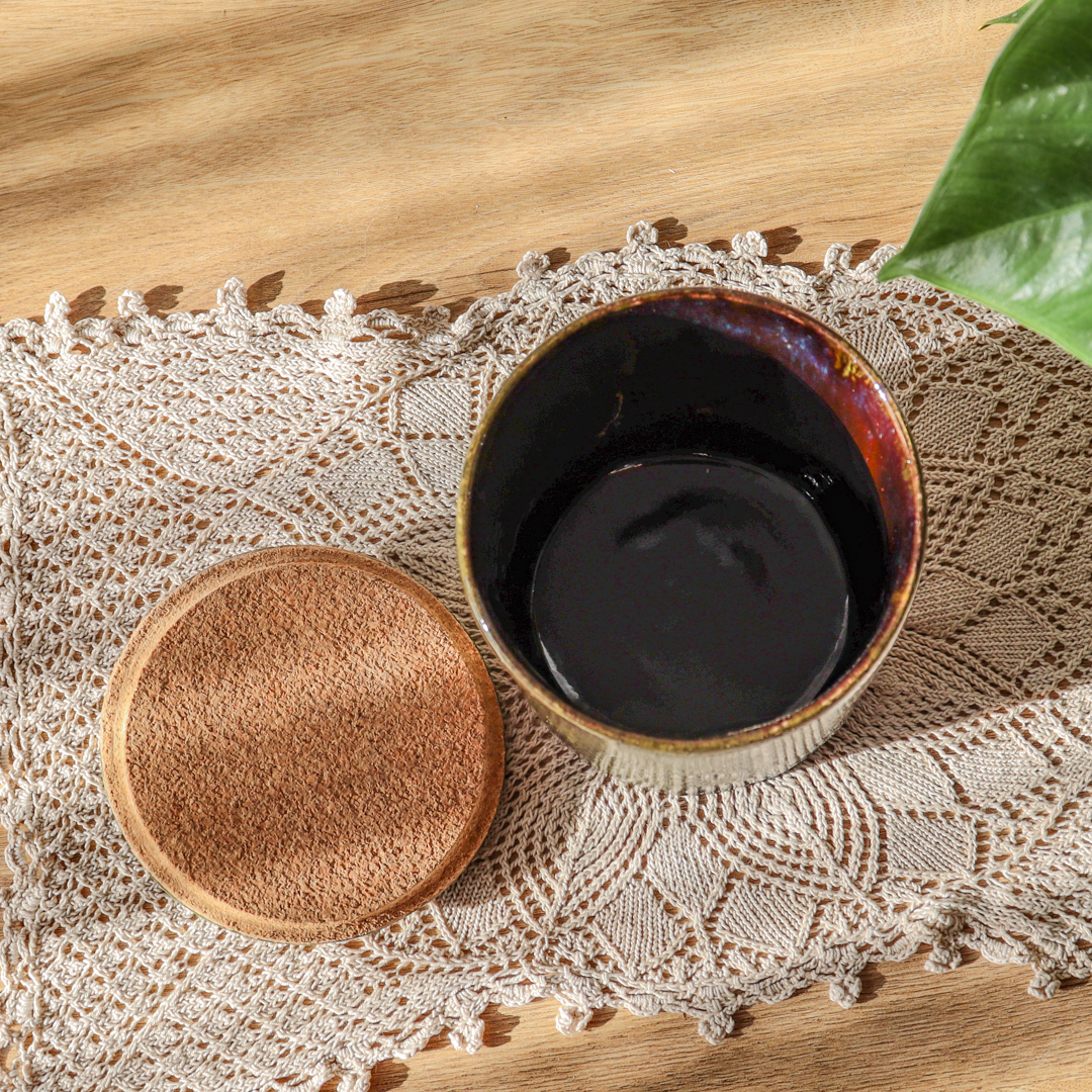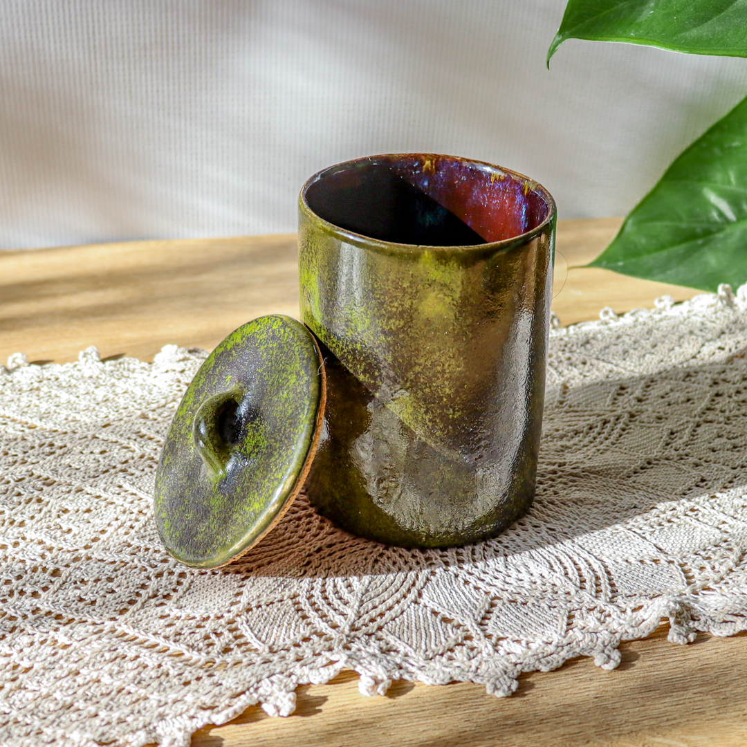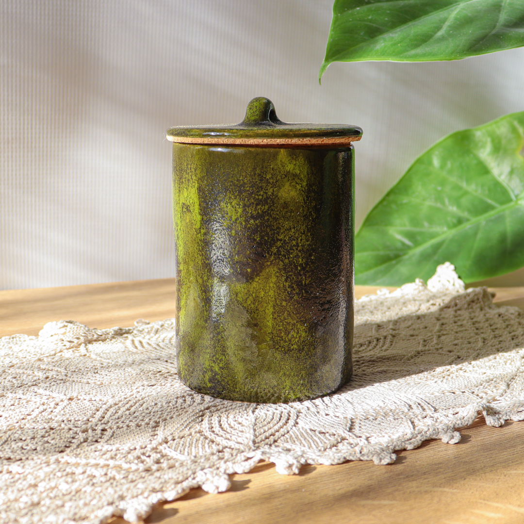 Ręcznie wykonany ceramiczny pojemnik z przykrywką o pojemności 500 lub 750ml z Kolekcji „Leśny mech” w pięknych barwach leśnego mchu i głębokiego brązu z delikatnymi błękitnymi przebłyskami. Przykrywka została podklejona korkiem co sprawia że pojemnik jest doskonały d przechowywania suchych produktów. Stylowy i praktyczny dodatek do Twojego domu.