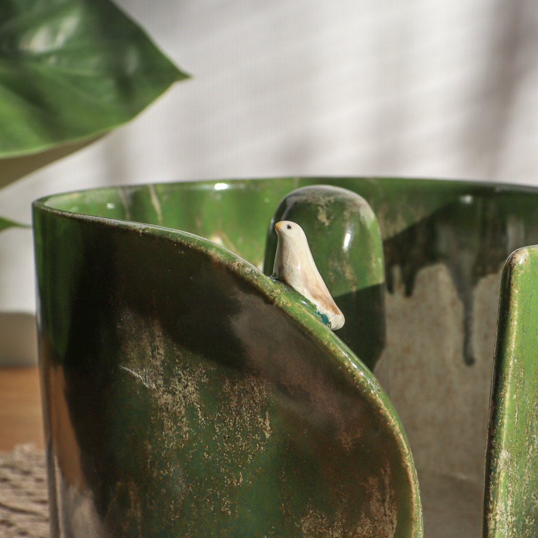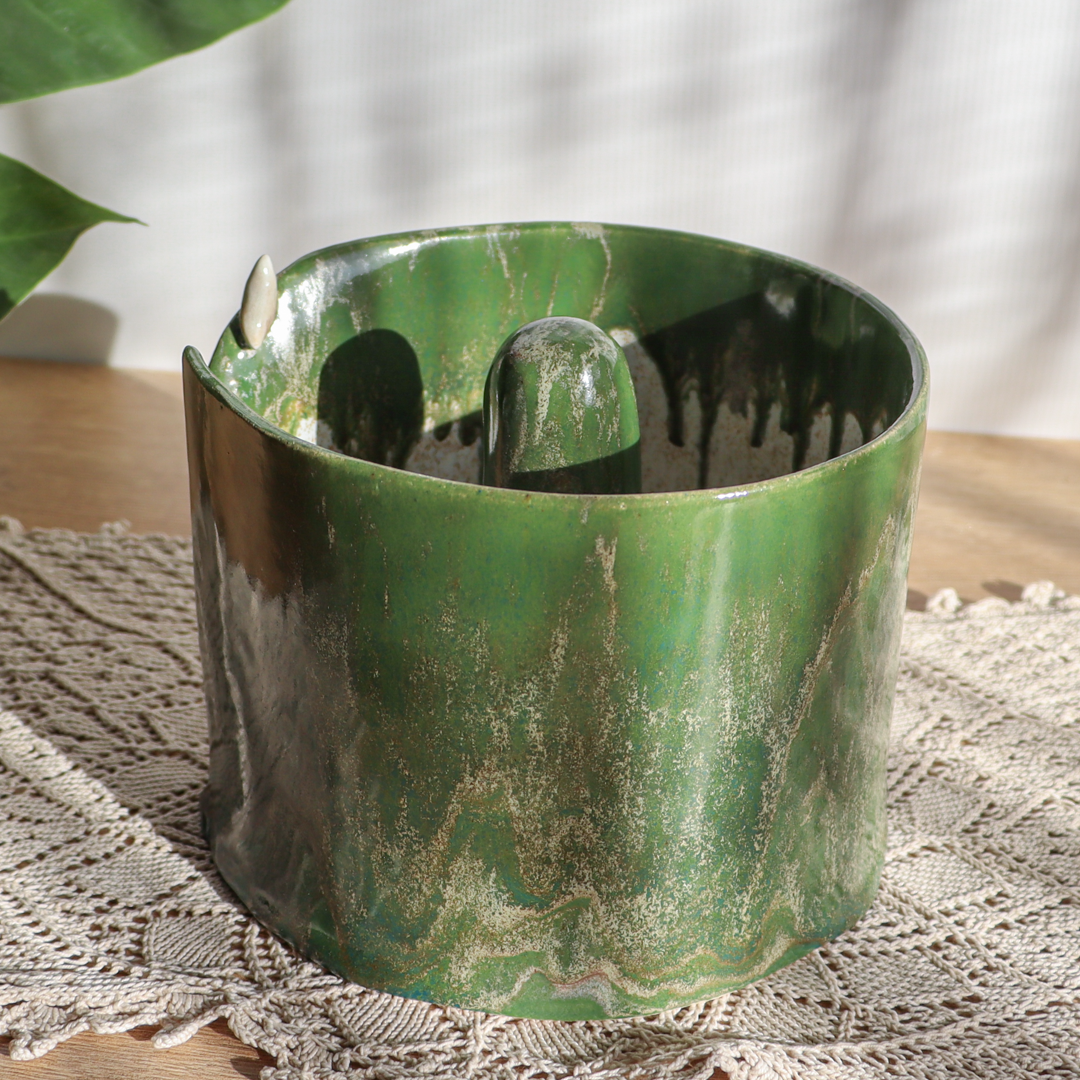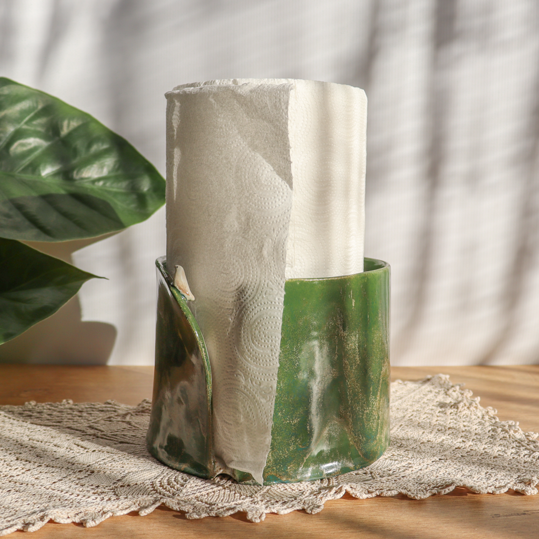 Przedstawiamy ręcznie wykonany ceramiczny stojak na ręczniki papierowe z ptaszkiem, będący częścią naszej kolekcji naczyń ceramicznych Srebrzysta Zieleń. Ten wyjątkowy stojak to doskonałe połączenie funkcjonalności i elegancji, idealnie komponujące się z naturalnym wystrojem wnętrz. W kolorach spokojnej zieleni. Stojak ma średnicę 16,5 cm oraz wysokość 12,5 cm, co czyni go praktycznym akcesorium do przechowywania ręczników papierowych.