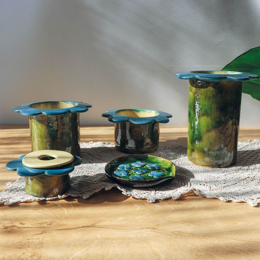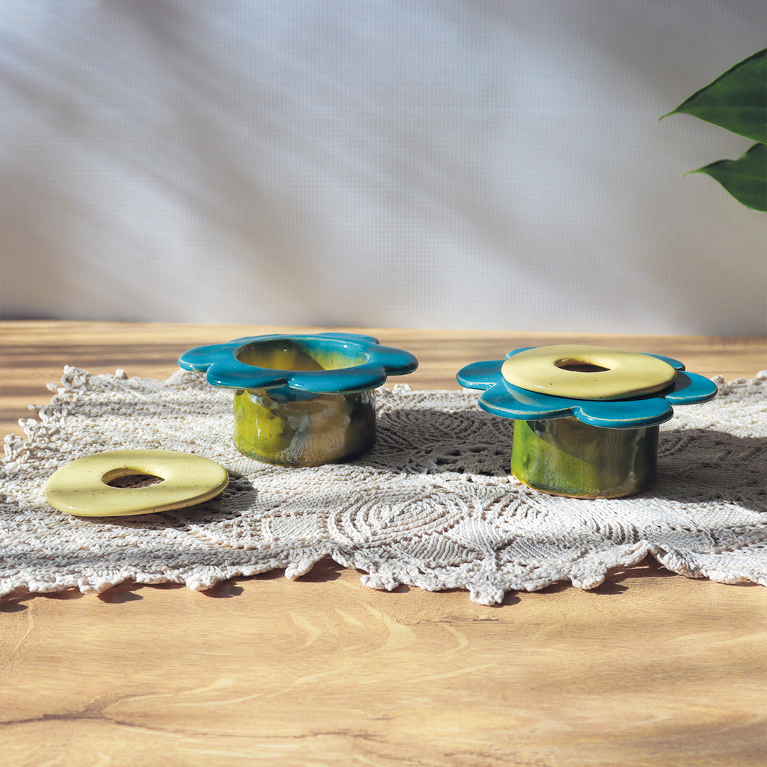 Zewnętrzna strona jest ozdobiona zielonym szkliwem, a na brzegu umieszczone zostały niebieskie płatki. Wnętrze pokryte zostało ciepłym, żółtym odcieniem, który dodatkowo podkreśla płomień świecy. Średnica wewnętrzna świecznika wynosi 5 cm, a zewnętrzna z płatkami to 10 cm, co sprawia, że idealnie pasuje na standardowe t-lighty.