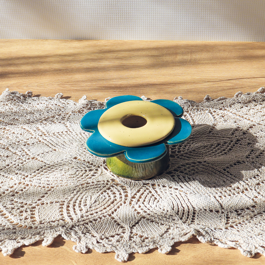 Do świecznika dołączyliśmy małą, ceramiczną przykrywkę z otworem, która imituje żółty środek kwiatka. Dzięki niej wkład jest estetycznie ukryty, natomiast płomień może spokojnie się palić, nie będąc duszonym.