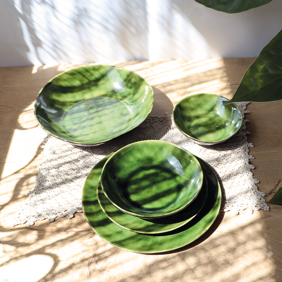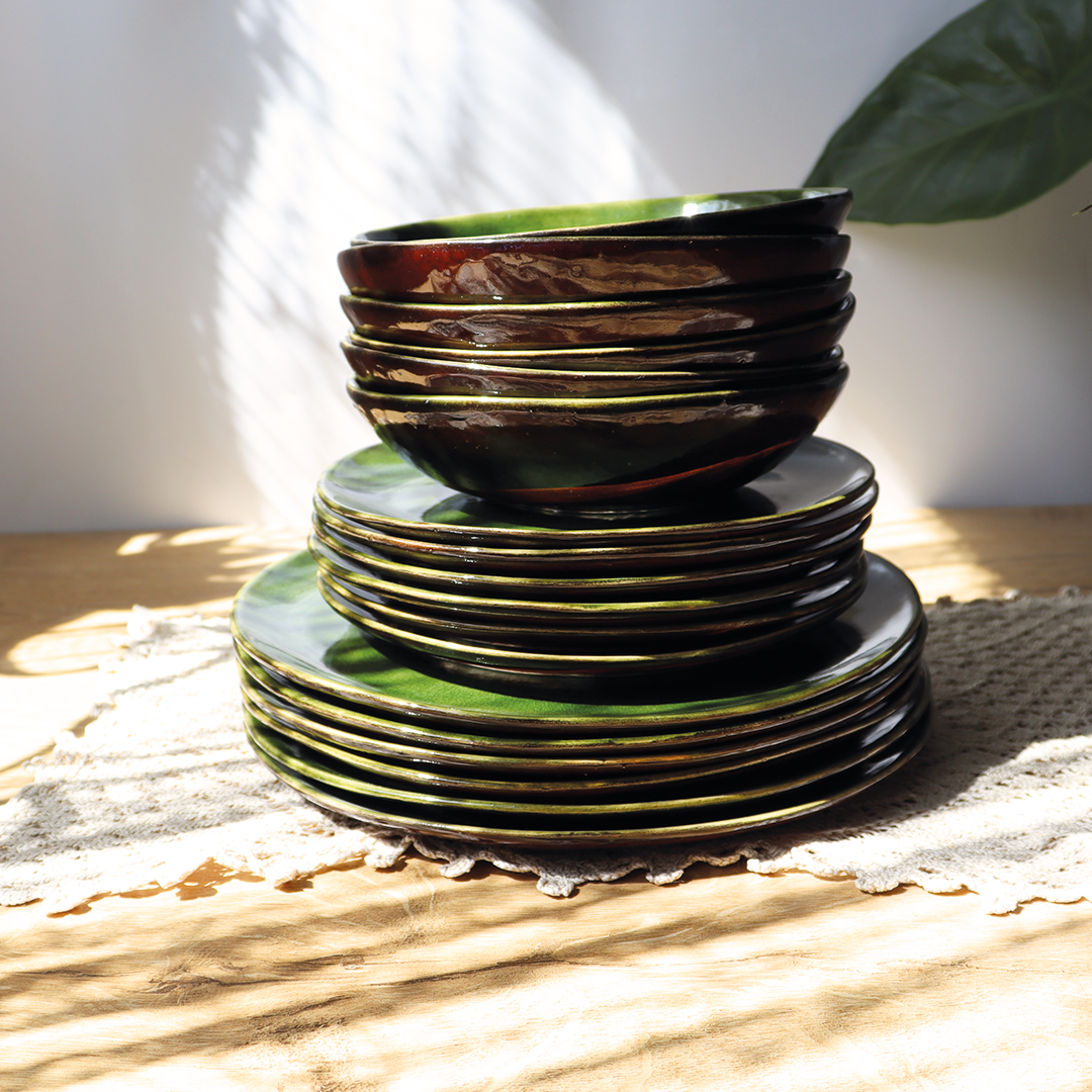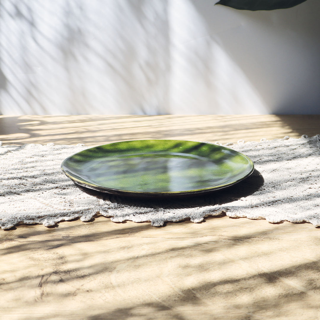 Ceramiczne talerze z kolekcji „Szklany Staw”, o średnicy 18,5 cm – stanowi doskonałą bazę do serwowania dań, w kolorach zieleni i brązu, wniesie elegancję i nastrojowe piękno do Twojej zastawy stołowej.