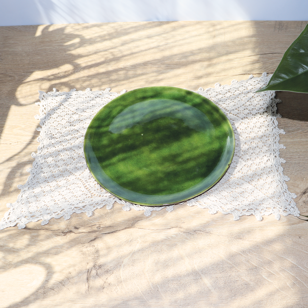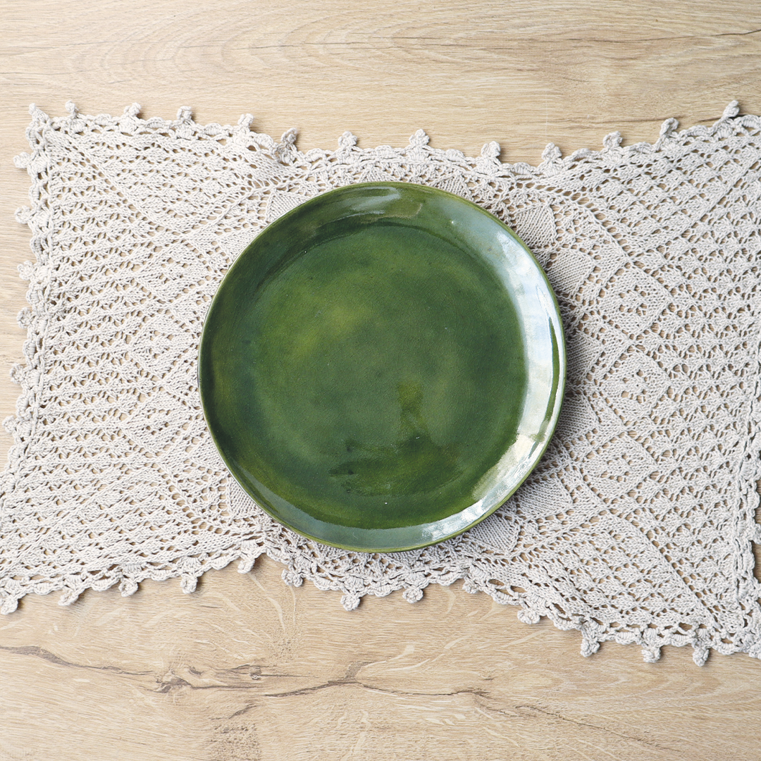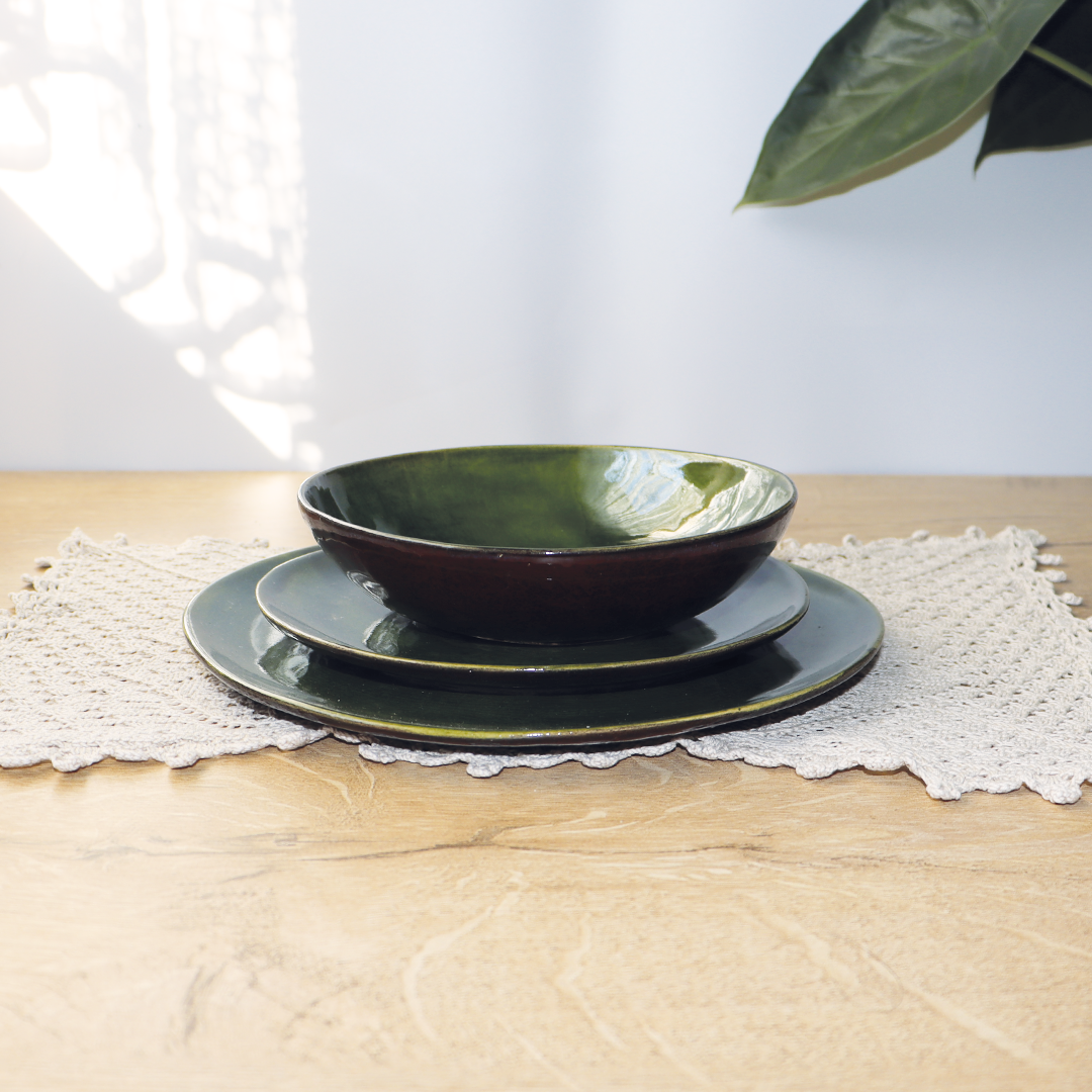 Ceramiczne talerze z kolekcji „Szklany Staw”, o średnicy 18,5 cm – stanowi doskonałą bazę do serwowania dań, w kolorach zieleni i brązu, wniesie elegancję i nastrojowe piękno do Twojej zastawy stołowej.
