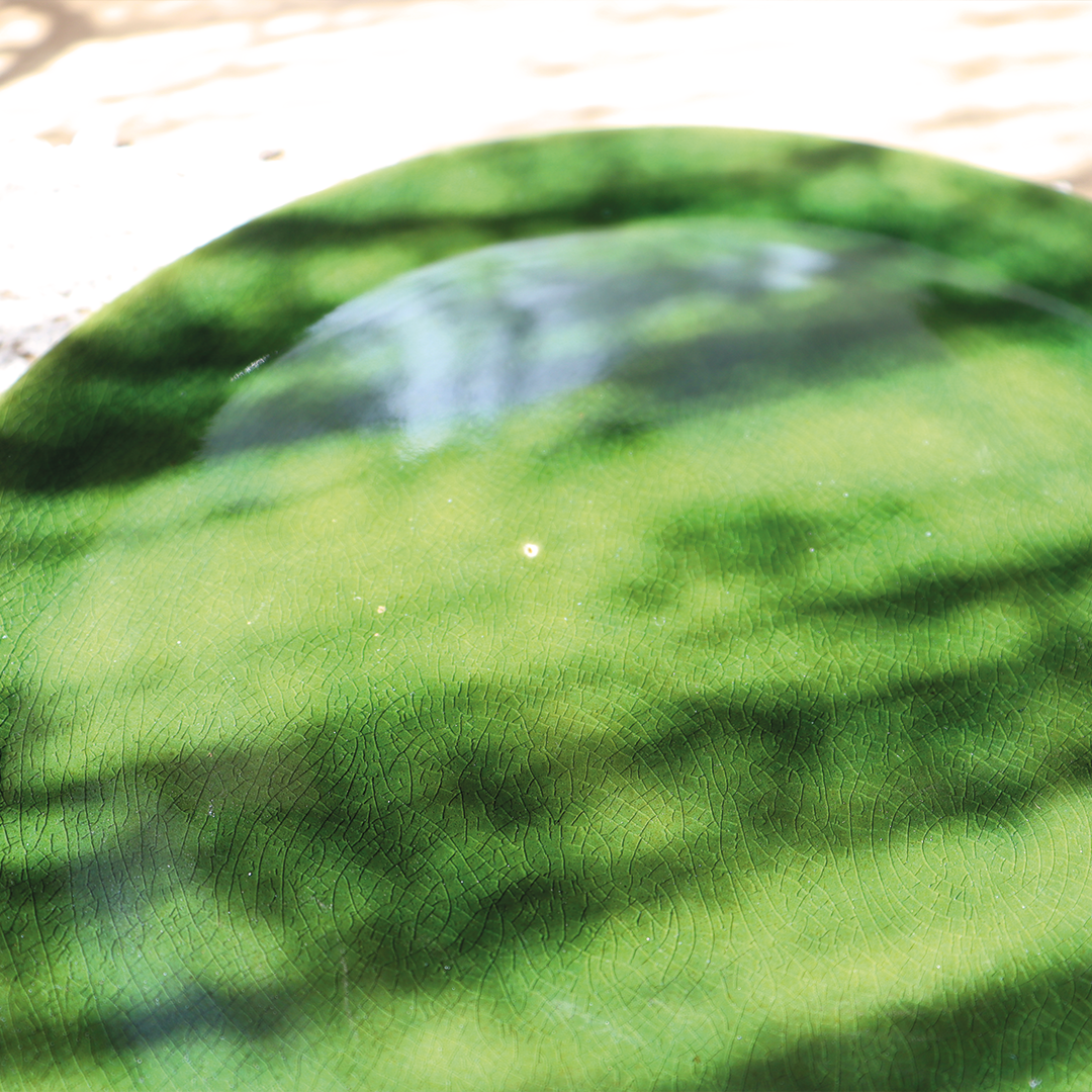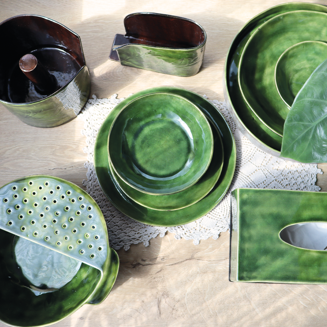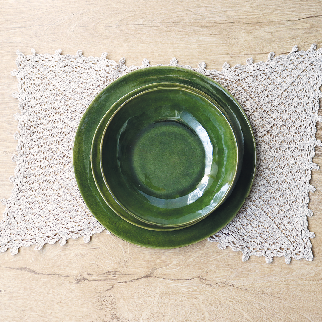Kolor butelkowej zieleni z efektem crackle sprawia, że każdy element kolekcji „Szklany staw” emanuje nastrojowym pięknem. Zwykłe, obłe kształty zyskały dzięki temu wyjątkowemu szkliwieniu głębię i styl, tworząc unikalne i niepowtarzalne elementy zastawy stołowej.