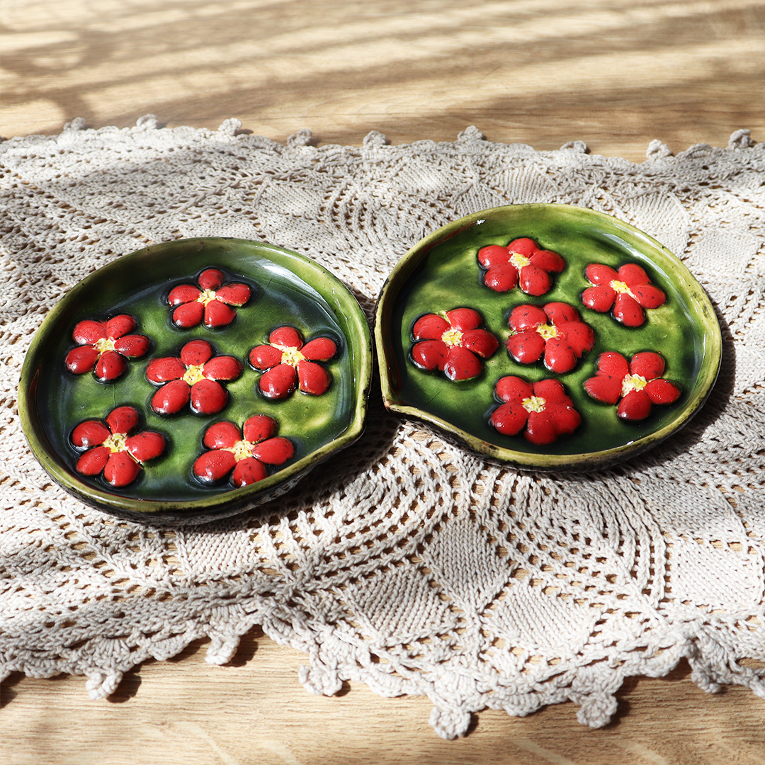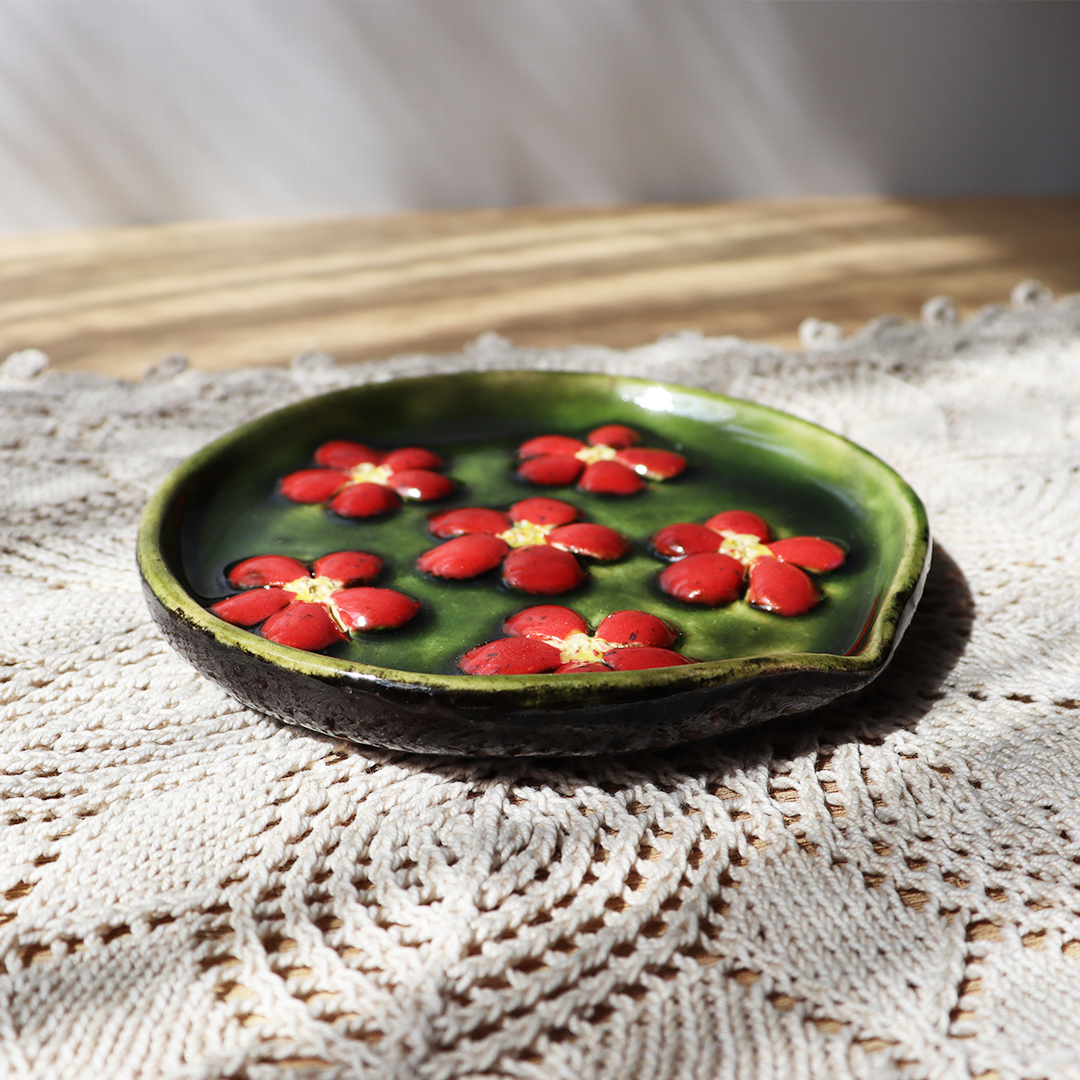 Ręcznie wykonany ceramiczny talerzyk do czyszczenia pędzli -czerwone kwiatki z kolekcji „Ceramiczna Rabata”. Jest nie tylko piękną ozdobą, ale także praktycznym dodatkiem do twoich wnętrz. Można na nim odkładać biżuterię i drobiazgi, a trójwymiarowe czerwone kwiatki w środku pełnią rolę powierzchni do czyszczenia pędzli do makijażu. Wystarczy, że nalejesz na niego odrobinę wody z detergentem, i wyczyścisz pędzle, pocierając o nierówności stworzone przez kwiatki.