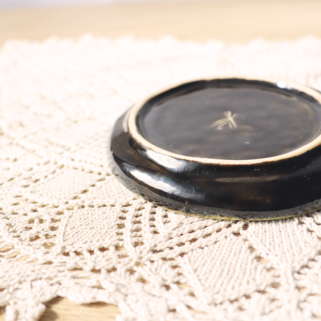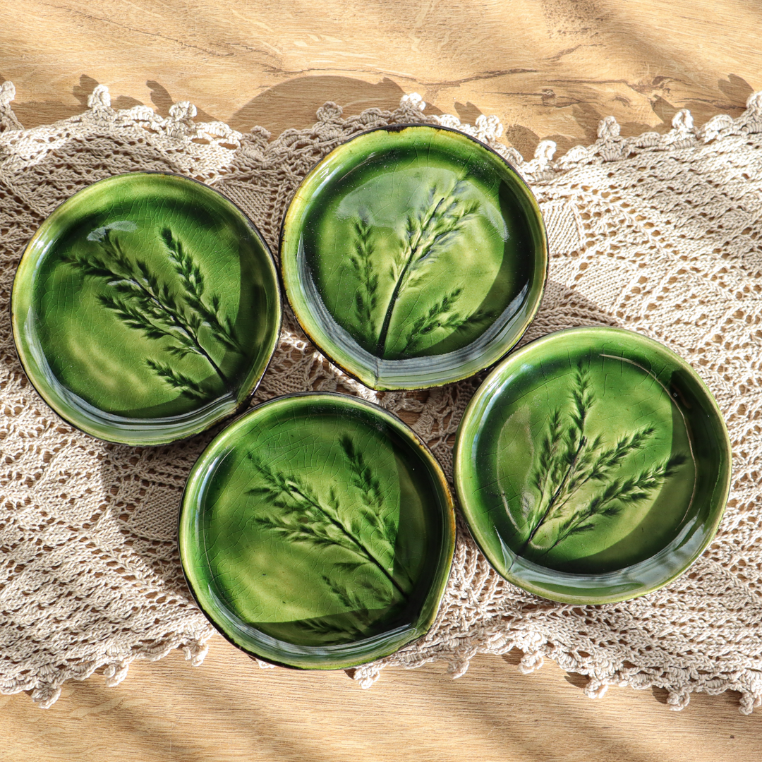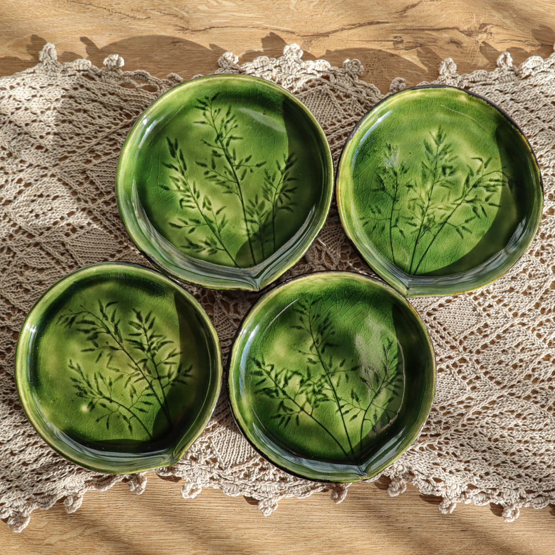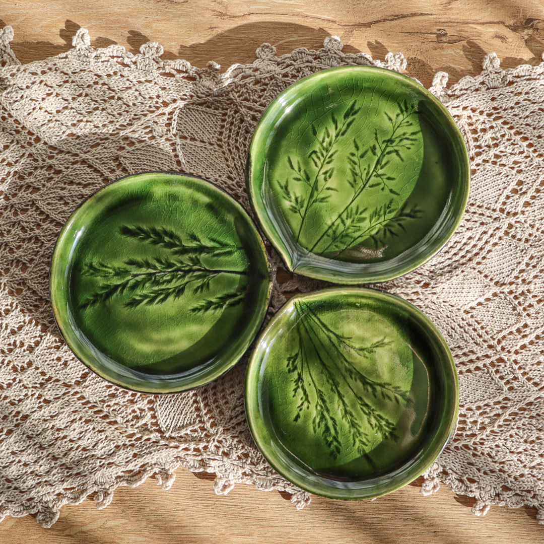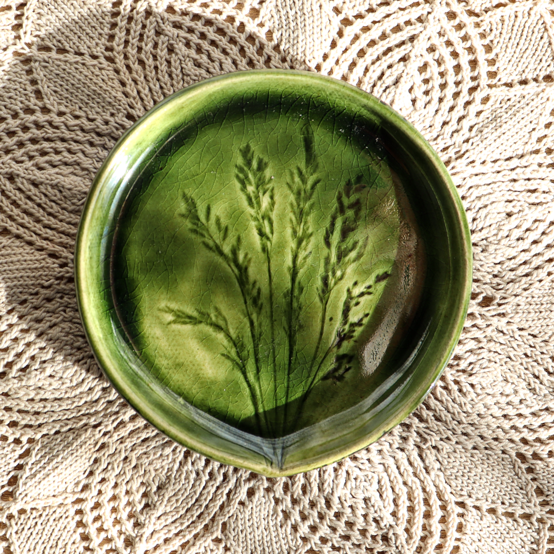 Ręcznie robiony ceramiczny talerzyk z dziubkiem o średnicy 10 cm, wyróżniający się odciśniętym roślinnym wzorem. Powierzchnia talerzyka jest pokryta zielonym szkliwem z efektem crackle, tworzącym delikatną siateczkę drobnych pęknięć, dodatkowo nadając całości unikalny i artystyczny wygląd, a spód brązowym szkliwem. Idealny do odłożenia torebki herbaty czy serwowania drobnych przekąsek jak oliwki lub podania cytryny.