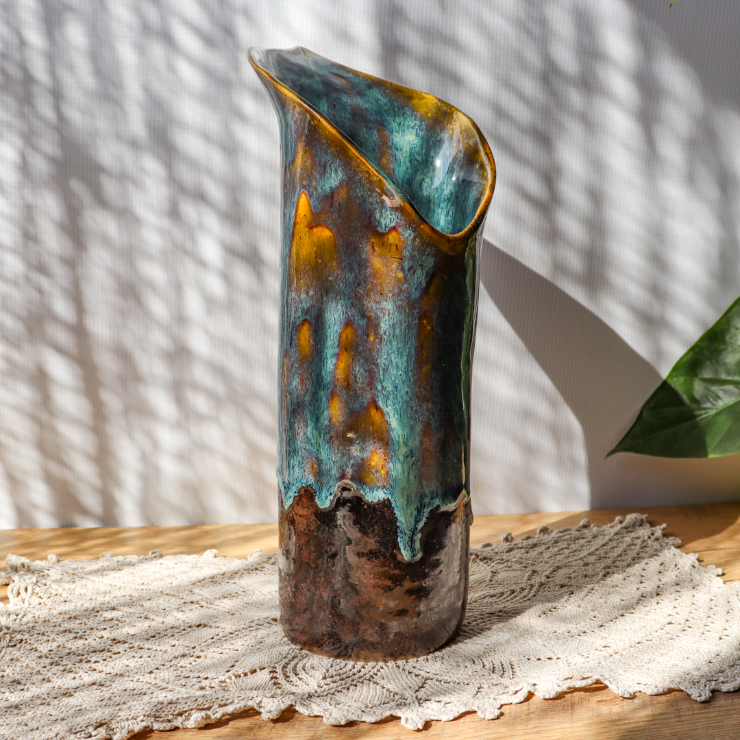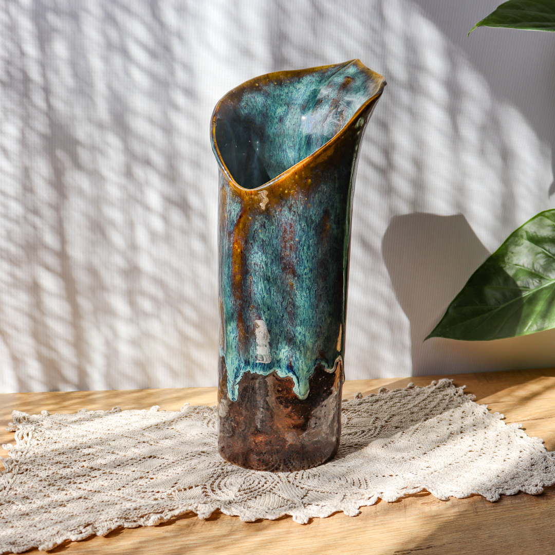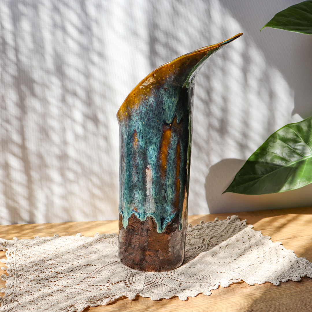 Przedstawiamy ręcznie wykonany ceramiczny wazon o kształcie liścia i pojemności 1 l. Pokryty mieszanką spływającego szkliwa w brązowych i niebieskich odcieniach.