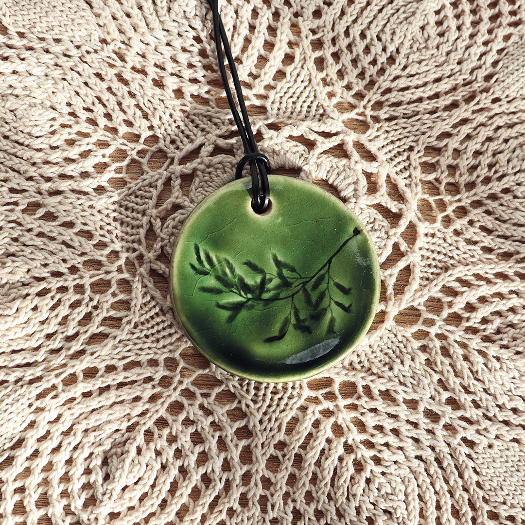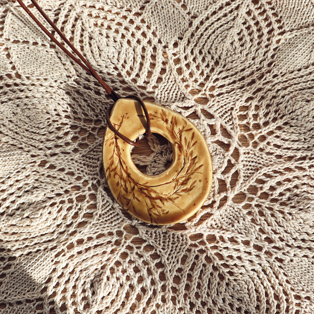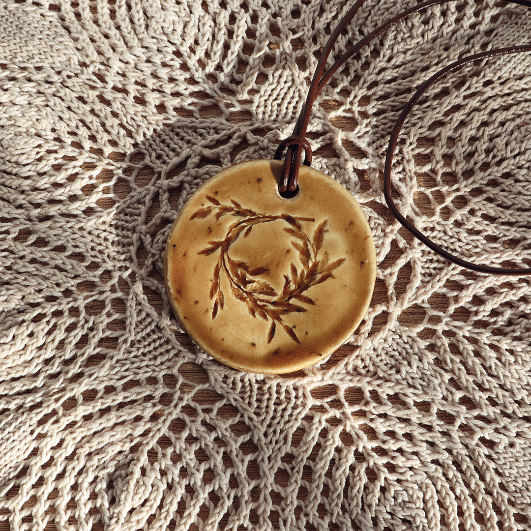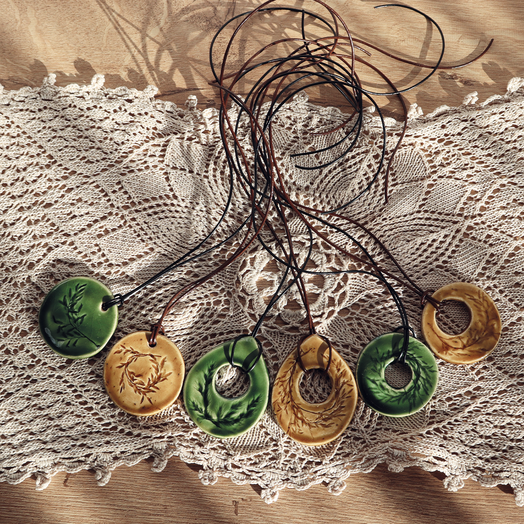 Ręcznie wykonany ceramiczny wisiorek na rzemieniu -Roślinka to połączenie sztuki i natury. Zdobiony subtelnym roślinnym wzorem, podkreśla piękno przyrody i unikalny charakter ręcznie wykonanej biżuterii. Dostępny w kształcie koła, łezki lub owalu, pasuje zarówno do codziennych, jak i eleganckich stylizacji. Wisiorki zostały pokryte pół-transparentnym szkliwem z efektem cracle (drobne pęknięcia) w kolorze zielonym lub miodowo-złotym, uwidaczniającym odciśnięty wzór. Wisiorki zawieszone zostały na naturalnym czarnym lub brązowym, rzemieniu o średnicy 1,5 mm.