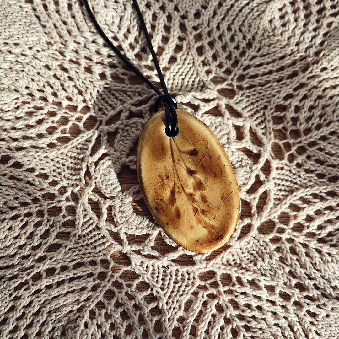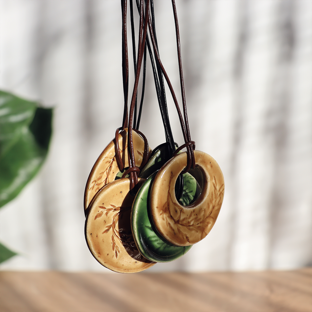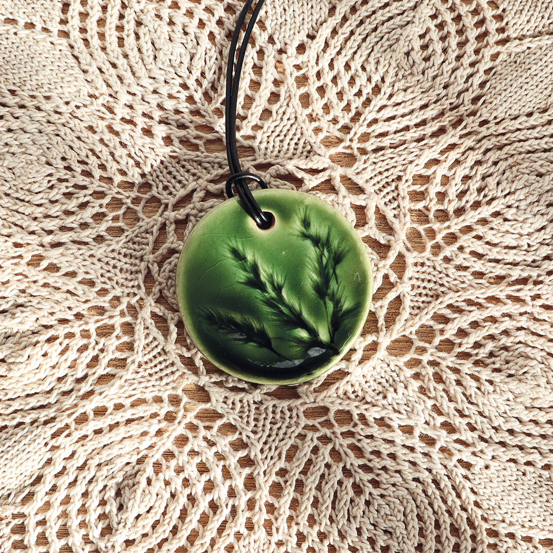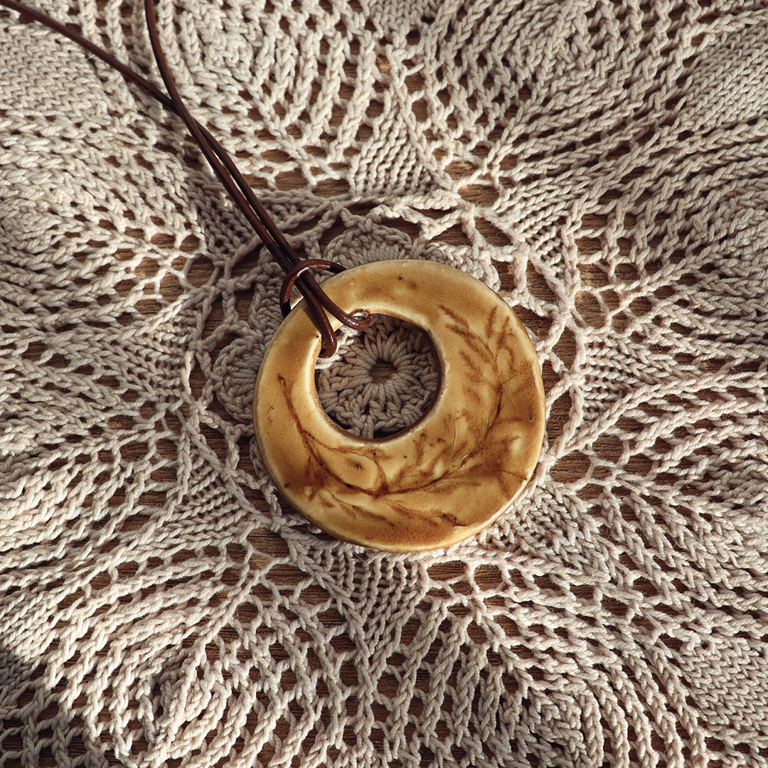 Ręcznie wykonany ceramiczny wisiorek na rzemieniu -Roślinka to połączenie sztuki i natury. Zdobiony subtelnym roślinnym wzorem, podkreśla piękno przyrody i unikalny charakter ręcznie wykonanej biżuterii. Dostępny w kształcie koła, łezki lub owalu, pasuje zarówno do codziennych, jak i eleganckich stylizacji. Wisiorki zostały pokryte pół-transparentnym szkliwem z efektem cracle (drobne pęknięcia) w kolorze zielonym lub miodowo-złotym, uwidaczniającym odciśnięty wzór. Wisiorki zawieszone zostały na naturalnym czarnym lub brązowym, rzemieniu o średnicy 1,5 mm.