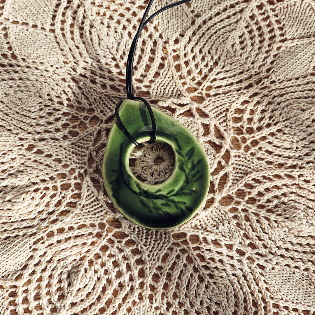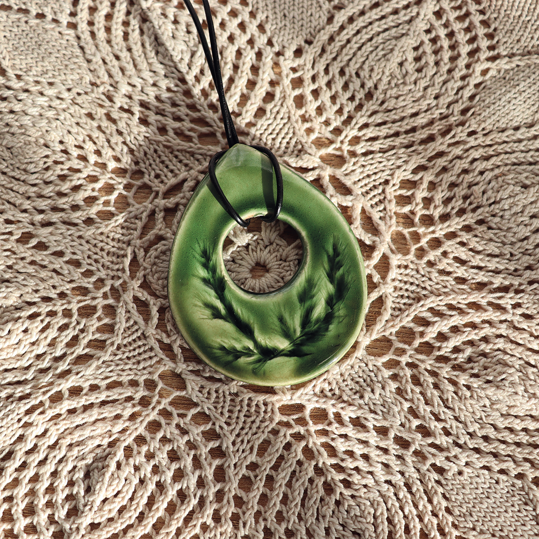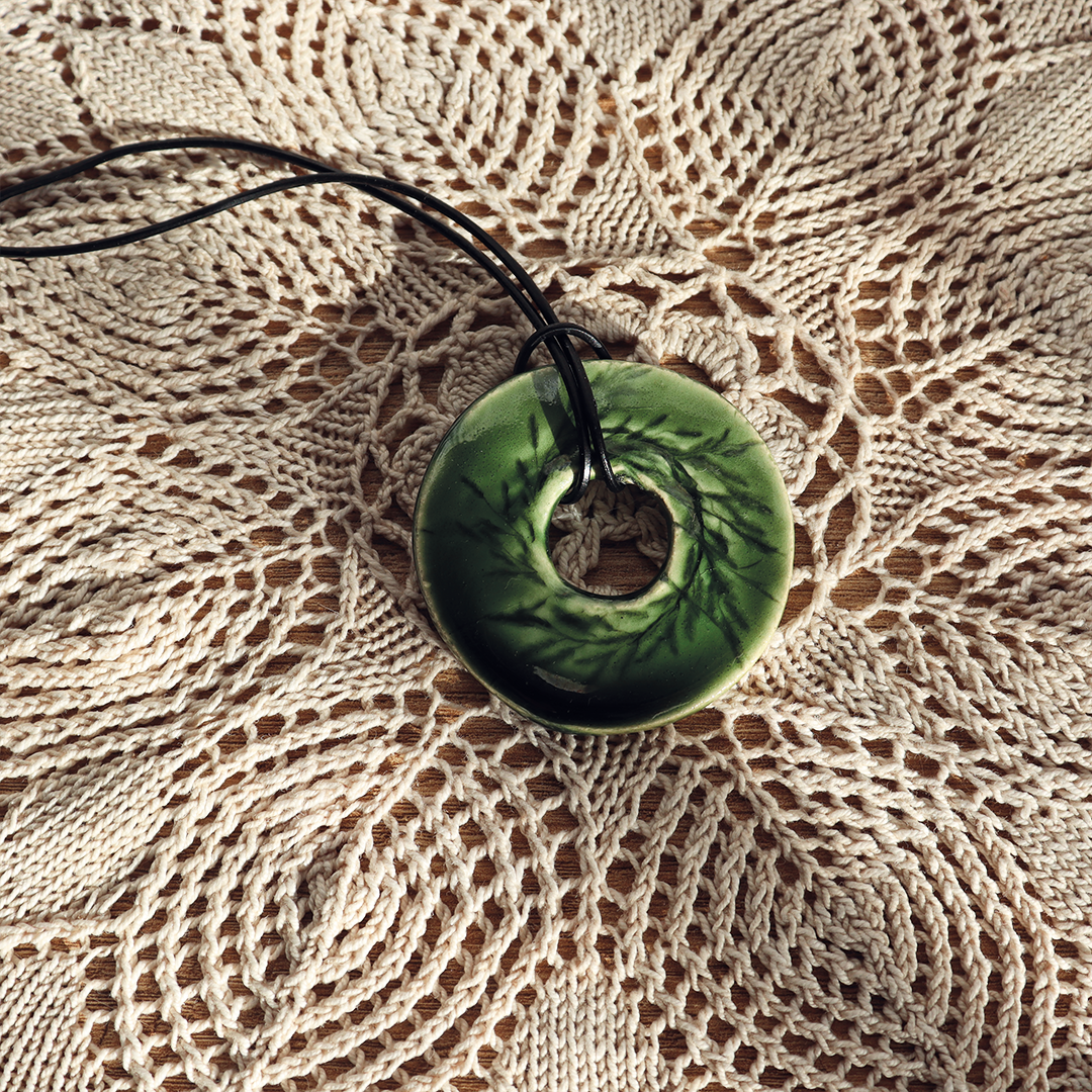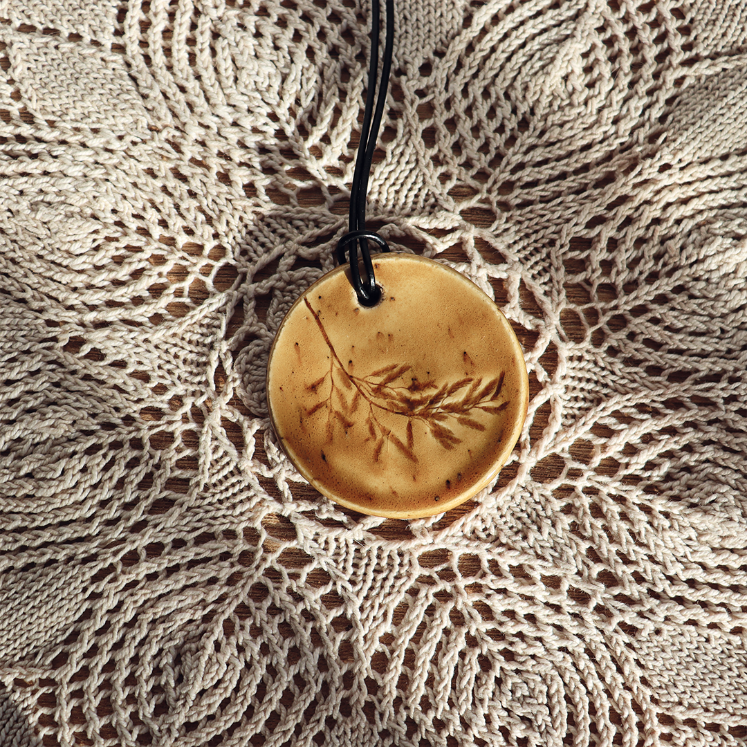 Ręcznie wykonany ceramiczny wisiorek na rzemieniu -Roślinka to połączenie sztuki i natury. Zdobiony subtelnym roślinnym wzorem, podkreśla piękno przyrody i unikalny charakter ręcznie wykonanej biżuterii. Dostępny w kształcie koła, łezki lub owalu, pasuje zarówno do codziennych, jak i eleganckich stylizacji. Wisiorki zostały pokryte pół-transparentnym szkliwem z efektem cracle (drobne pęknięcia) w kolorze zielonym lub miodowo-złotym, uwidaczniającym odciśnięty wzór. Wisiorki zawieszone zostały na naturalnym czarnym lub brązowym, rzemieniu o średnicy 1,5 mm.