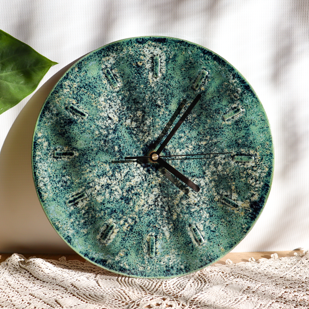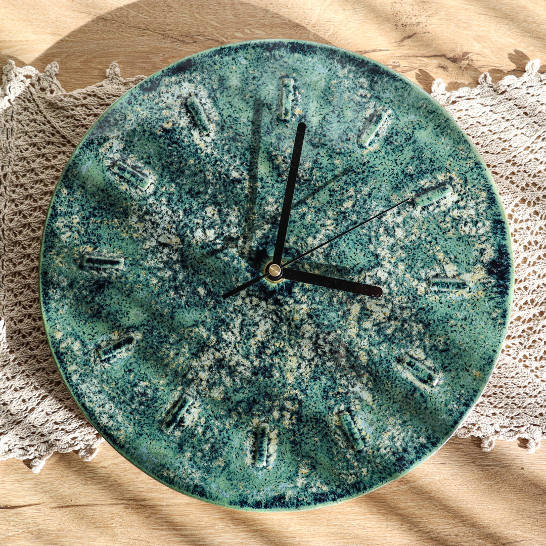 Oryginalny zegar z ręcznie wykonaną ceramiczną tarczą, pokrytą wielobarwnym szkliwem w eksplozji kolorów granatu i zielonego z przebłyskami srebra. Na tarczy zegara znajdują się wypukłe linie, wyznaczające godziny. Nasz duży ceramiczny zegar ścienny, to idealna ozdoba, która przyciągnie uwagę i urozmaici Twoje wnętrze.