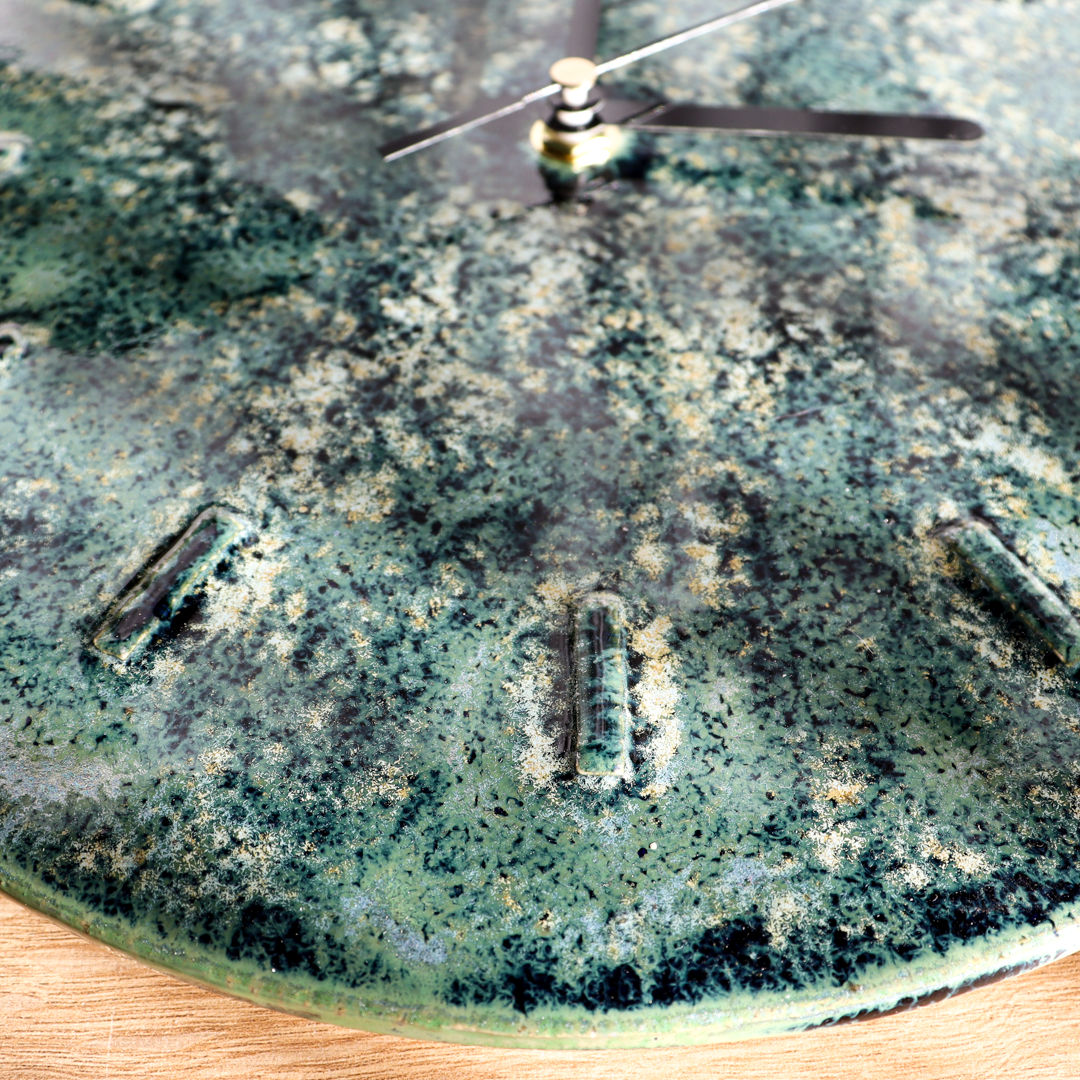 Oryginalny zegar z ręcznie wykonaną ceramiczną tarczą i średnicy 30 cm, pokrytą szkliwem w eksplozji kolorów granatu i zielonego z przebłyskami srebra. Na tarczy zegara znajdują się wypukłe linie, wyznaczające godziny.  Wyposażony został w bezgłośny mechanizm z czarnymi wskazówkami i złotym środkiem. Ten duży ceramiczny zegar ścienny, to idealna ozdoba, która przyciągnie uwagę i urozmaici Twoje wnętrze.