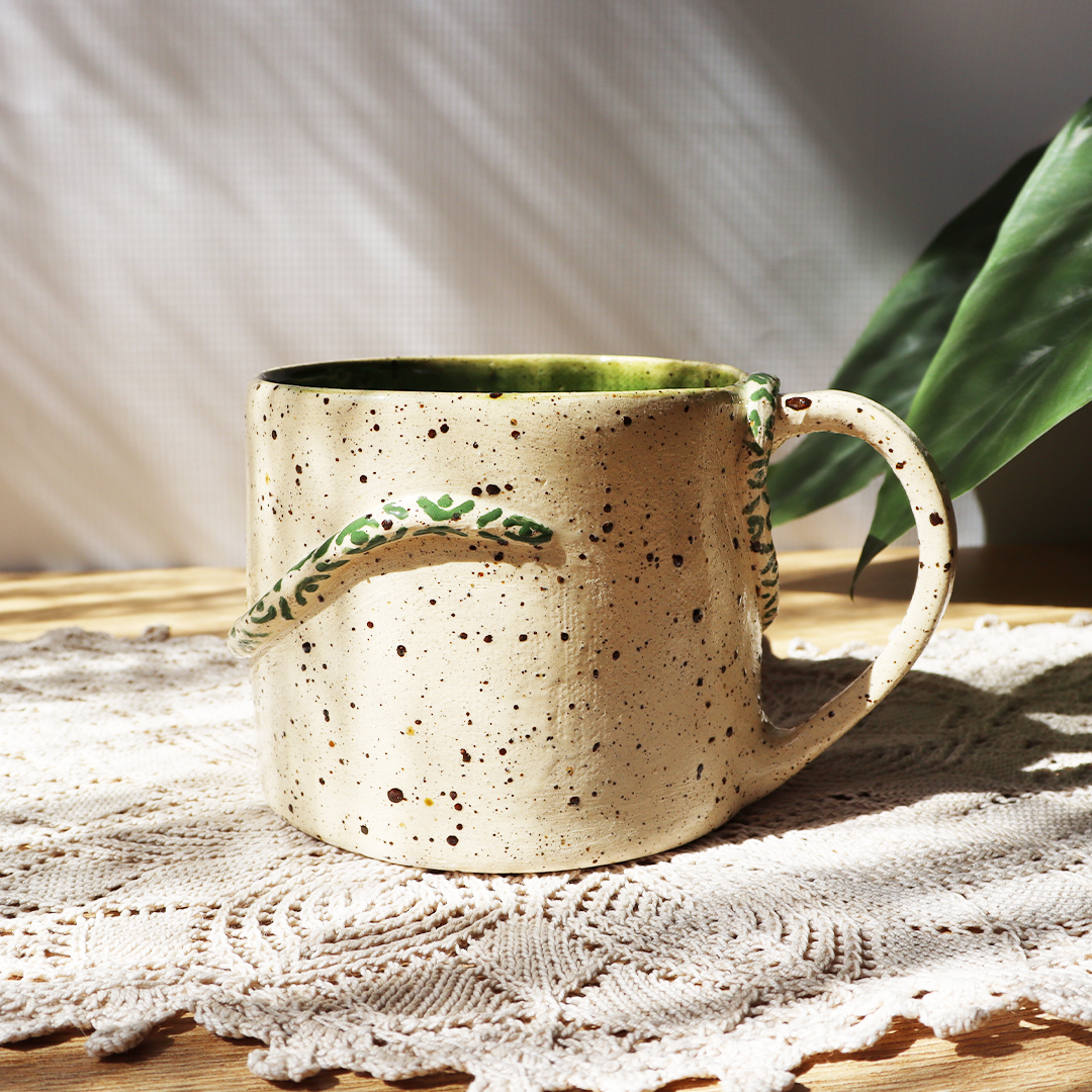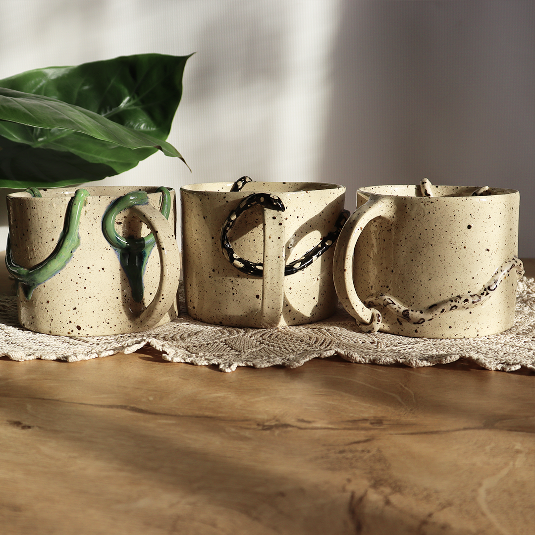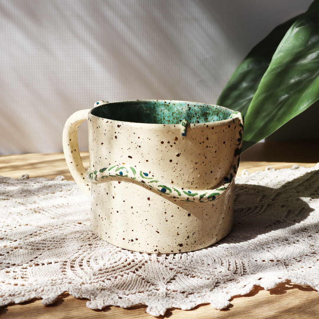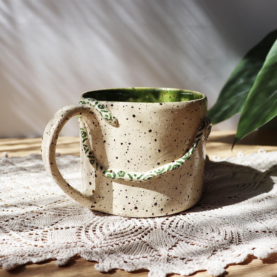 Dla fanów kawy i herbaty oraz wielbicieli oryginalnych kubków i węży, duży ceramiczny kubek z wężem o pojemności 550 ml. Ręcznie wykonany z beżowej gliny nakrapianej drobnymi brązowymi piegami, ozdobiony pełzającym po nim trójwymiarowym  wężem.