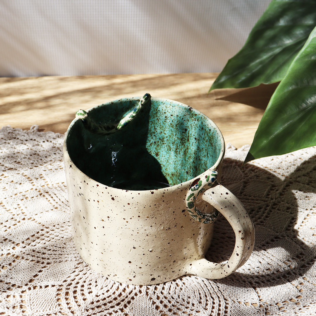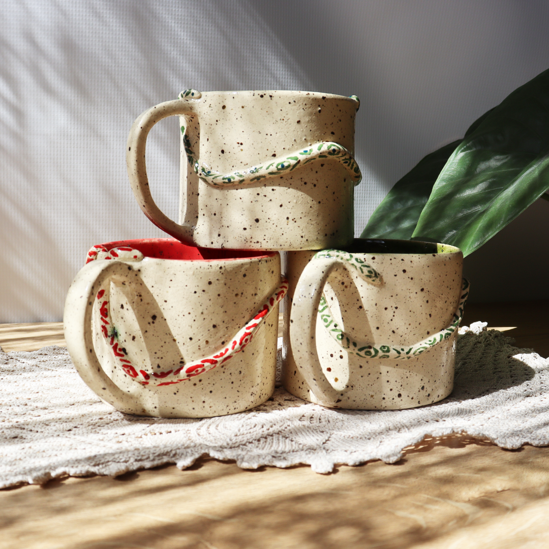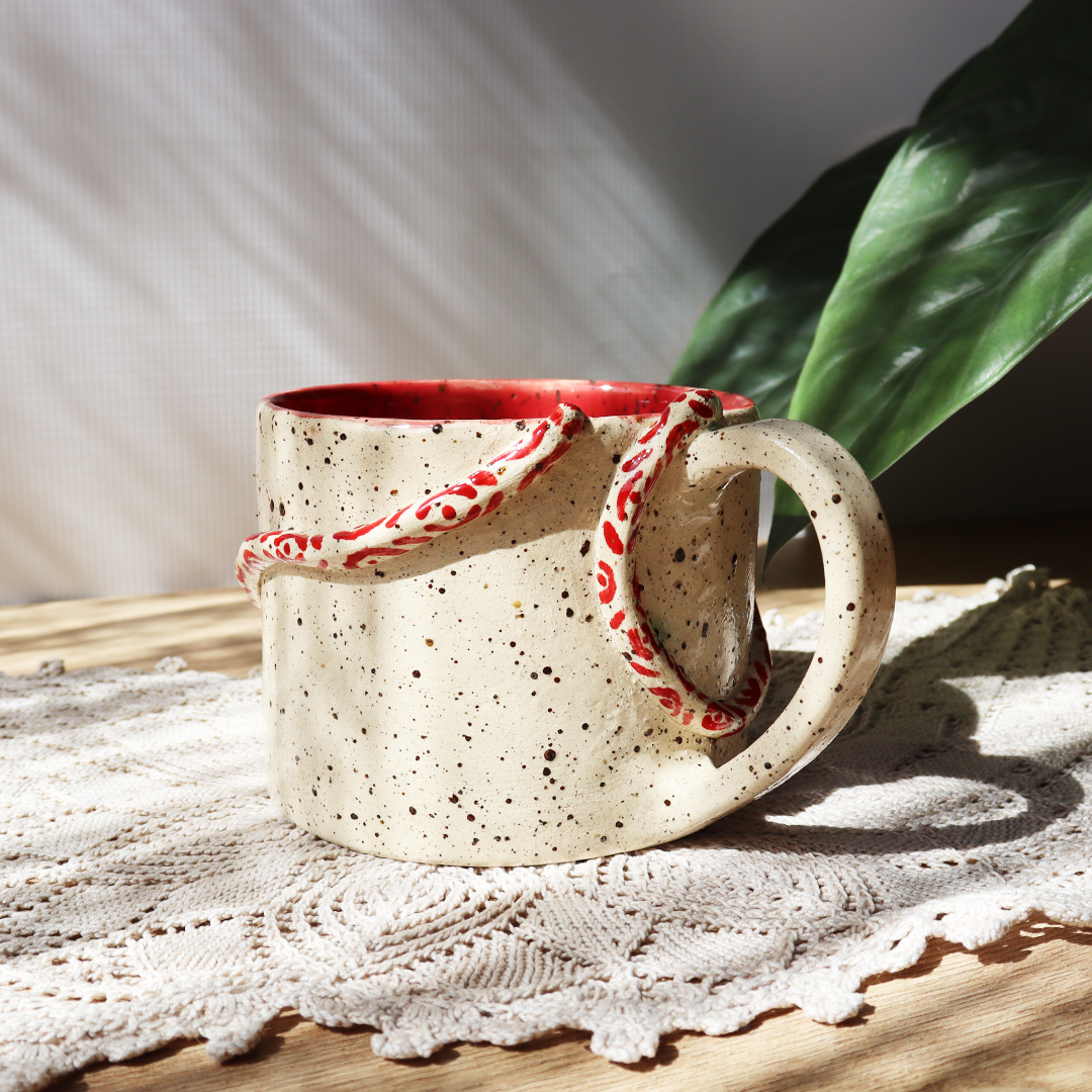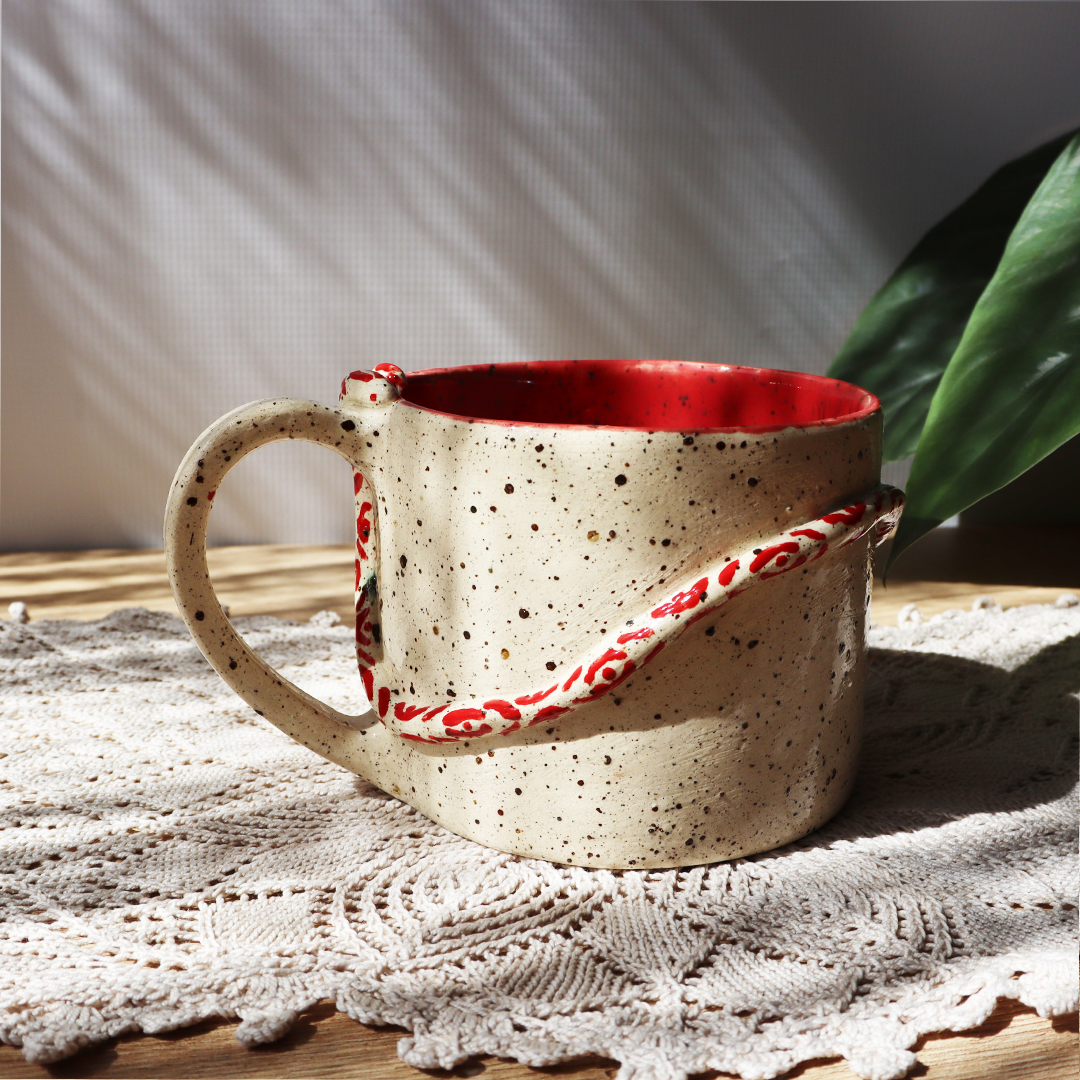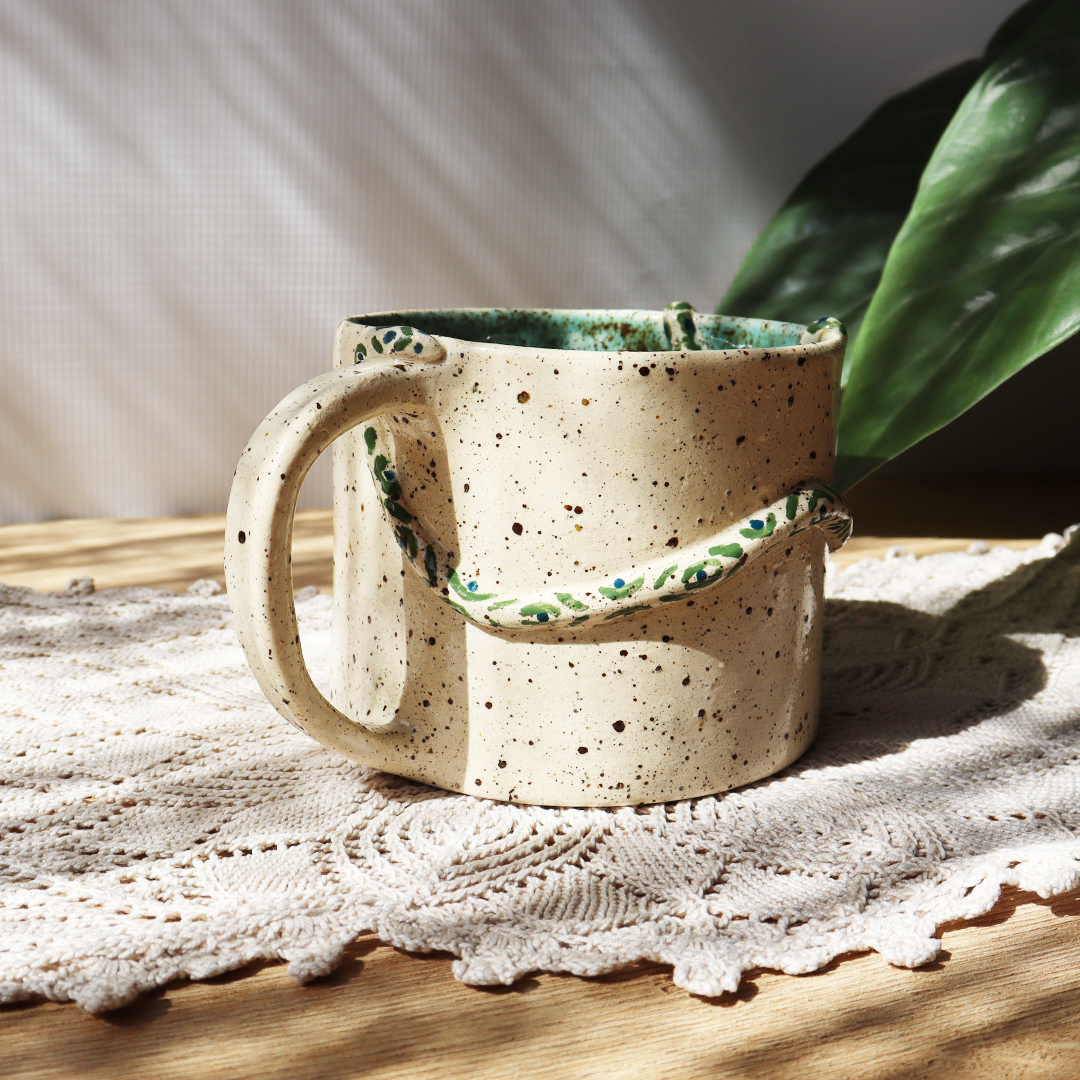 Dla fanów kawy i herbaty oraz wielbicieli oryginalnych kubków i węży, duży ceramiczny kubek z wężem o pojemności 550 ml. Ręcznie wykonany z beżowej gliny nakrapianej drobnymi brązowymi piegami, ozdobiony pełzającym po nim trójwymiarowym  wężem.