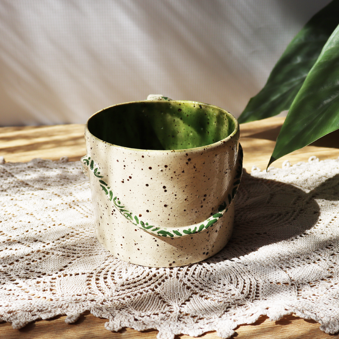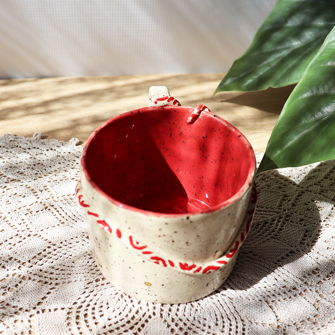 Dla prawdziwych wielbicieli oryginalnych kubków, duży ceramiczny kubek z wężem o pojemności 550 ml. Ręcznie wykonany z beżowej nakrapianej gliny ozdobiony pełzającym po nim trójwymiarowym wężem. Kubek ma duże ucho dzięki któremu idealnie leży w dłoni, a jego wymiary o średnicy około 10,5 cm i wysokości 9 cm pozwala na komfortowe delektowanie się ulubionym napojem.