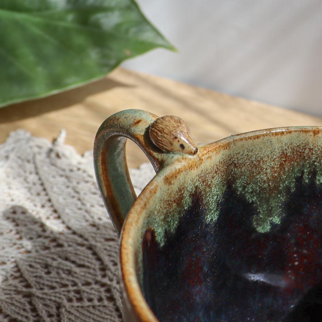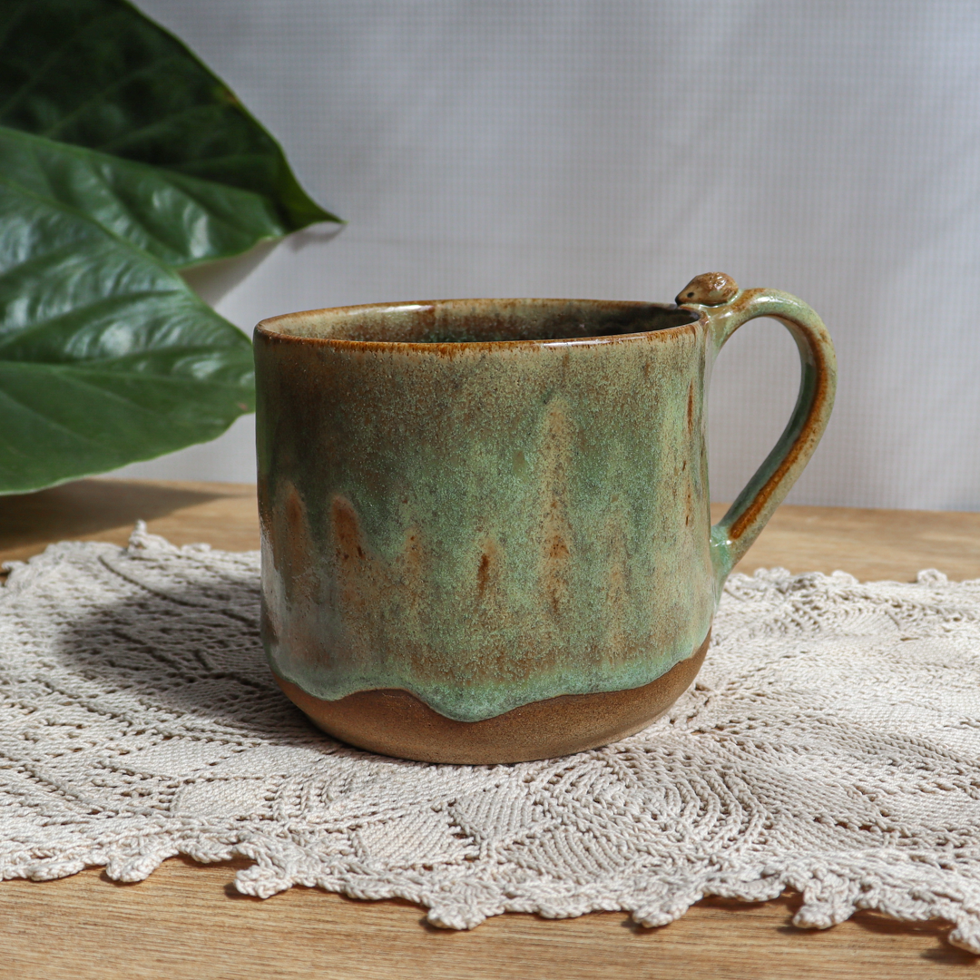 Dla fanów kawy i herbaty oraz wielbicieli oryginalnych kubków i zwierząt, duży kubek ceramiczny – Jeżyk o pojemności 600 ml. Ręcznie wykonany z ciemnobeżowej gliny, ozdobiony uroczym małym jeżykiem na uchu. Pokryty na zewnątrz zielonym szkliwem i brązowym w środku. Kubek ma duże ucho dzięki któremu idealnie leży w dłoni, a jego wymiary o średnicy około 11 cm i wysokości 9 cm pozwala na komfortowe delektowanie się ulubionym napojem.
