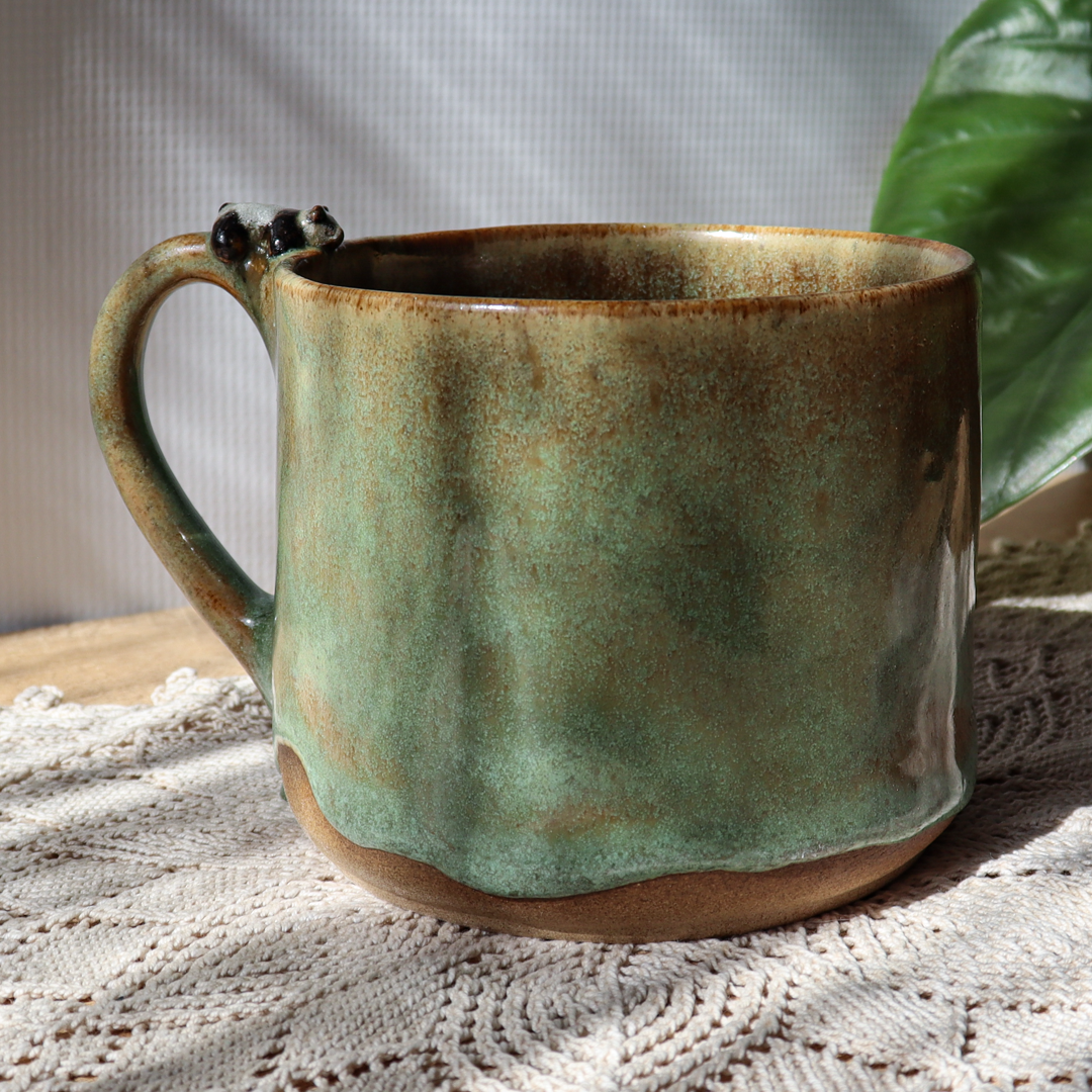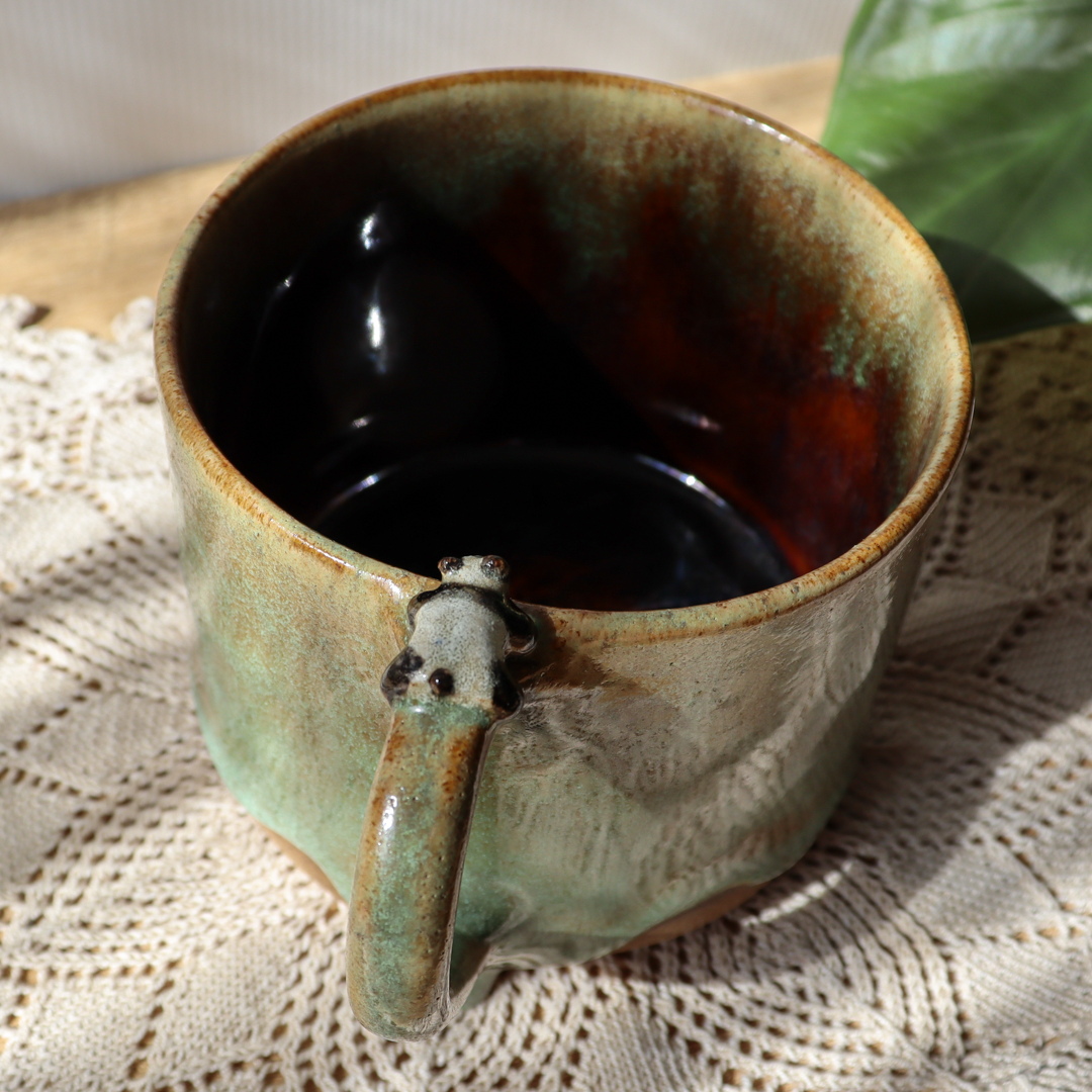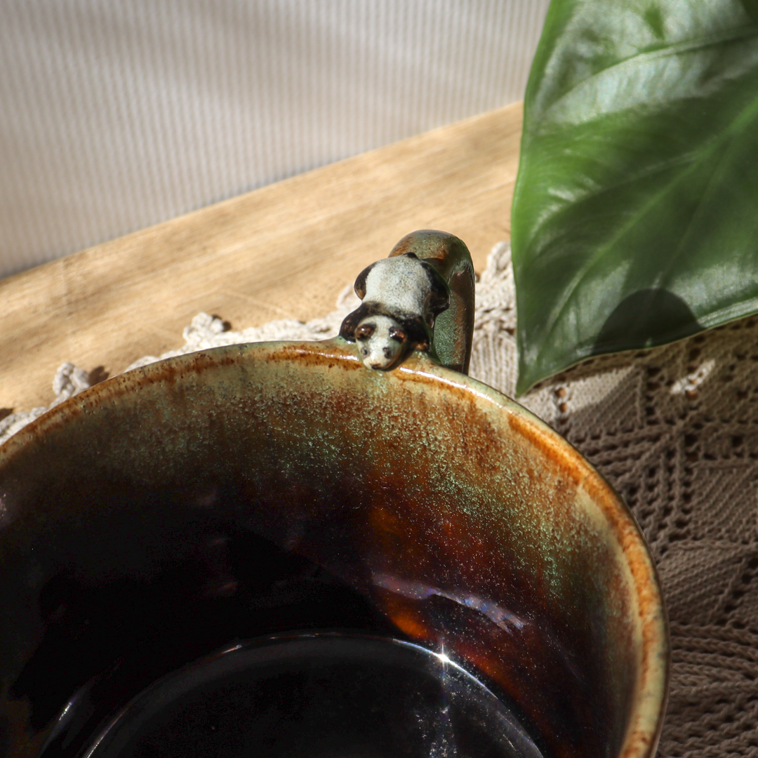Dla prawdziwych wielbicieli oryginalnych kubków, duży kubek ceramiczny – Panda o pojemności 600 ml. Ręcznie wykonany, ozdobiony uroczą pandą leżącą na uchu. Pokryty w środku brązowym i na zewnątrz mieszanką zielonego szkliwa tworzącą ciekawy efekt. Kubek ma duże ucho dzięki któremu idealnie leży w dłoni, a jego wymiary o średnicy 11 cm i wysokości 9 cm pozwala na komfortowe delektowanie się ulubionym napojem.