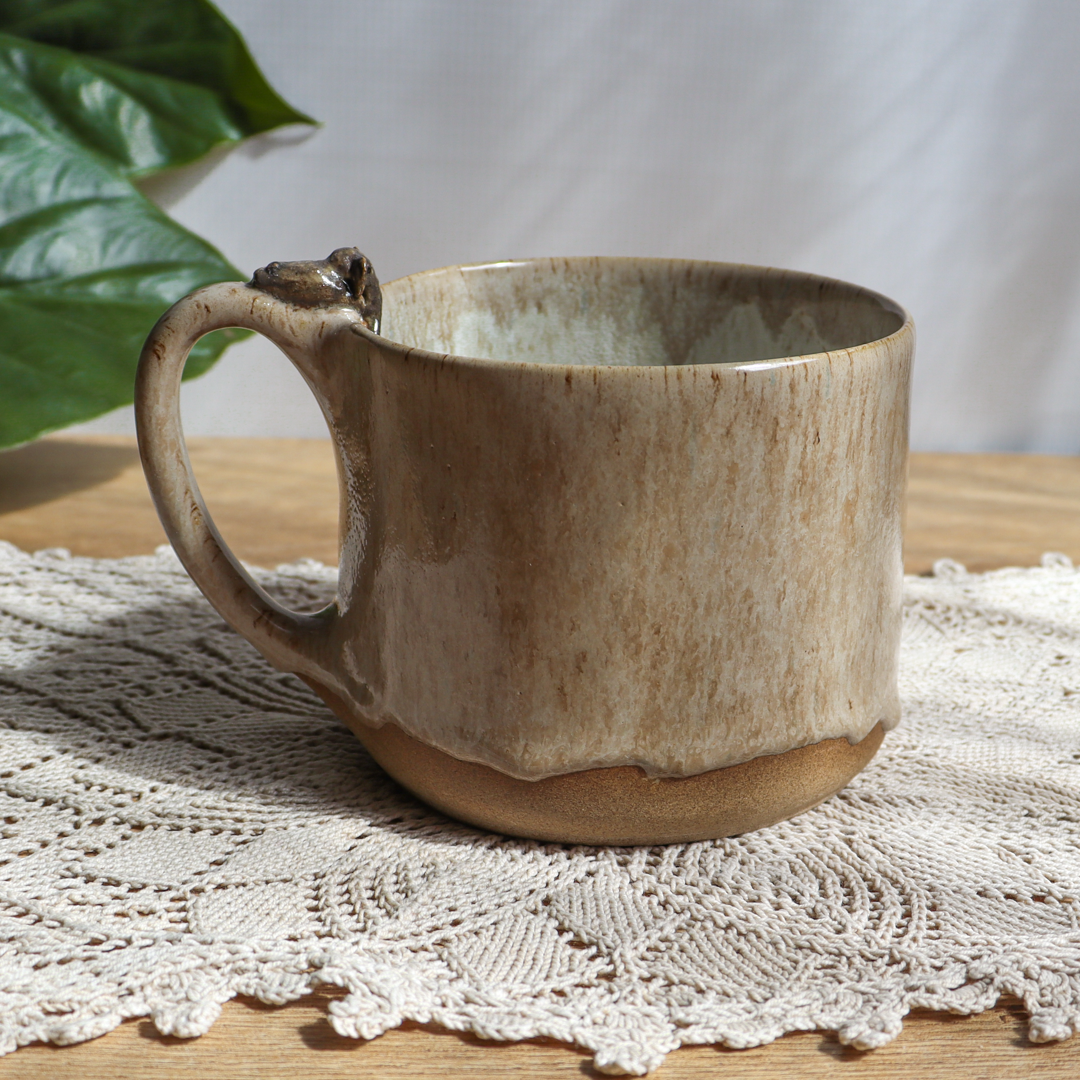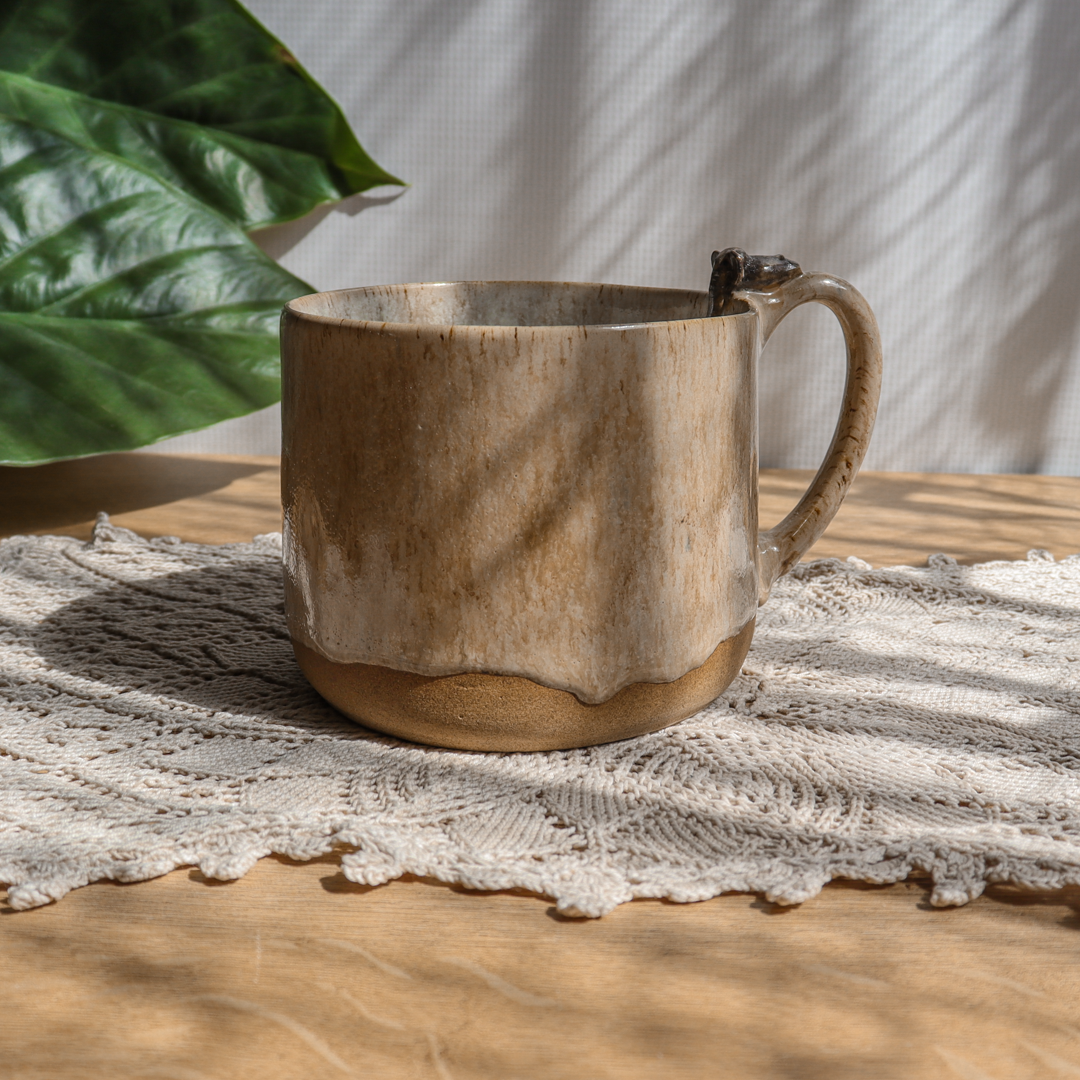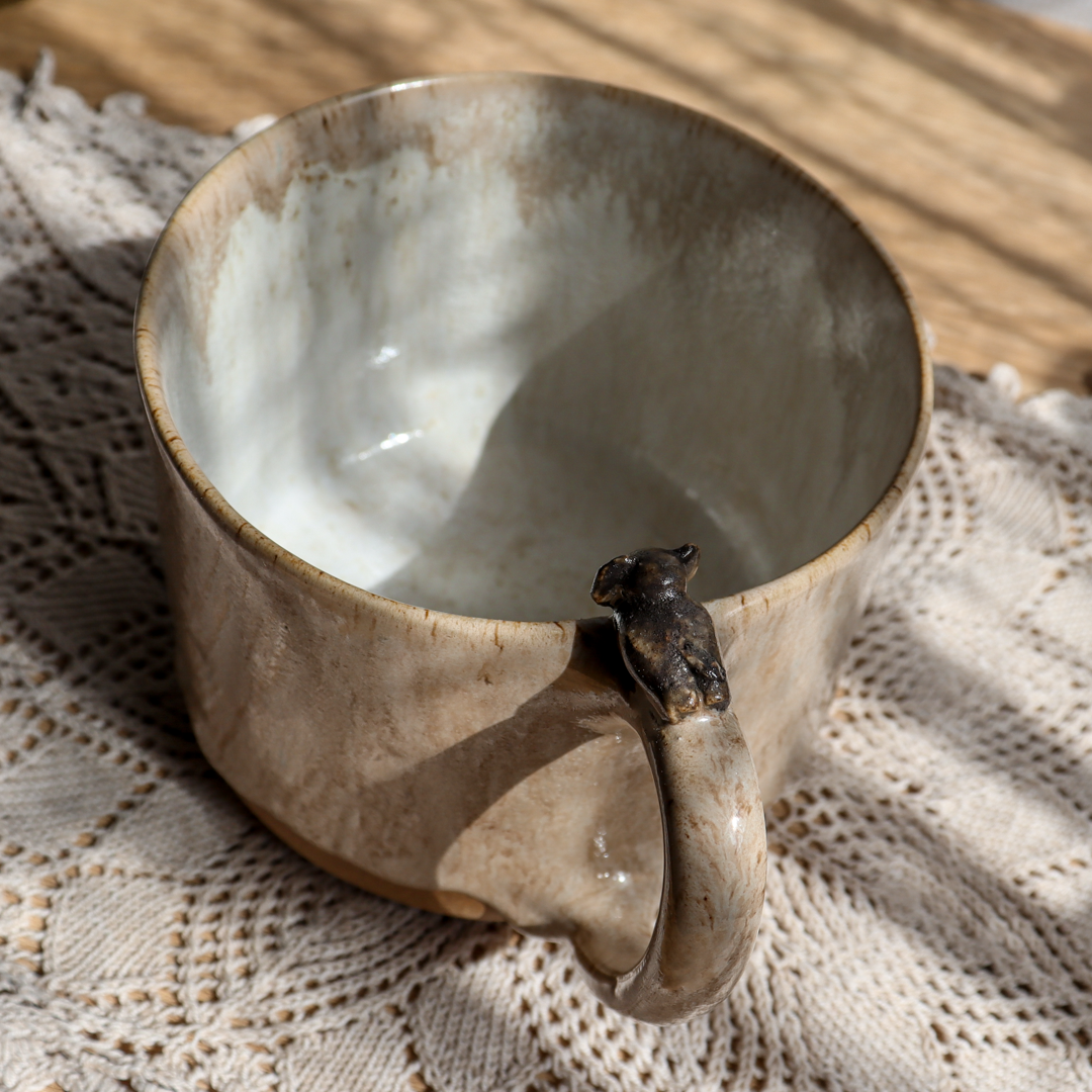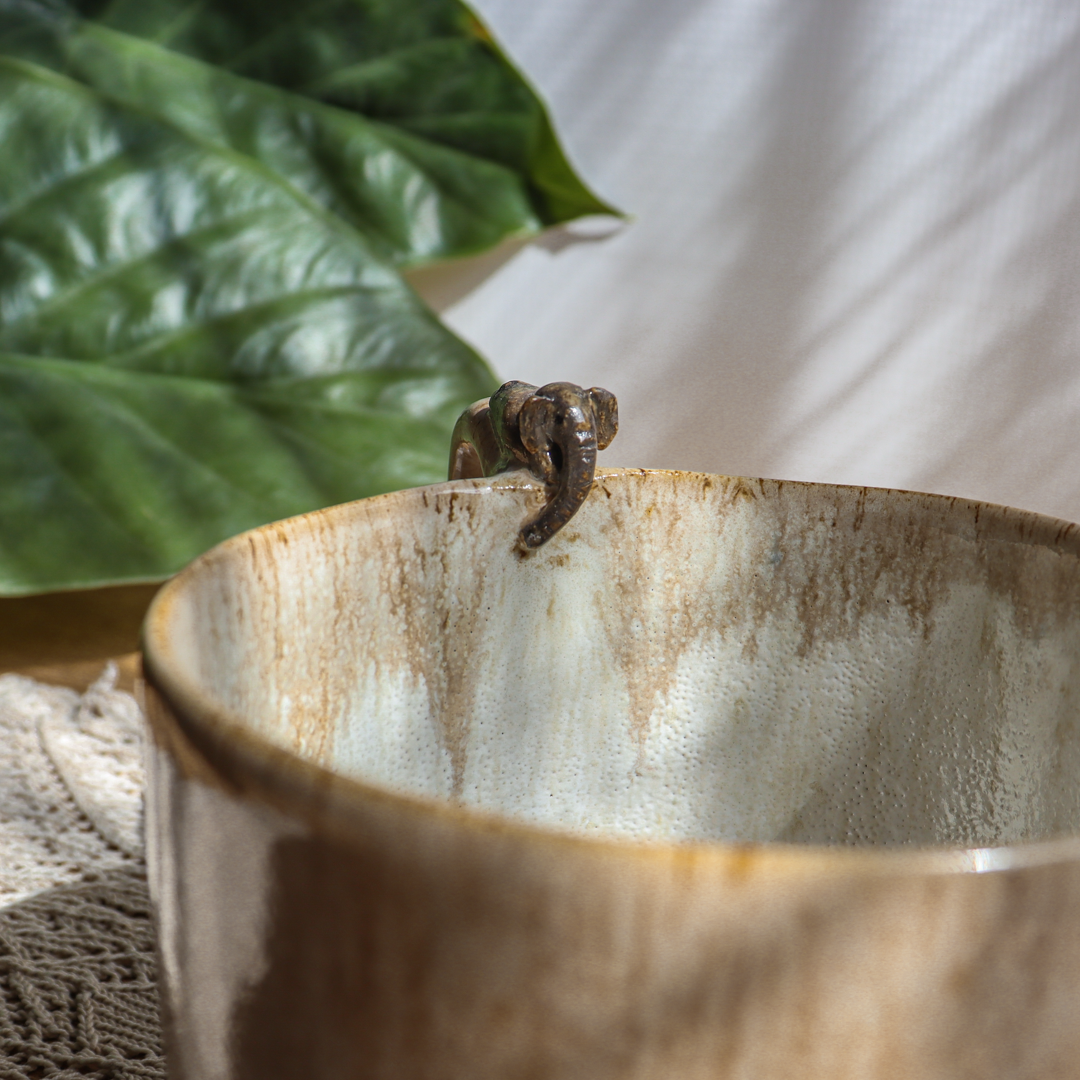 Dla prawdziwych wielbicieli oryginalnych kubków, duży kubek ceramiczny – Słoń o pojemności 600 ml. Ręcznie wykonany z jasnobrązowej gliny, ozdobiony szarym słonikiem leżącym na uchu. Pokryty w środku białym i na zewnątrz beżowym szkliwem z ciemniejszymi drobinami. Kubek ma duże ucho dzięki któremu idealnie leży w dłoni, a jego wymiary o średnicy 11 cm i wysokości 9 cm pozwala na komfortowe delektowanie się ulubionym napojem.