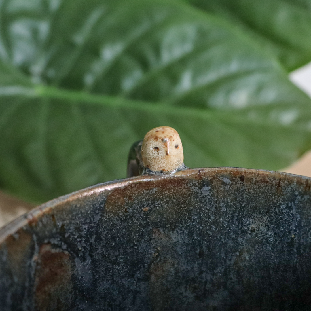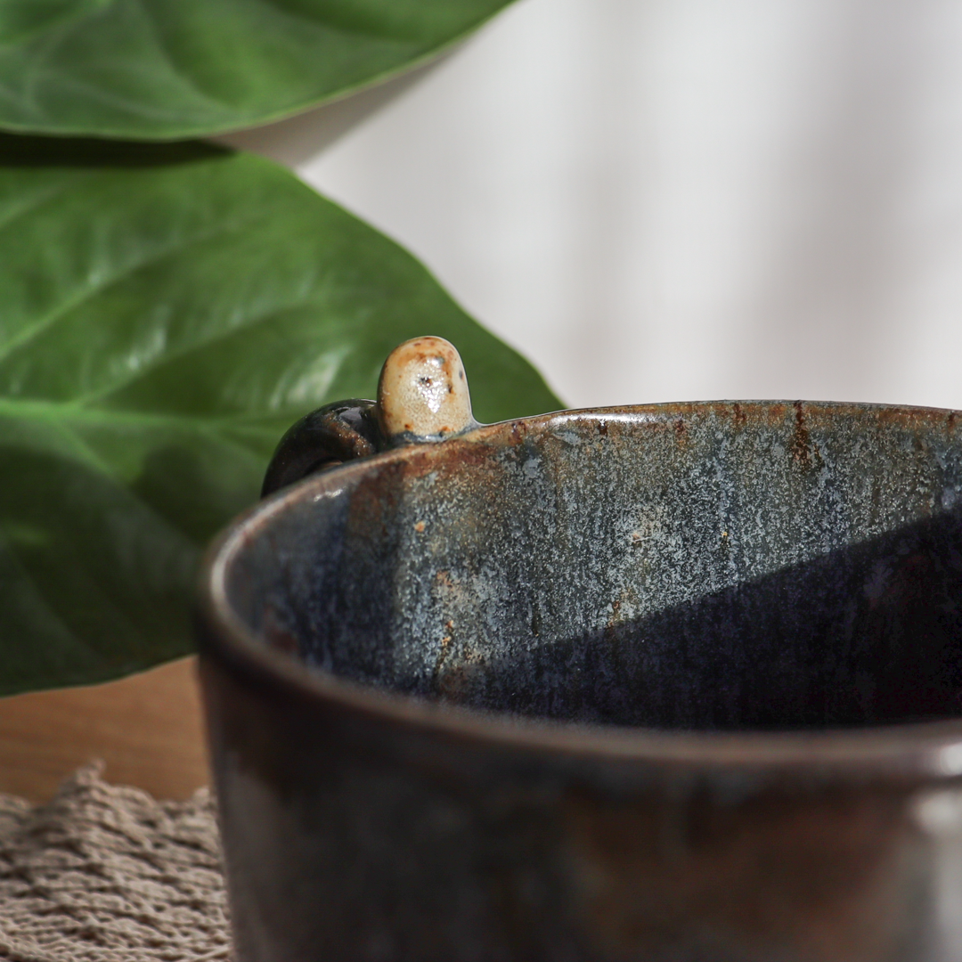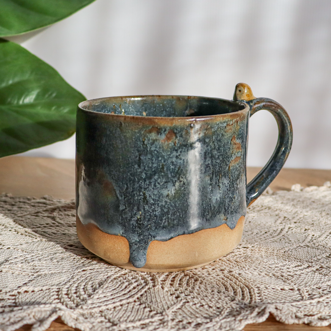 Dla prawdziwych wielbicieli oryginalnych kubków, duży kubek ceramiczny – Sowa o pojemności 600 ml. Ręcznie wykonany z ciemnobeżowej gliny, ozdobiony trójwymiarową uroczą sówką siedzącą na uchu. Pokryty spływającym granatowym szkliwem z beżowymi drobinkami. Kubek ma duże ucho dzięki któremu idealnie leży w dłoni, a jego wymiary o średnicy 11 cm i wysokości 9 cm pozwala na komfortowe delektowanie się ulubionym napojem.