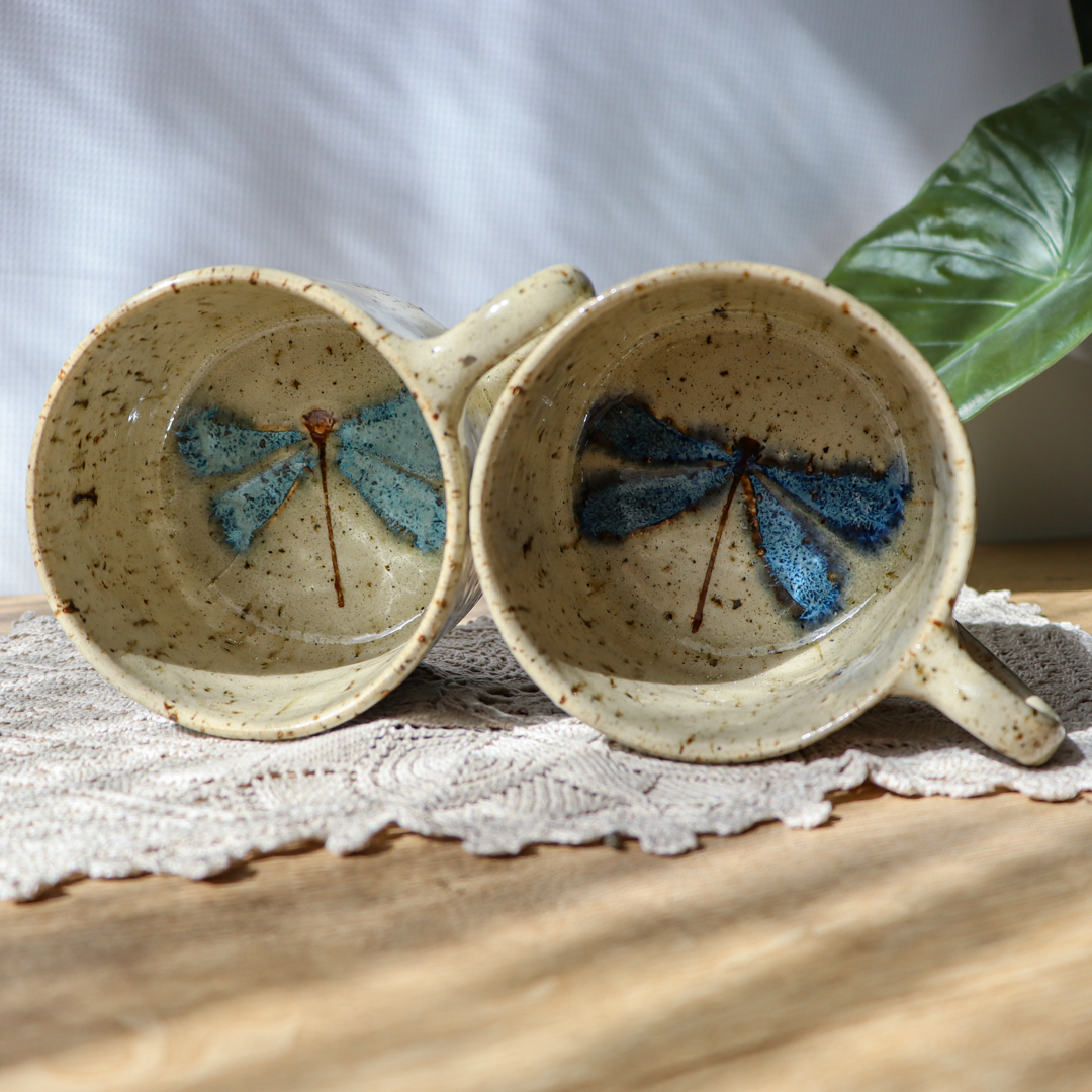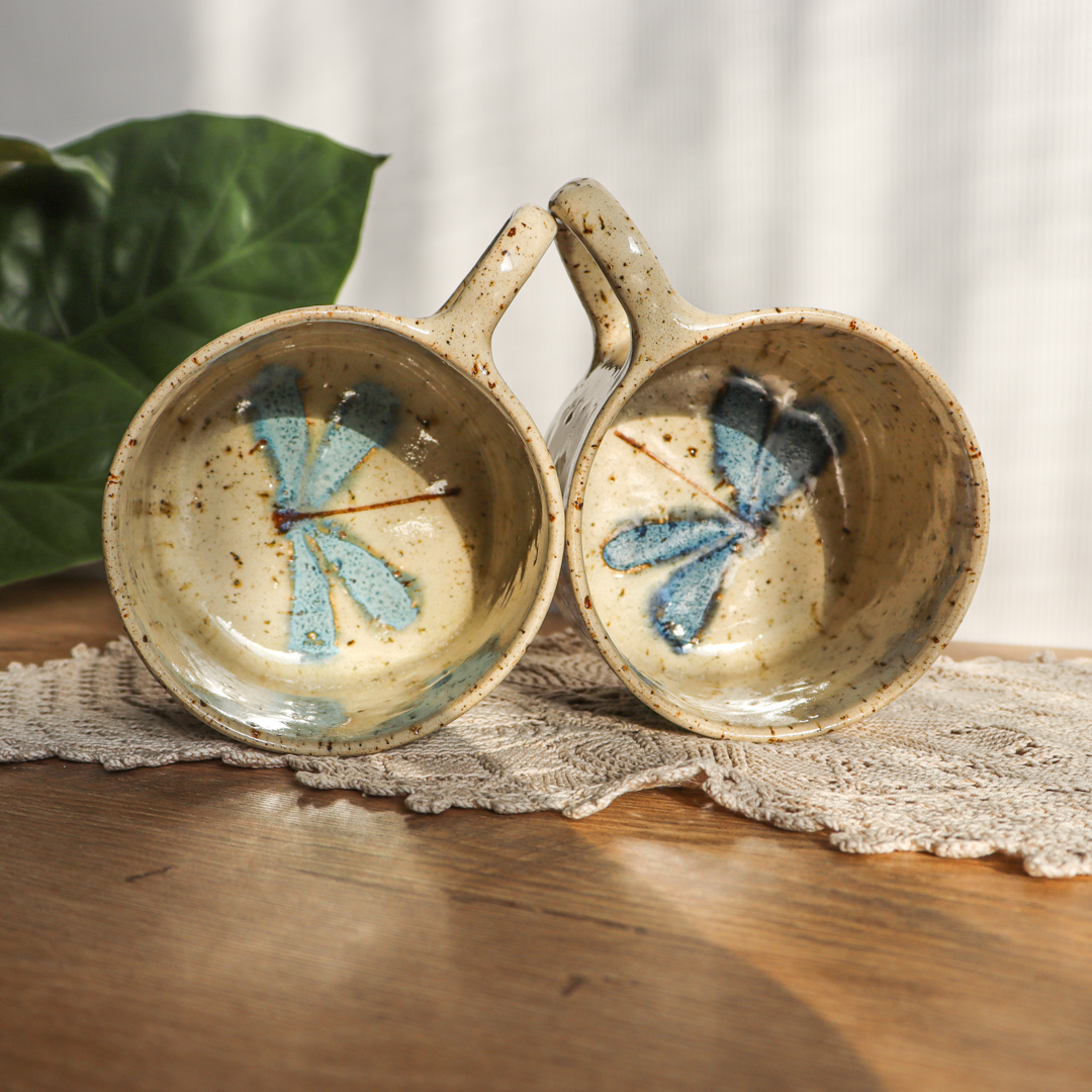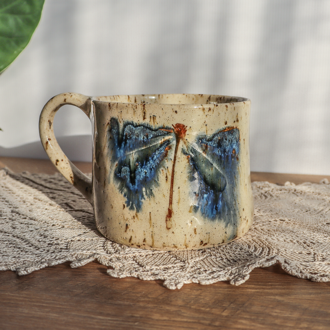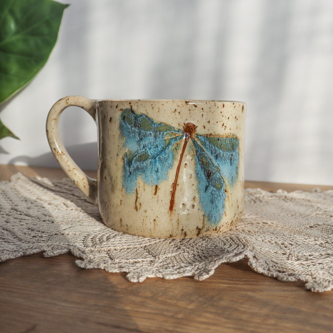 Dla prawdziwych wielbicieli oryginalnych kubków przedstawiamy, duży kubek ceramiczny – Ważki 600 ml. Ręcznie wykonany z jasnobeżowej gliny charakteryzującej się brązowymi plamkami/ „piegami”. Ozdobiliśmy go na ściankach i na dnie wzorami ważki które tworzą niepowtarzalny efekt. Kubek ma duże ucho dzięki któremu idealnie leży w dłoni, a jego wymiary o średnicy 11 cm i wysokości 9 cm pozwala na komfortowe delektowanie się ulubionym napojem.
