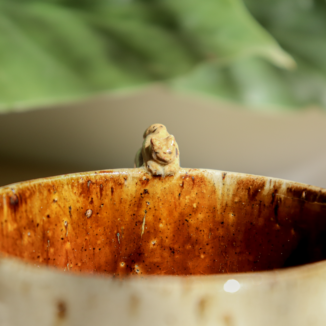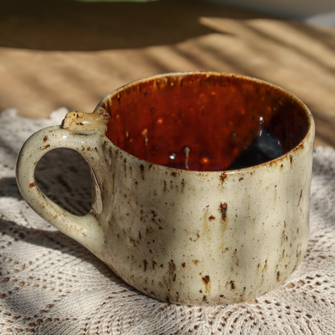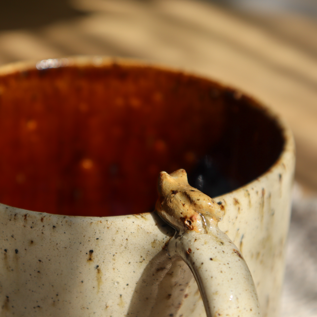 Dla prawdziwych wielbicieli oryginalnych kubeczków przedstawiamy, mały kubeczek ceramiczny – Kotek o pojemności 300 ml. Ręcznie wykonany z beżowej piegowatej gliny i ozdobiony leżącym na uchu małym, ceramicznym, beżowym kotkiem. Pokryty w środku bursztynowym, brązowym szkliwem z niebieskimi drobinkami. Kubek ma duże ucho dzięki któremu idealnie leży w dłoni, a jego wymiary o średnicy 9.5 cm i wysokości 7 cm pozwala na komfortowe delektowanie się ulubionym napojem.