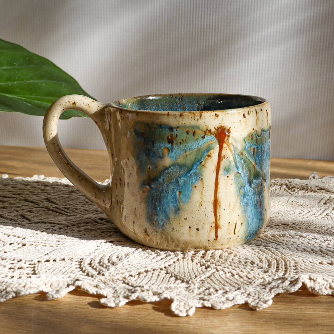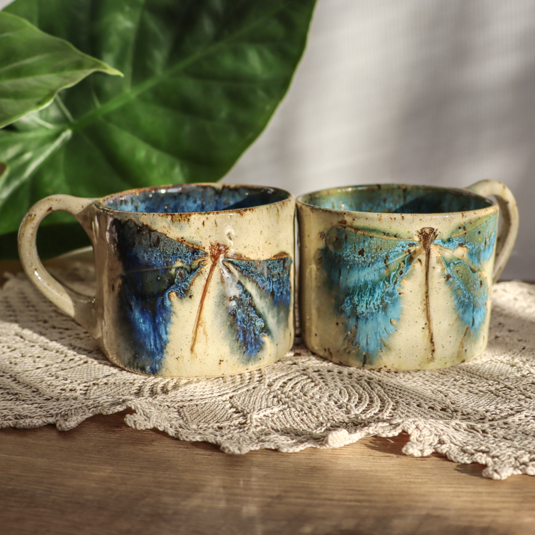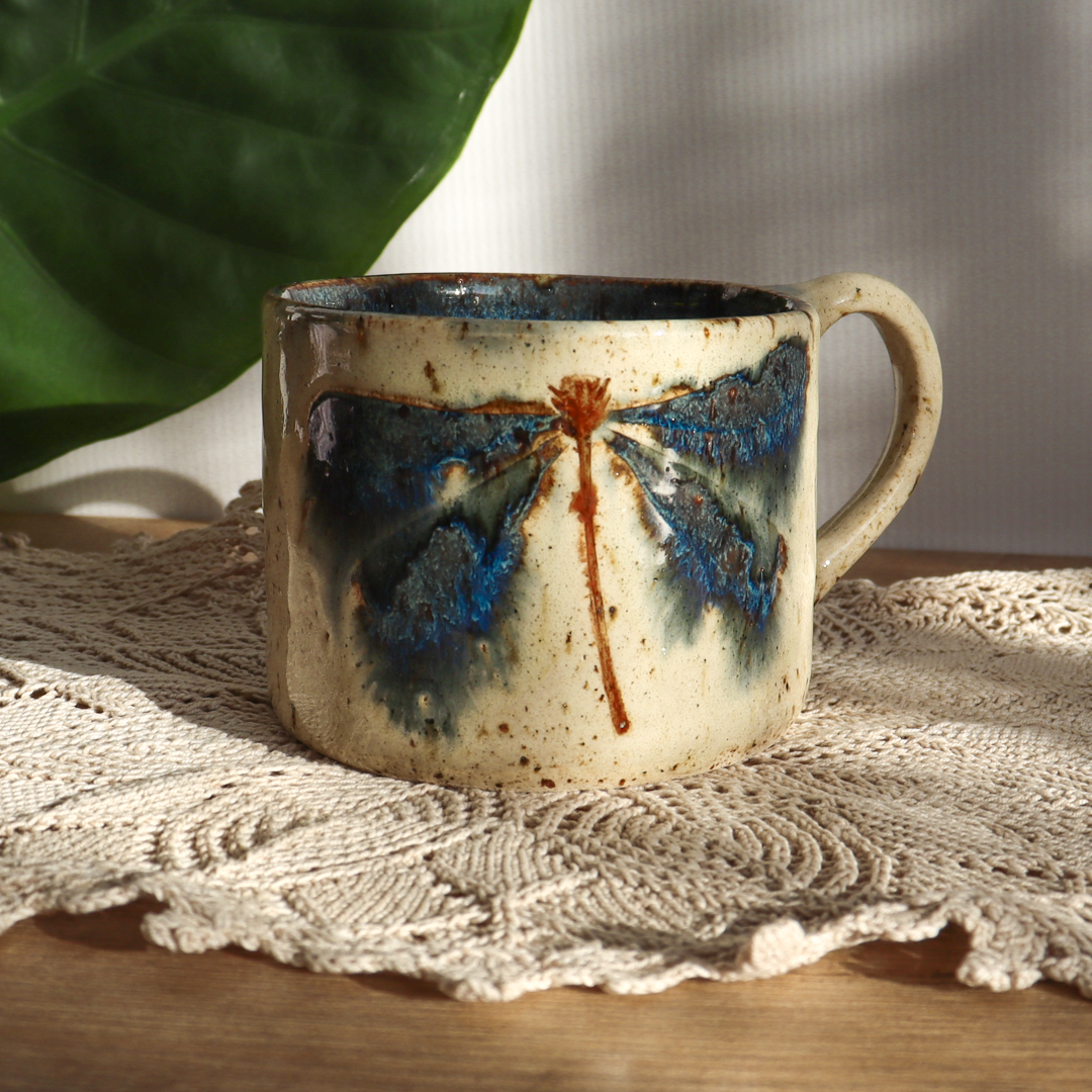 Dla prawdziwych wielbicieli oryginalnych kubeczków, mały kubeczek ceramiczny – Ważka o pojemności 300 ml. Ręcznie wykonany z jasnobeżowej gliny, charakteryzującej się brązowymi piegami. Ozdobiony odciśniętymi na ściance wzorami ważki pokrytymi niebiesko-zielonym, granatowym lub różowym szkliwem. Kubek ma duże ucho dzięki któremu idealnie leży w dłoni, a jego wymiary o średnicy 9 cm i wysokości 7 cm pozwala na komfortowe delektowanie się ulubionym napojem.