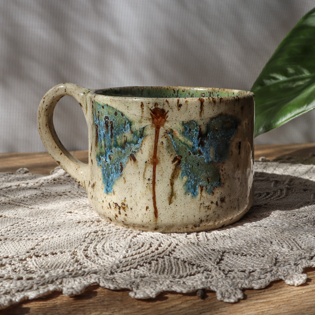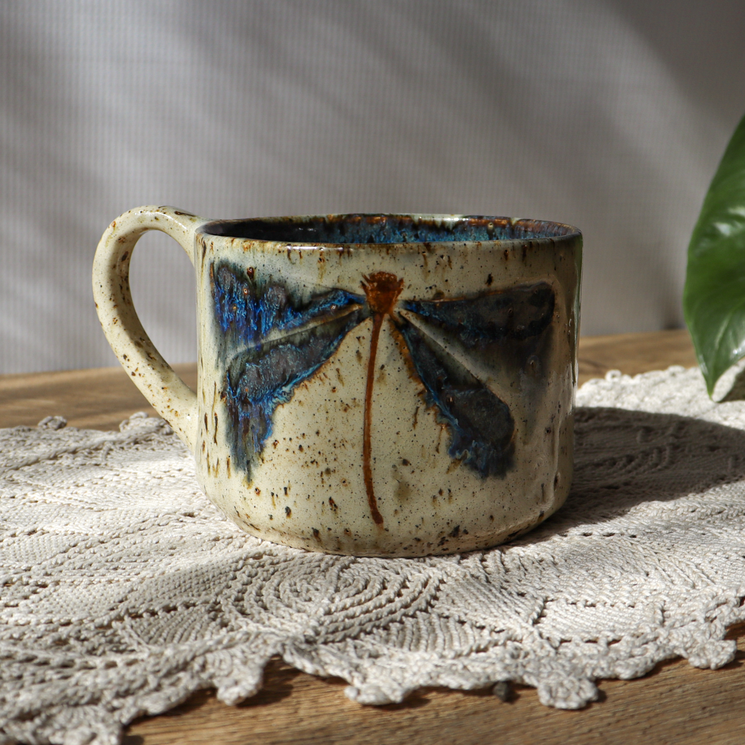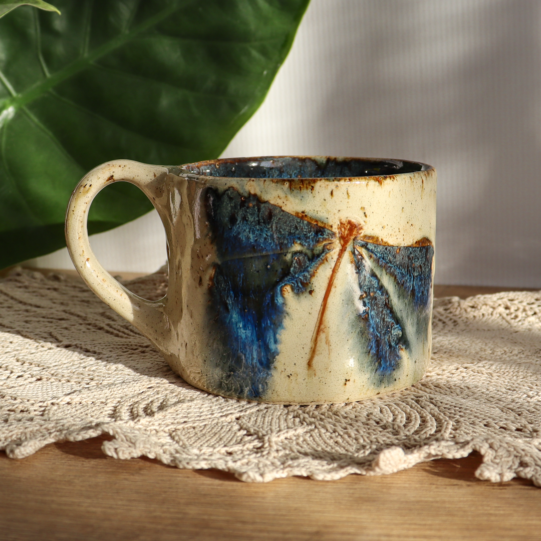 Dla prawdziwych wielbicieli oryginalnych kubeczków, mały kubeczek ceramiczny – Ważka o pojemności 300 ml. Ręcznie wykonany z jasnobeżowej gliny, charakteryzującej się brązowymi piegami. Ozdobiony odciśniętymi na ściance wzorami ważki pokrytymi niebiesko-zielonym, granatowym lub różowym szkliwem. Kubek ma duże ucho dzięki któremu idealnie leży w dłoni, a jego wymiary o średnicy 9 cm i wysokości 7 cm pozwala na komfortowe delektowanie się ulubionym napojem.