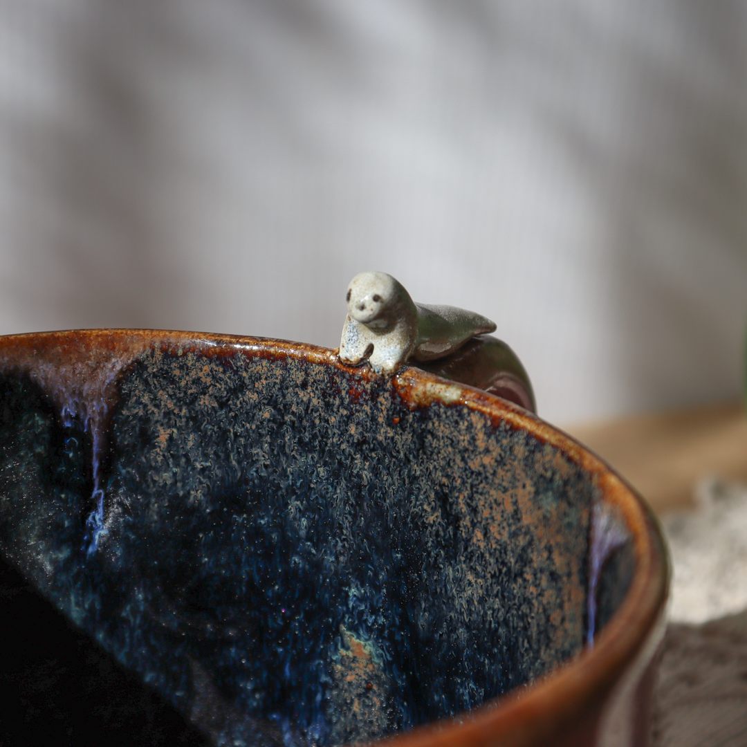 Dla prawdziwych wielbicieli oryginalnych kubków i zwierzątek, kubek ceramiczny – Foka z rybką o pojemności 300 ml. Ręcznie wykonany z beżowej gliny i ozdobiony uroczą, białą foką leżącą na uchu i patrzącą na pływającą na dnie rybką. Pokryty granatowo-niebieskim szkliwem w środku i różowym spływającym szkliwem na ściankach. Kubek ma duże ucho dzięki któremu idealnie leży w dłoni, a jego wymiary o średnicy 9,5 cm i wysokości 7 cm pozwala na komfortowe delektowanie się ulubionym napojem.