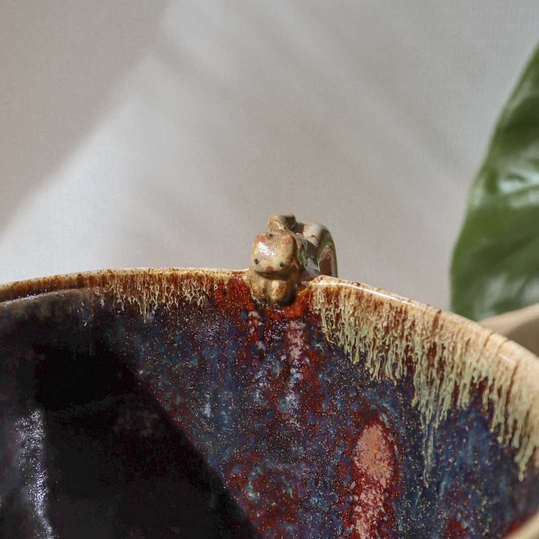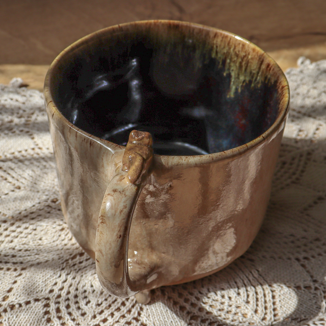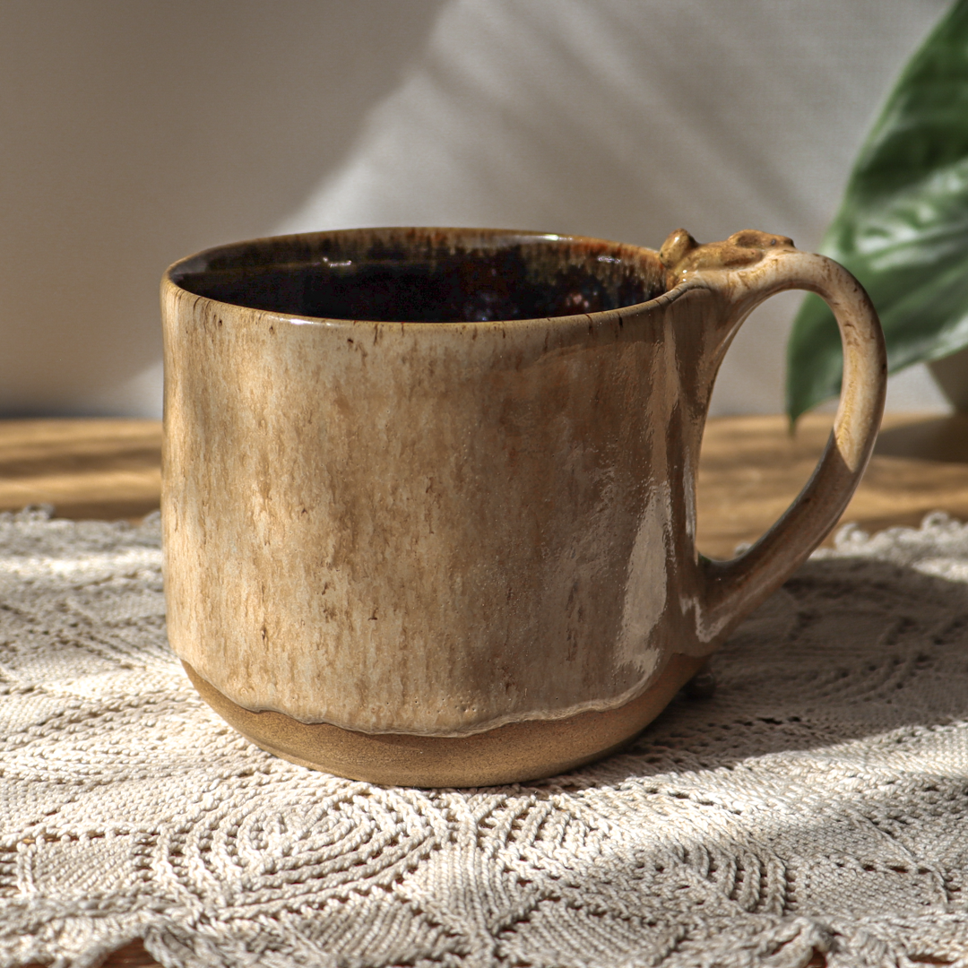 Dla prawdziwych wielbicieli oryginalnych kubków, kubek ceramiczny – Kotek o pojemności 600 ml. Ręcznie wykonany i ozdobiony uroczym łaciatym kotkiem leżącym na uchu. Pokryty w środku ciemnym brązowym szkliwem i na zewnątrz beżowym szkliwem z ciemniejszymi drobinkami, tworzącymi ciekawy efekt. Kubek ma duże ucho dzięki któremu idealnie leży w dłoni, a jego wymiary o średnicy 11 cm i wysokości 9 cm pozwalają na komfortowe delektowanie się ulubionym napojem.