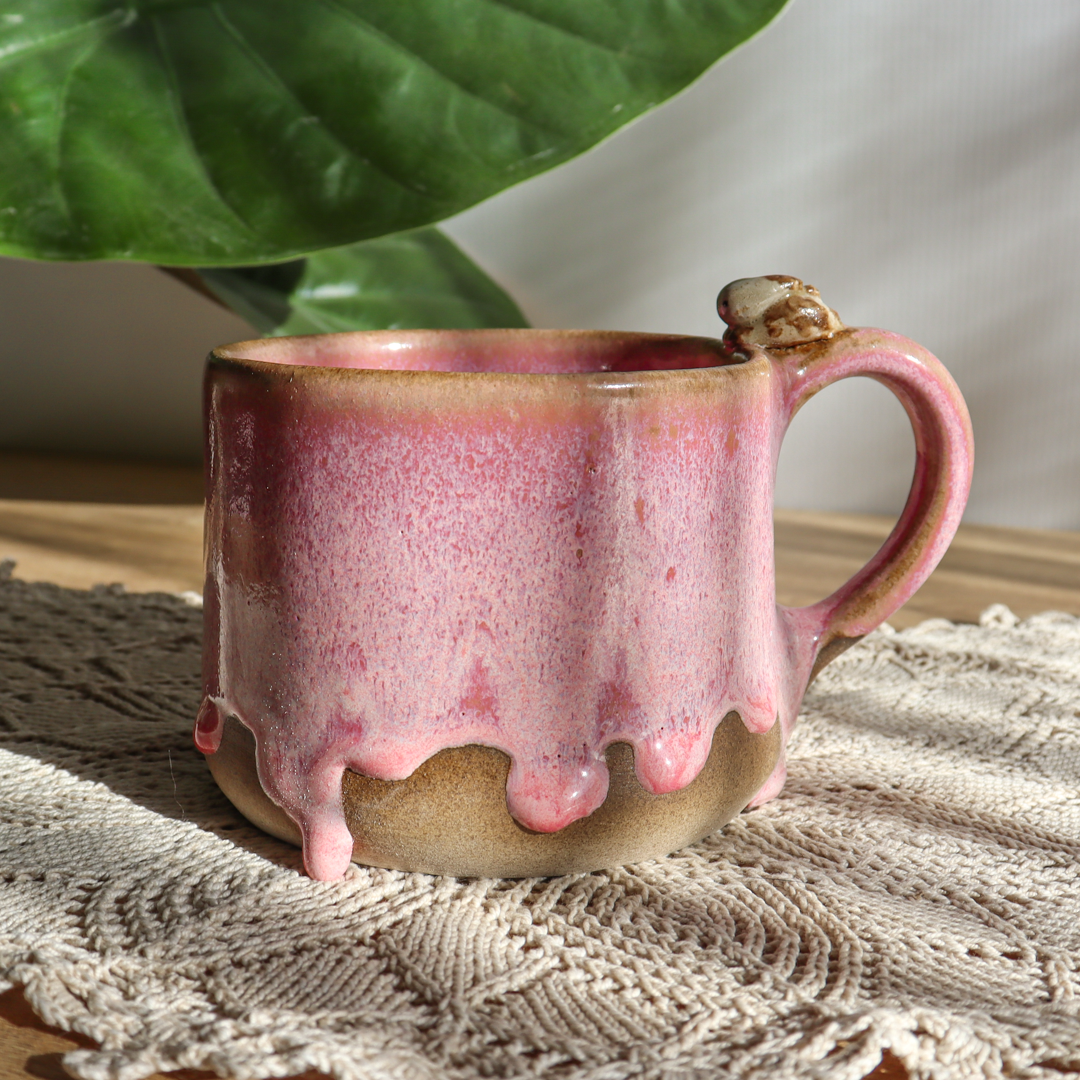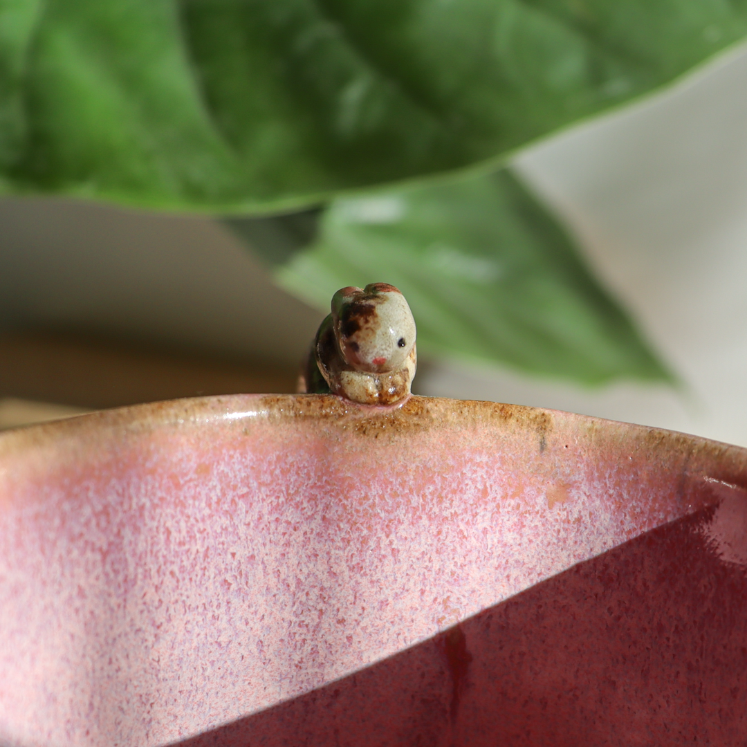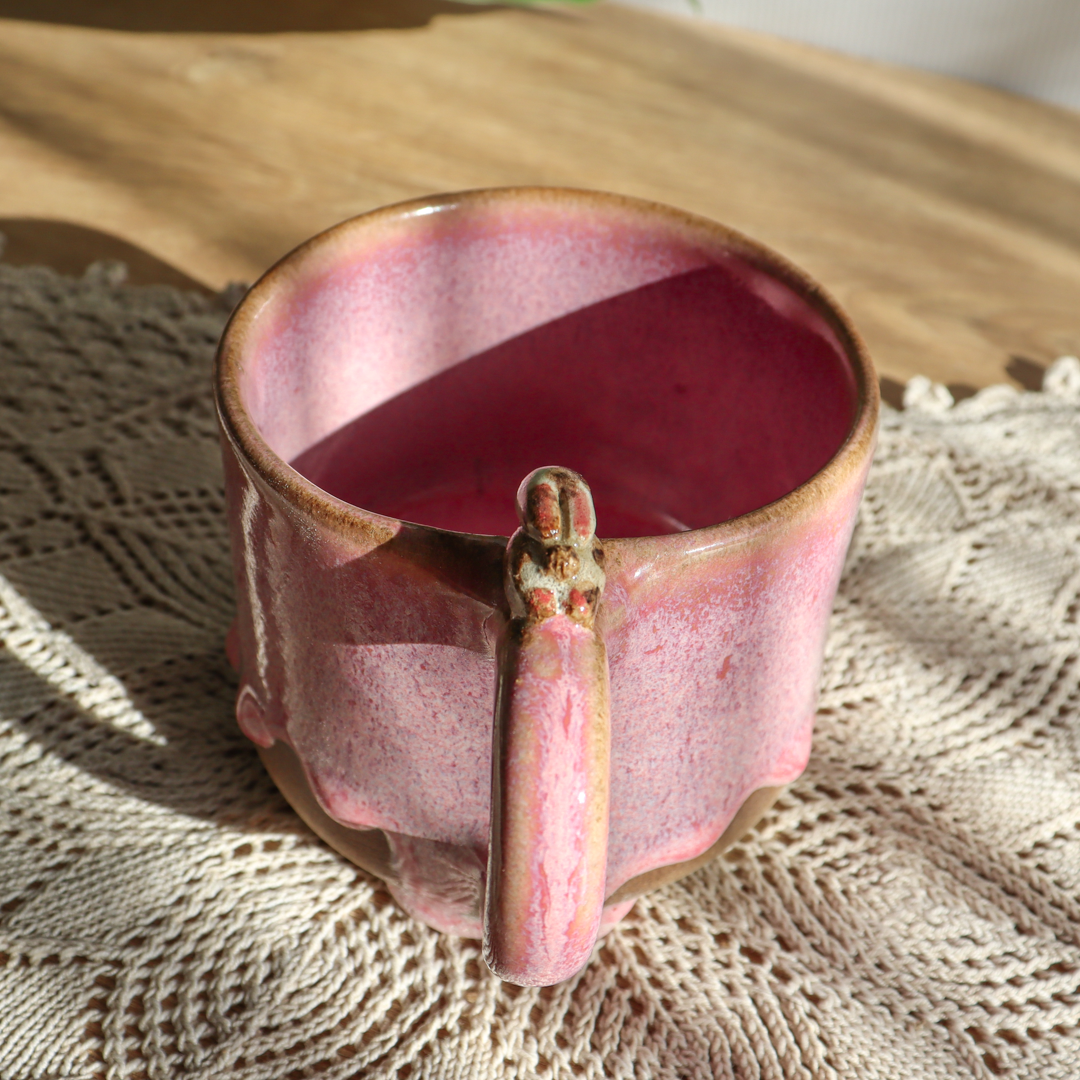 Dla prawdziwych wielbicieli oryginalnych kubków, kubek ceramiczny – Króliczek o pojemności 300 ml. Ręcznie wykonany z beżowej gliny i ozdobiony uroczym beżowym króliczkiem leżącym na uchu. Pokryty spływającym różowym szkliwem idealnie współgrającym z barwą gliny. Kubek ma duże ucho dzięki któremu idealnie leży w dłoni, a jego wymiary o średnicy 9 cm i wysokości 7 cm pozwala na komfortowe delektowanie się ulubionym napojem.