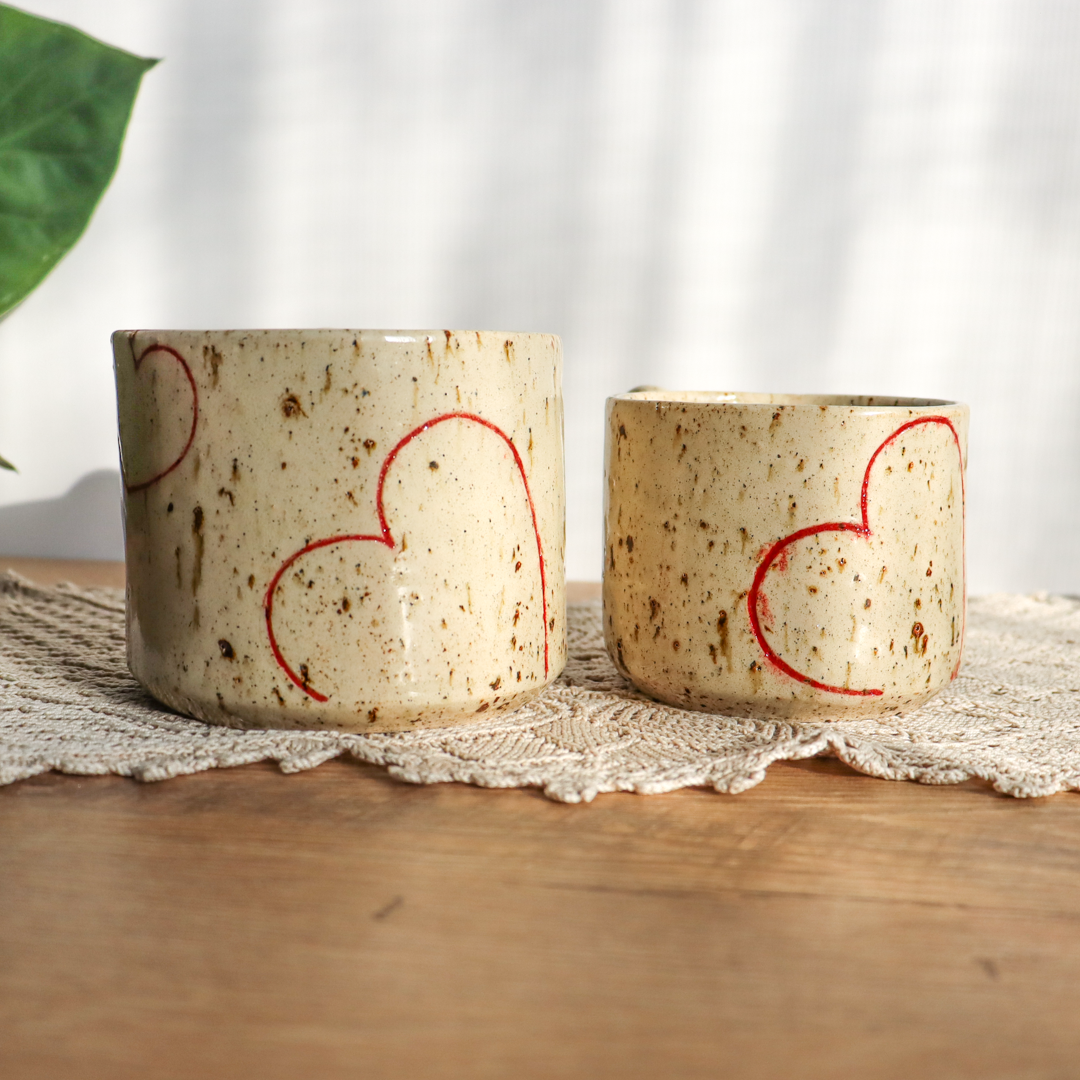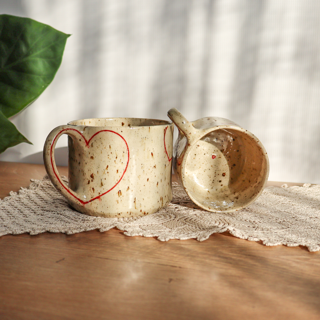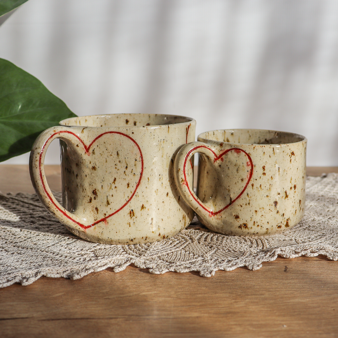 Dla fanów kawy i herbaty oraz wielbicieli oryginalnych kubków, kubek ceramiczny – Serca. Ręcznie wykonany  z jasnobeżowej gliny nakrapianej  brązowymi piegami i zdobiony dużymi konturami czerwonych serc. Kubek ma duże ucho dzięki któremu idealnie leży w dłoni, a jego wymiary o średnicy 9 cm i wysokości 7 cm dla kubka o pojemności 350 ml oraz średnicy 11 cm i wysokości 9 cm dla kubka o pojemności 600 ml pozwala na komfortowe delektowanie się ulubionym napojem.