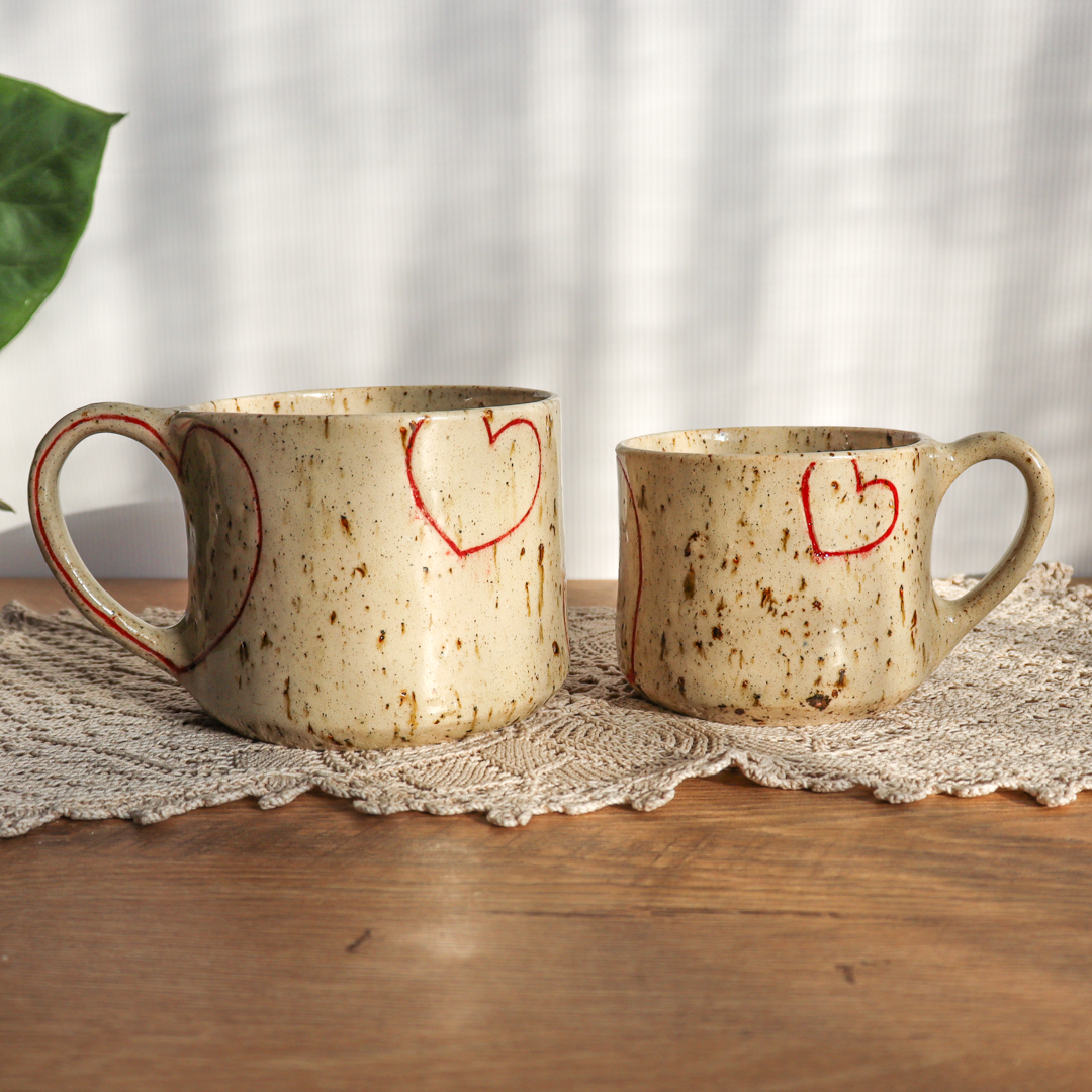 Dla prawdziwych wielbicieli oryginalnych kubków, kubek ceramiczny – Serca o pojemności 350 lub 600 ml. Ręcznie wykonany  z jasnobeżowej gliny nakrapianej  brązowymi piegami i zdobiony dużymi konturami czerwonych serc. Kubek ma duże ucho dzięki któremu idealnie leży w dłoni, a jego wymiary o średnicy 9 cm i wysokości 7 cm dla kubka o pojemności 350 ml oraz średnicy 11 cm i wysokości 9 cm dla kubka o pojemności 600 ml pozwala na komfortowe delektowanie się ulubionym napojem.