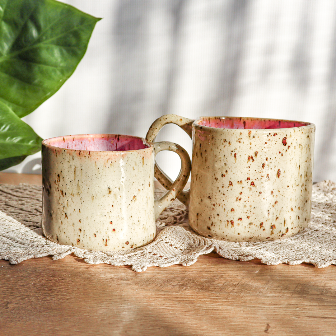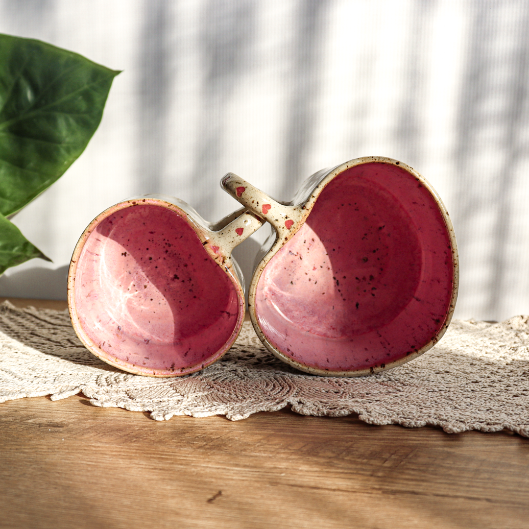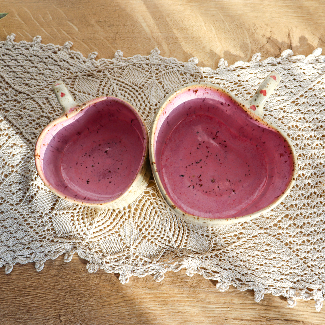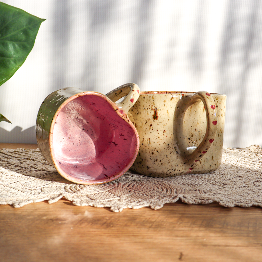 Dla prawdziwych wielbicieli oryginalnych kubeczków przedstawiamy, kubek ceramiczny – Serce o pojemności 300 lub 600 ml. Ręcznie wykonany z jasnobeżowej gliny, charakteryzującej się brązowymi piegami. Uformowany na kształt serca i pokryty w środku różowym szkliwem. Kubek ma duże ucho ozdobione małymi różowymi serduszkami, a jego wymiary o średnicy 9 cm i wysokości 7 cm dla kubka o pojemności 300 ml oraz średnicy 11 cm i wysokości 9 cm dla kubka o pojemności 600 ml pozwala na komfortowe delektowanie się ulubionym napojem.