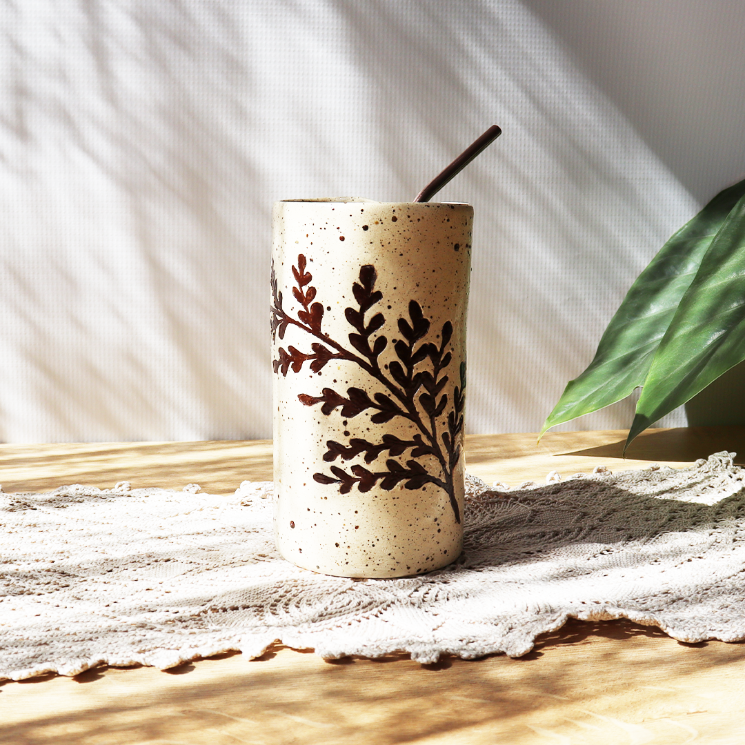 Idealny do utrzymywania prawidłowych poziomów nawodnienia kubek ceramiczny ze słomką 450ml – Gałązka. Wyprofilowany na metalową słomkę zawartą w zestawie, wykonany z kremowej piegowatej gliny z wzorem gałązki w brązowym kolorze. Perfekcyjny na wodę, mrożone napoje lub drinki.