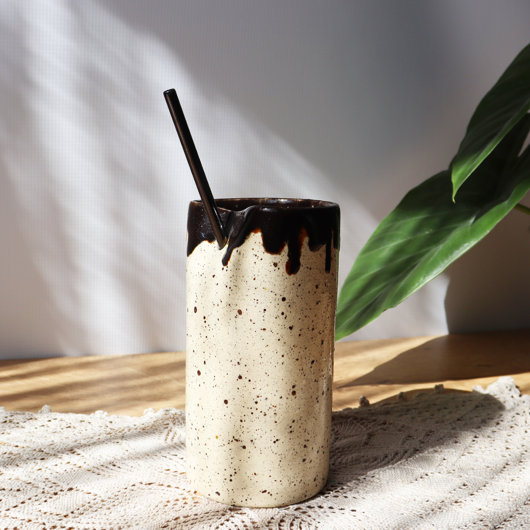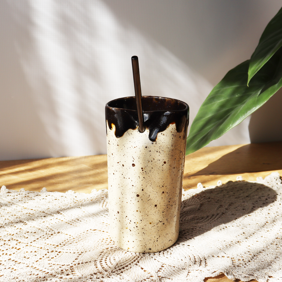 Kubek ceramiczny ze słomką 450ml – Polewa Czekoladowa, wykonany z kremowej piegowatej gliny, na krawędzi ozdobiony ciemnobrązowym szkliwem przypominającym polewę czekoladową. W zestawie dołączona metalowa słomka. Ręcznie wykonany z dbałością o każdy szczegół, wyprofilowany, tak aby asekurować słomkę w komfortowy sposób. Średnica 8,5cm i wysokość 14cm tworzą poręczne naczynie perfekcyjne w czasie letniego odpoczynku.